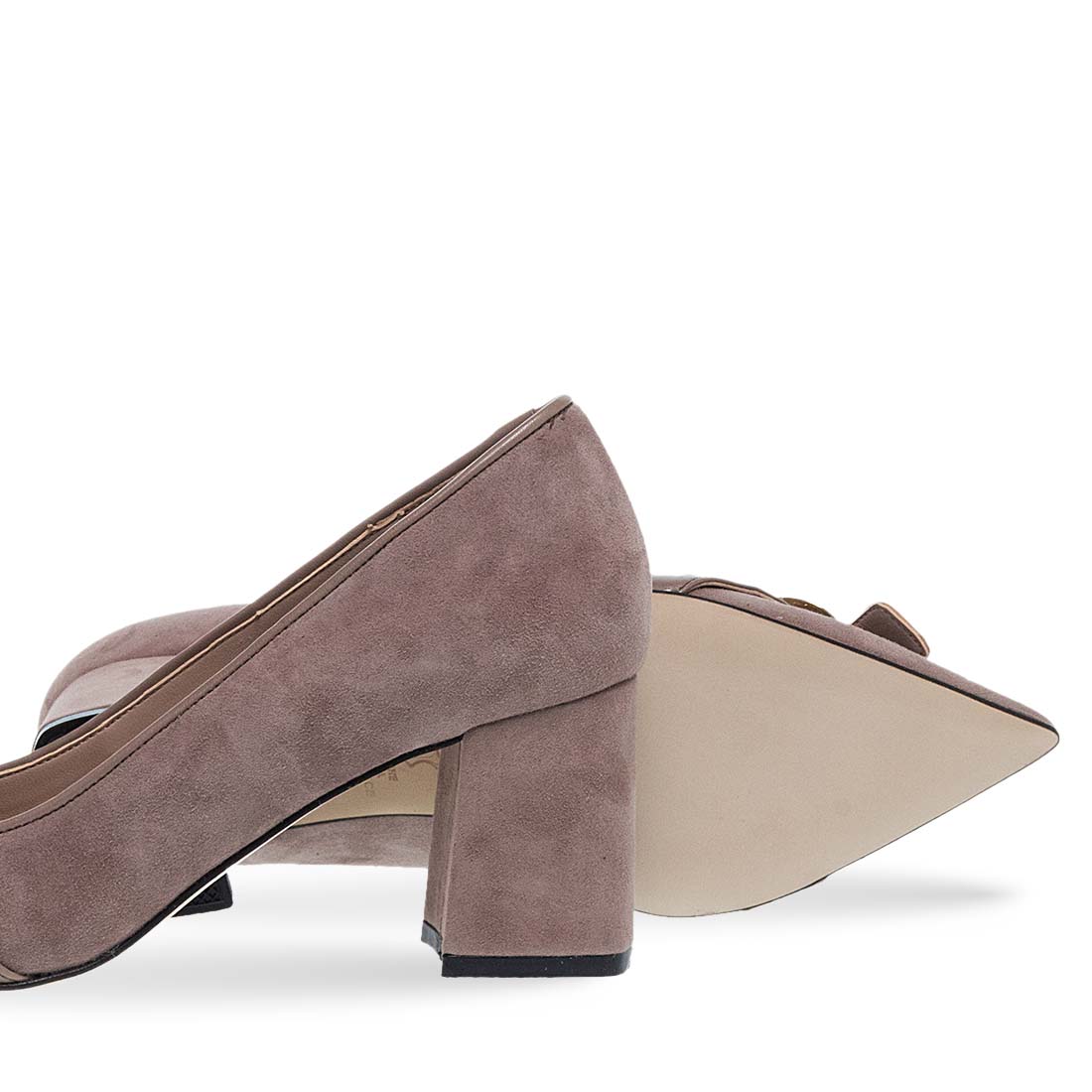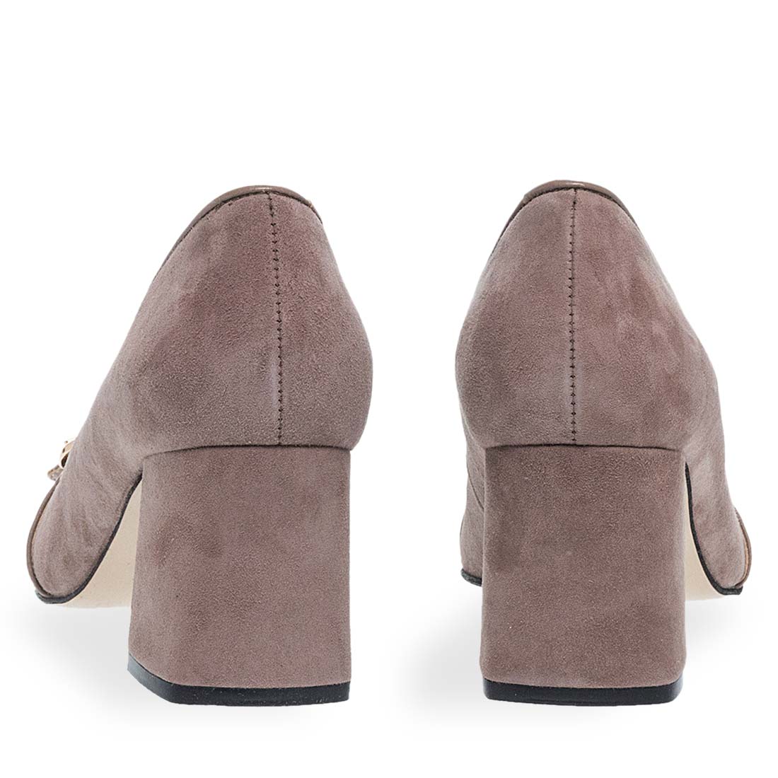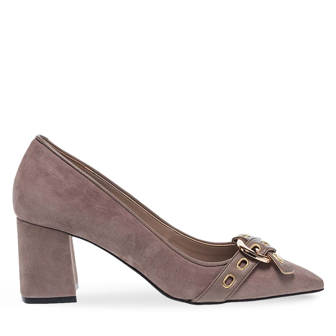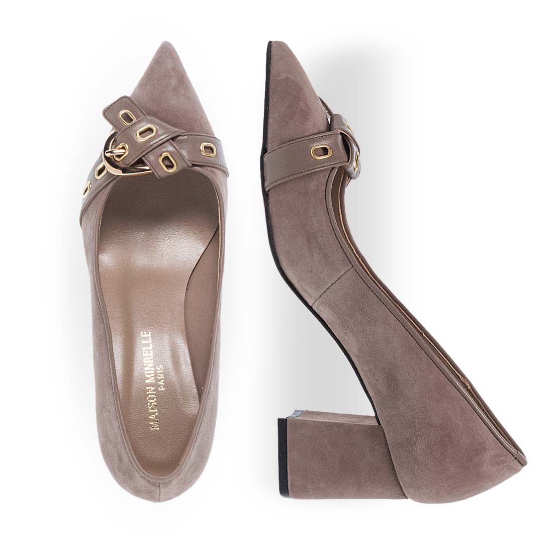 Women''s leather pumps by Maison Minrelle. Brown suede pump with decorative gold buckle, elegant and distinctive.