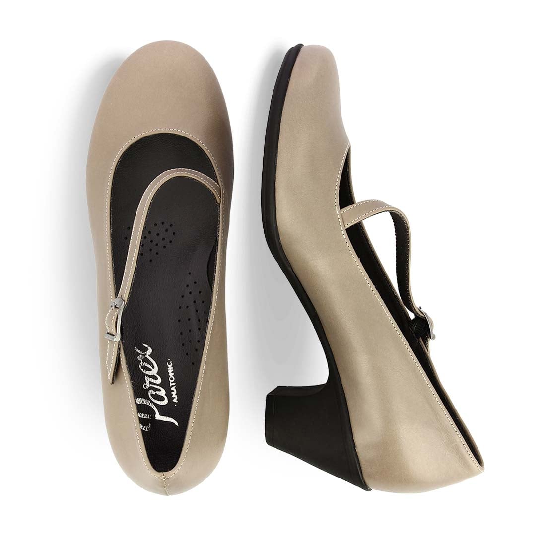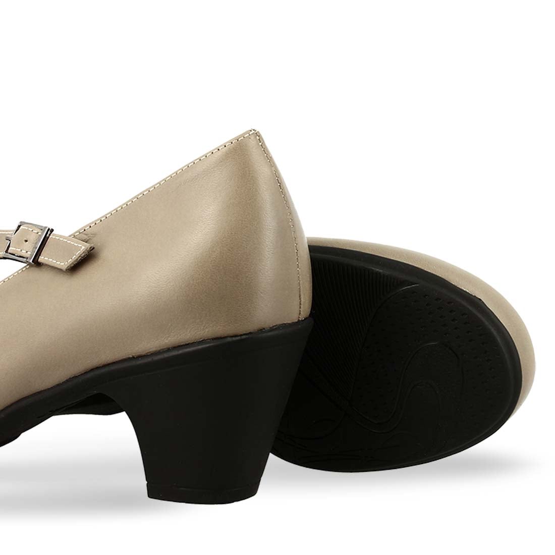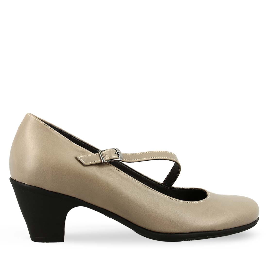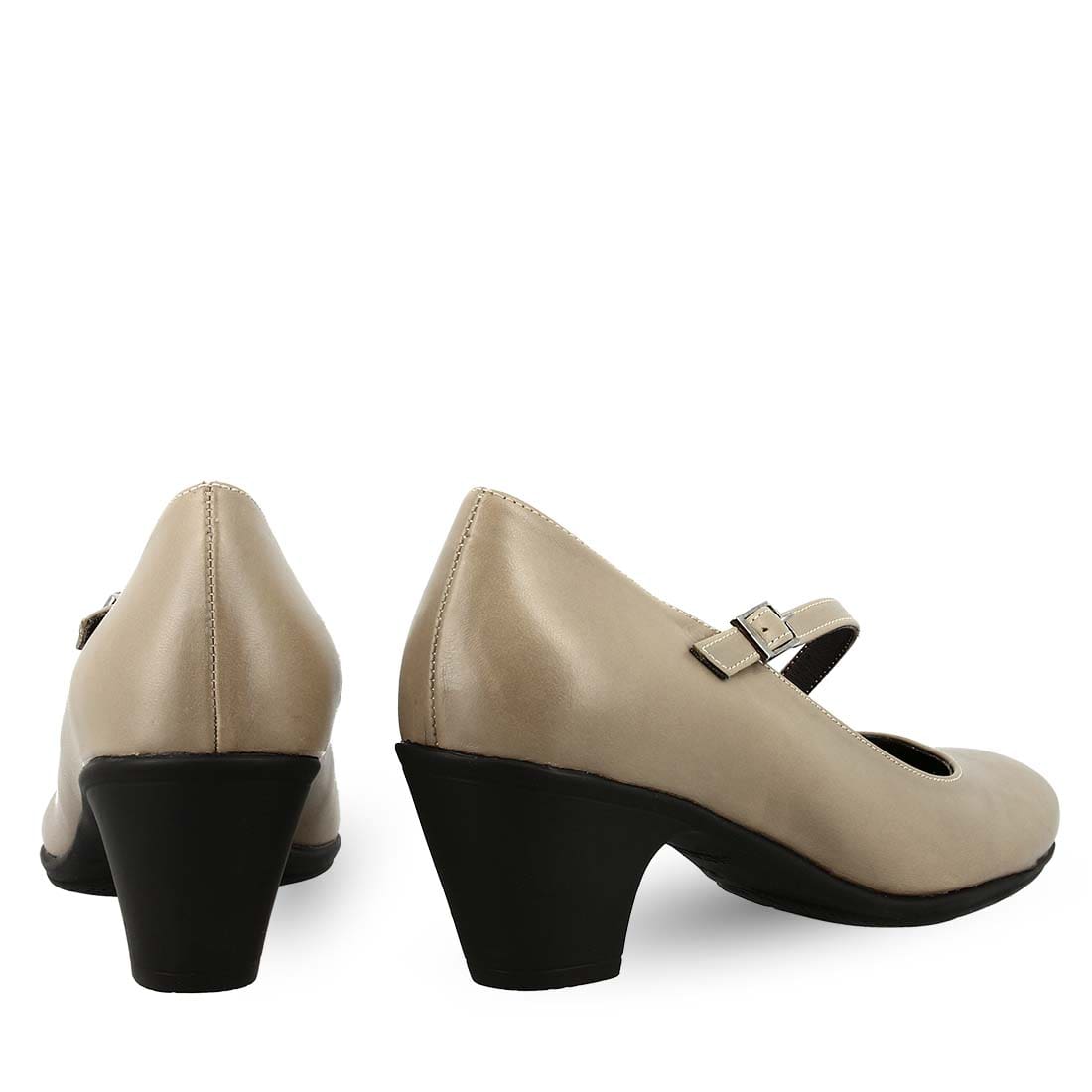 These women''s leather pumps with strap by Parex have a rounded nose and are made of high quality leather and low heel. It fastens with a metallic buckle on the side.