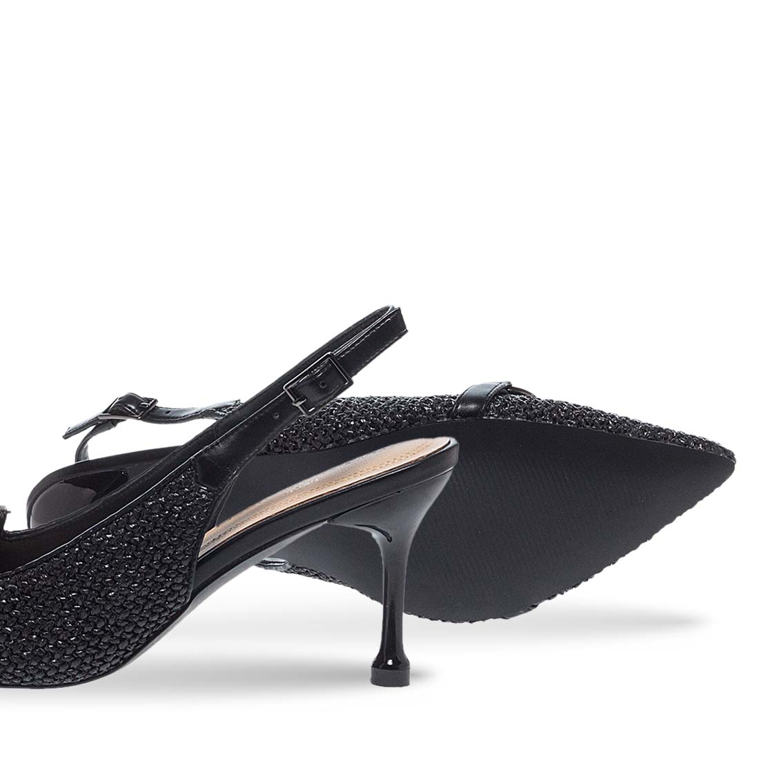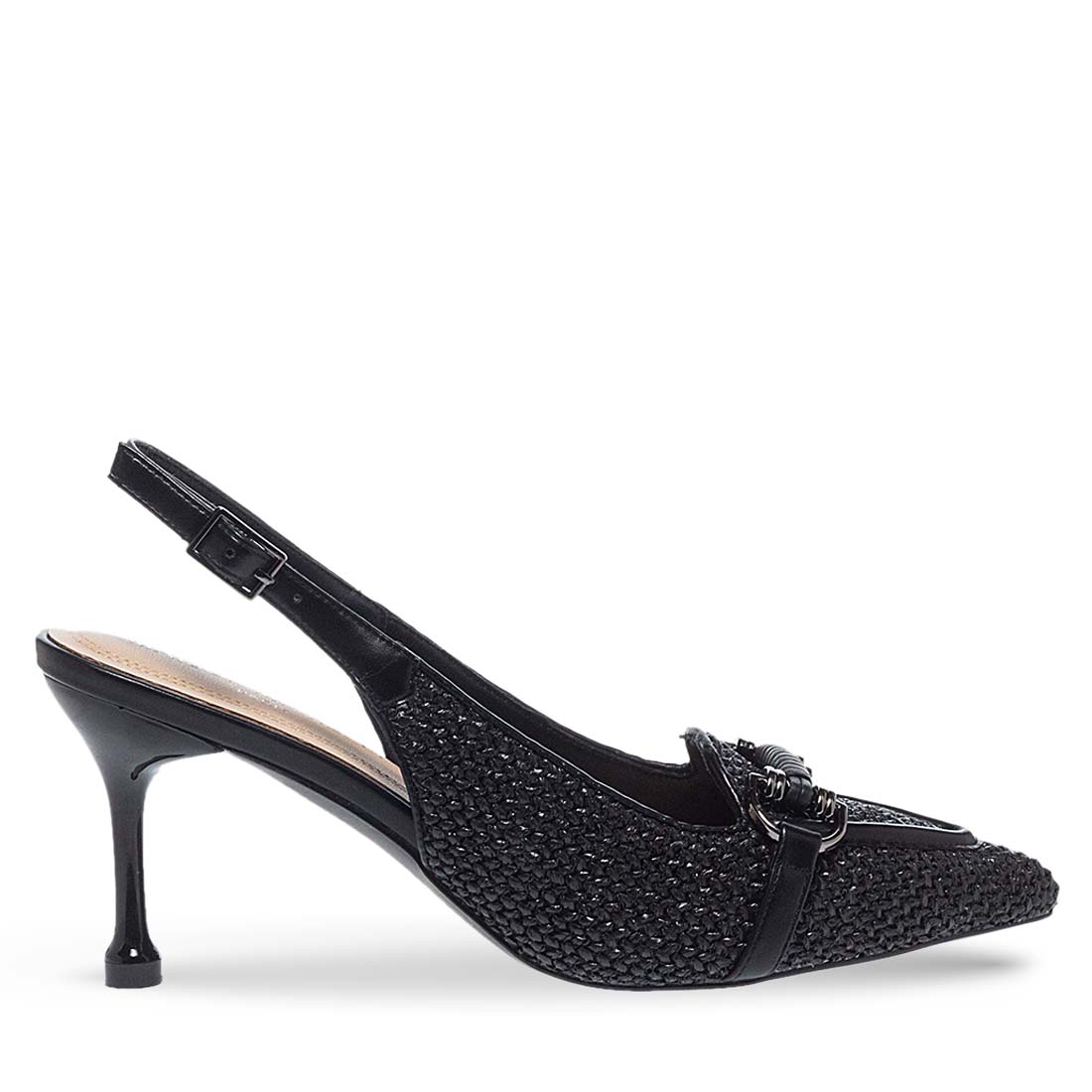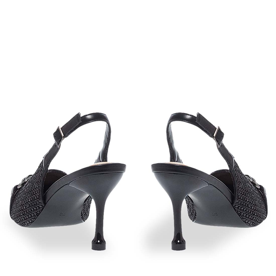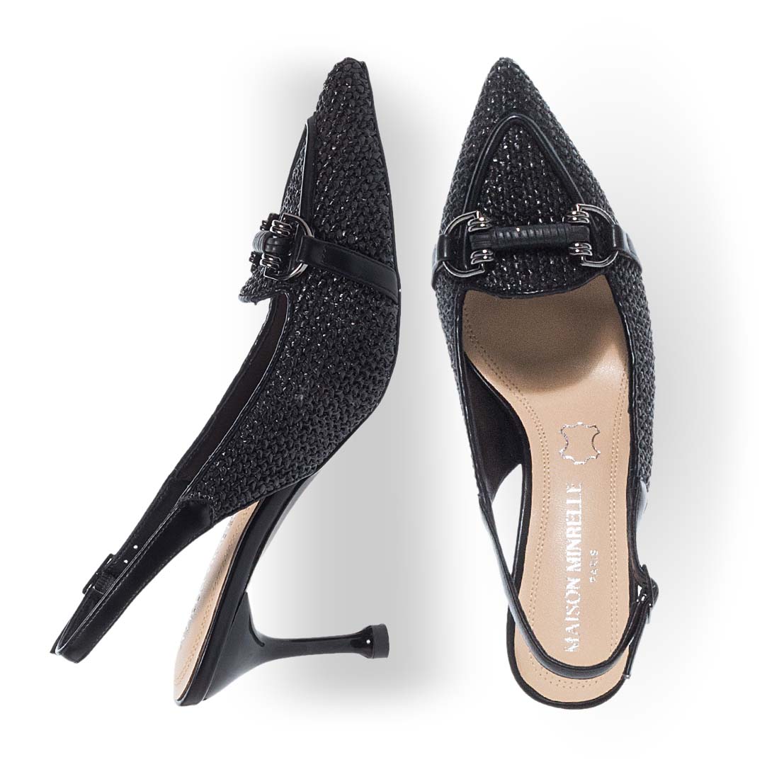 Fabulous slingback pumps by Maison Minrelle. The upper part is crafted from straw. Ideal choice to upgrade your office look and keep your balance all day. Ankle strap fastening.