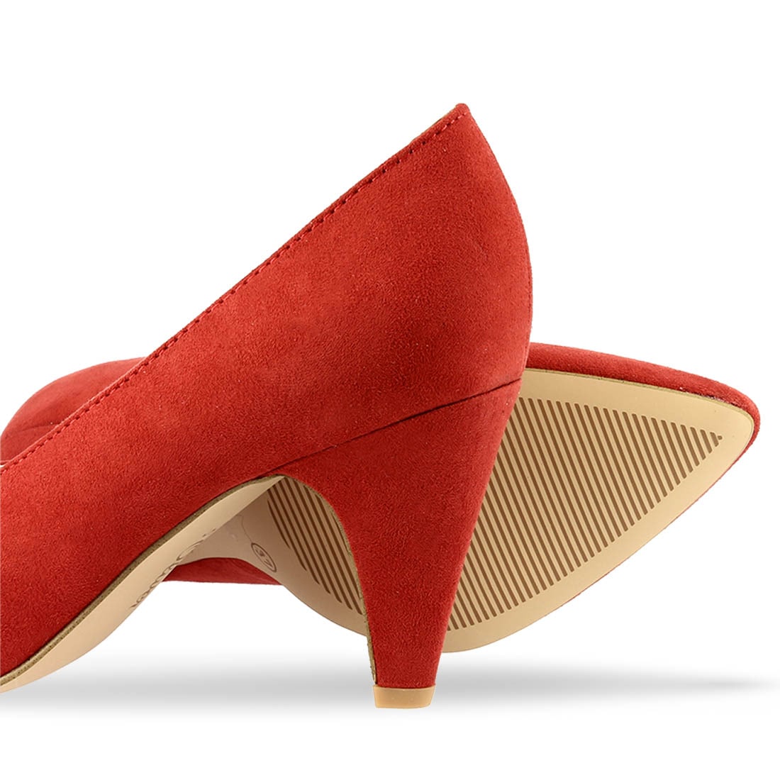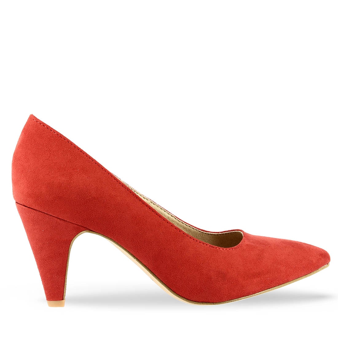 Pointed toe pumps in timeless design crafted from suede textile. Soft slipsole, non-slip sole and low classic heel. Available in black and red color.