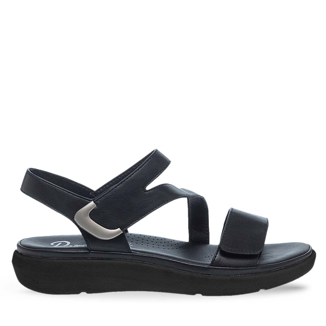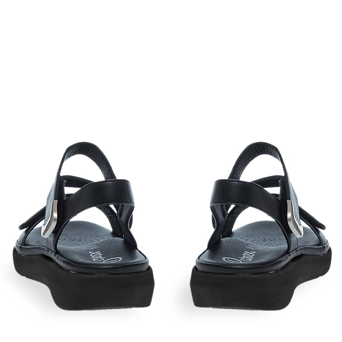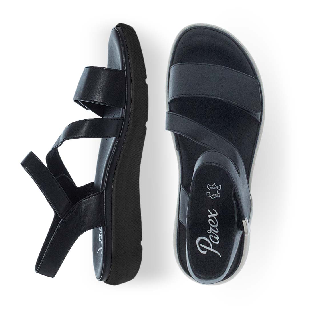 Monochrome comfort sandals by Parex. Velcro closure. Leather insole. Ideal to use day to night. Add this timeless and comfortable design on your footwear essentials.