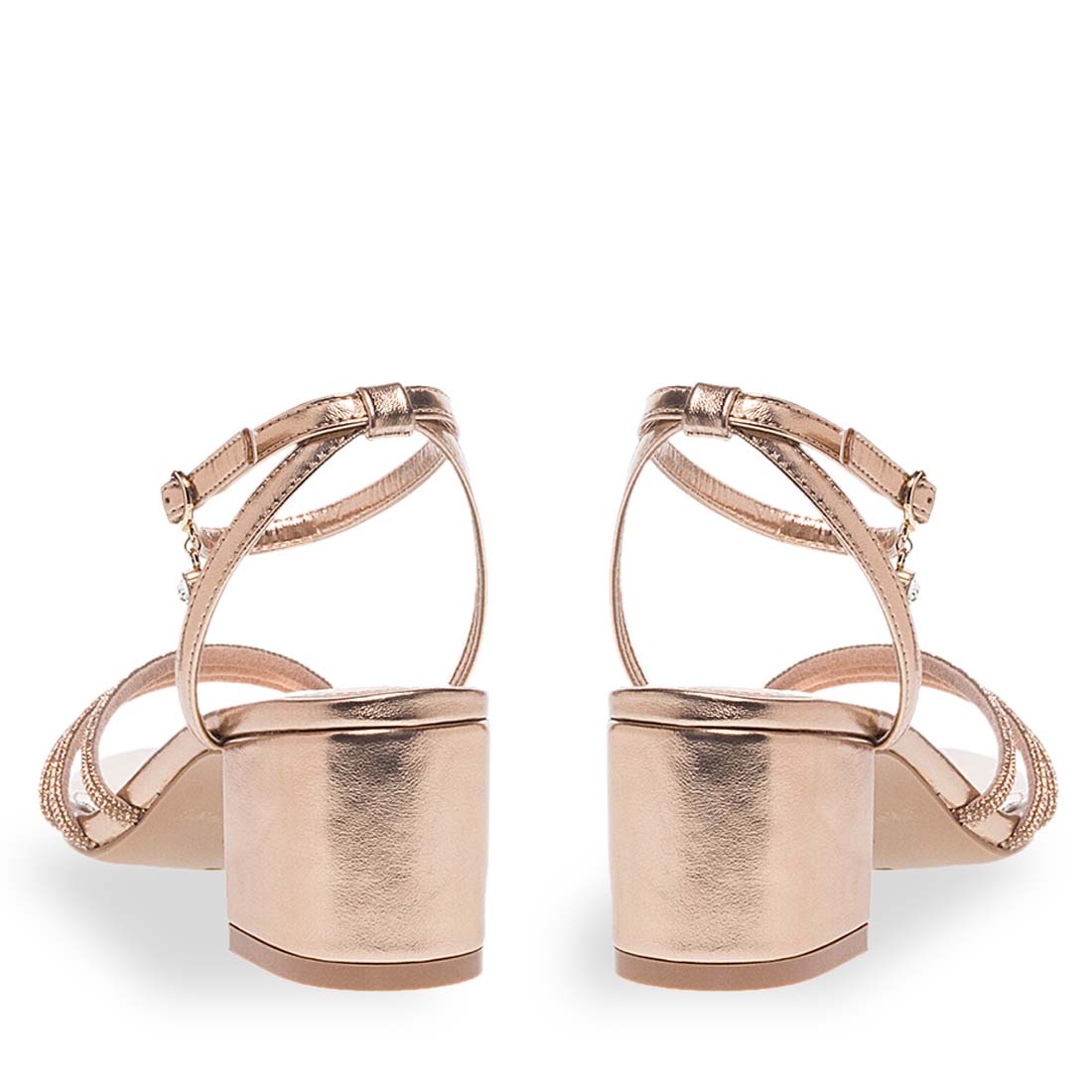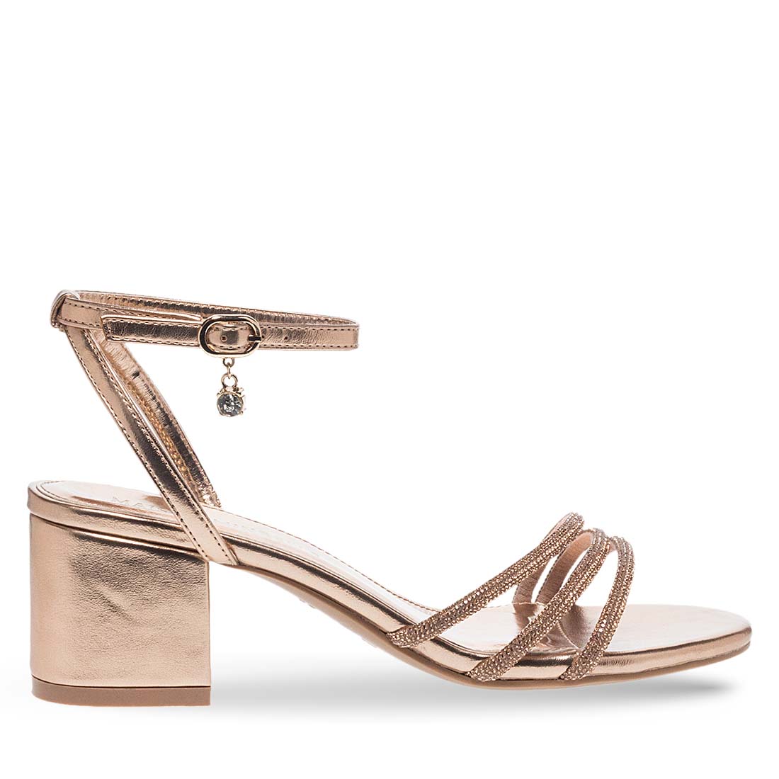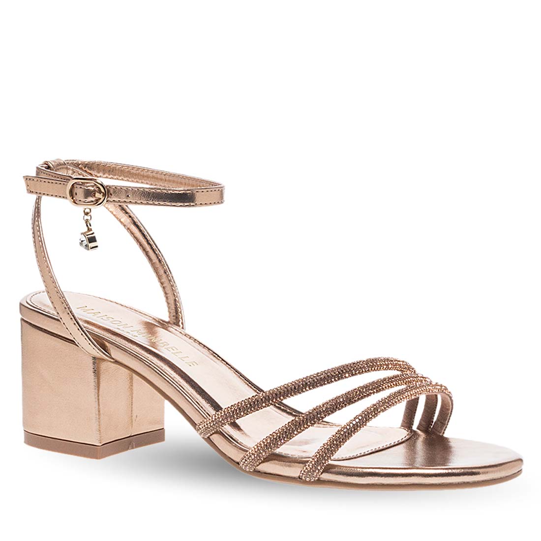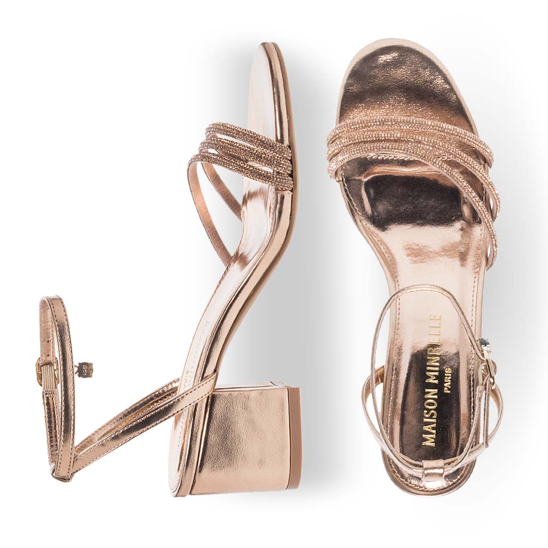 Women''s sandals by Maison Minrelle. Cross strass straps at the ankle and a zip closure at the back of the leg. Short block heel with metallic detail and soft footbed for comfortable and stylish steps. Modern design.