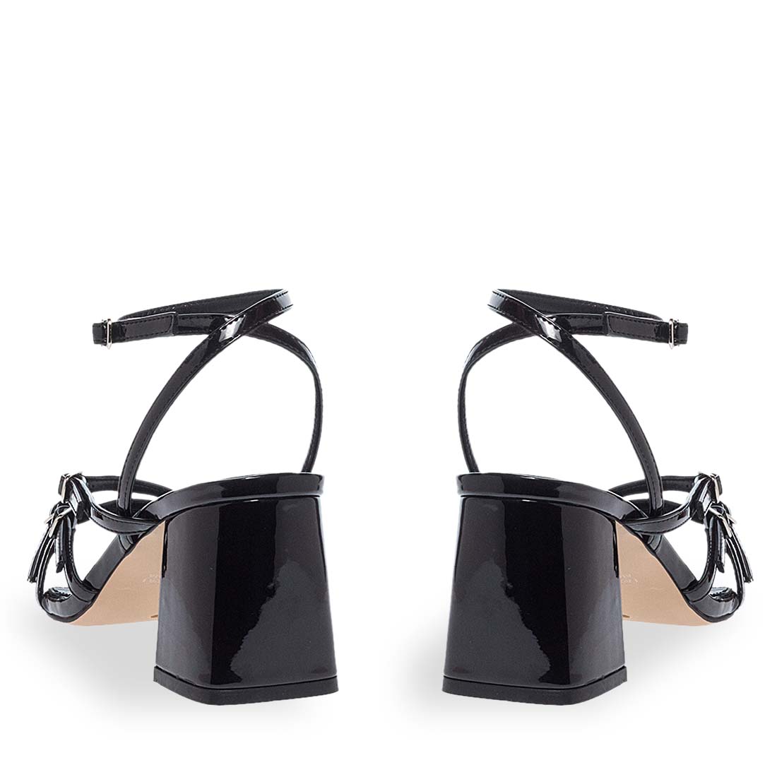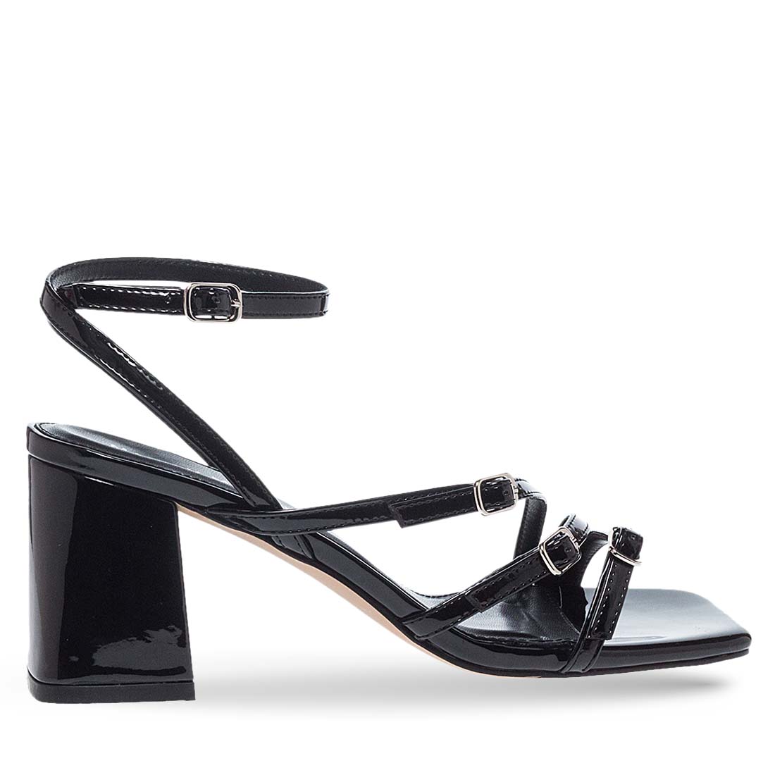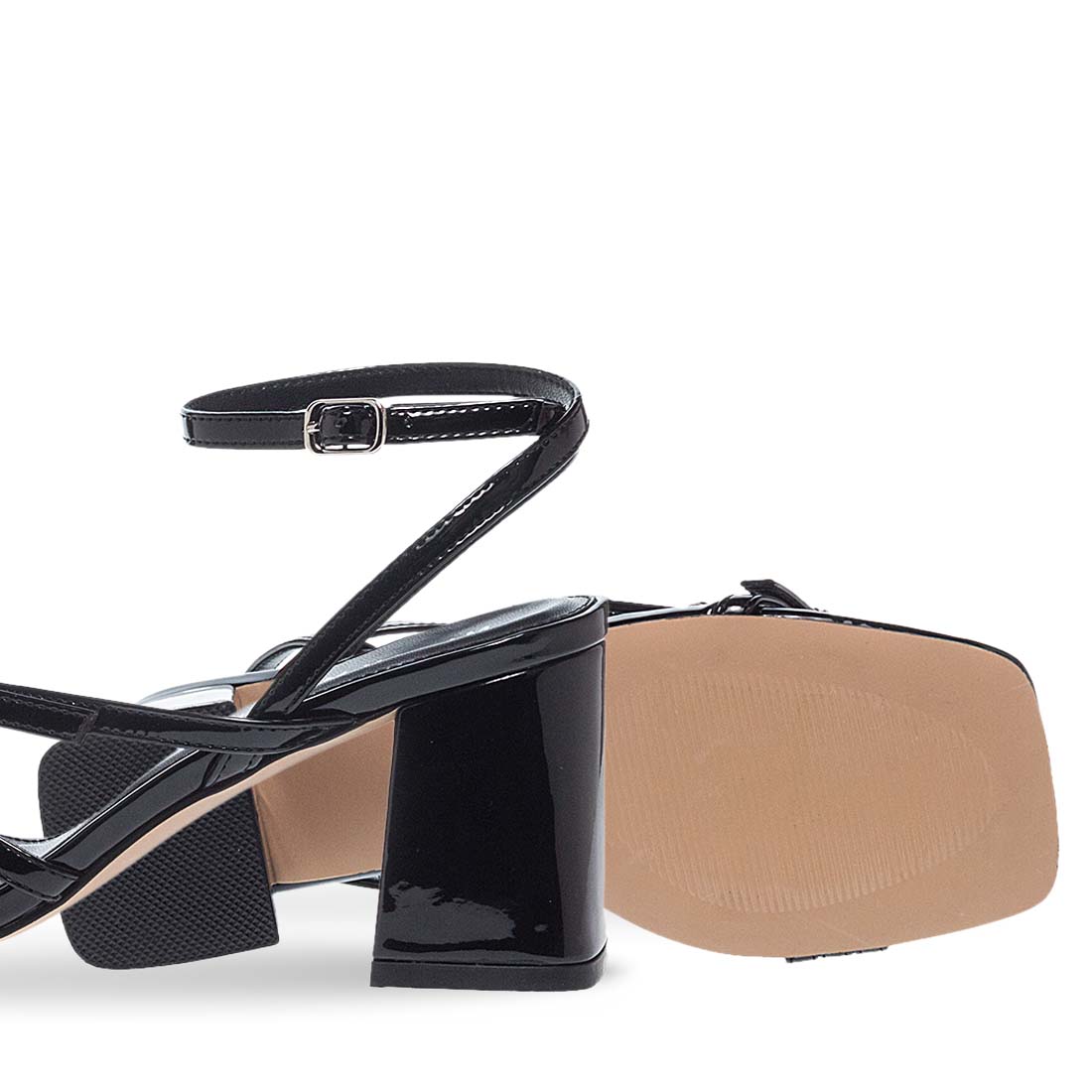 Modern strappy heeled sandals with slingback ankle strap. Block heel. The upper part is crafted from faux leather. Leather insole. This design will upgrade your look .