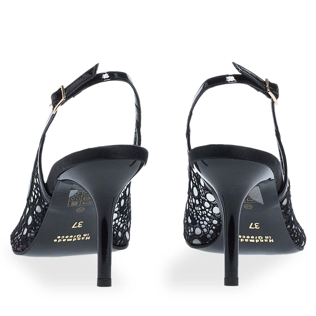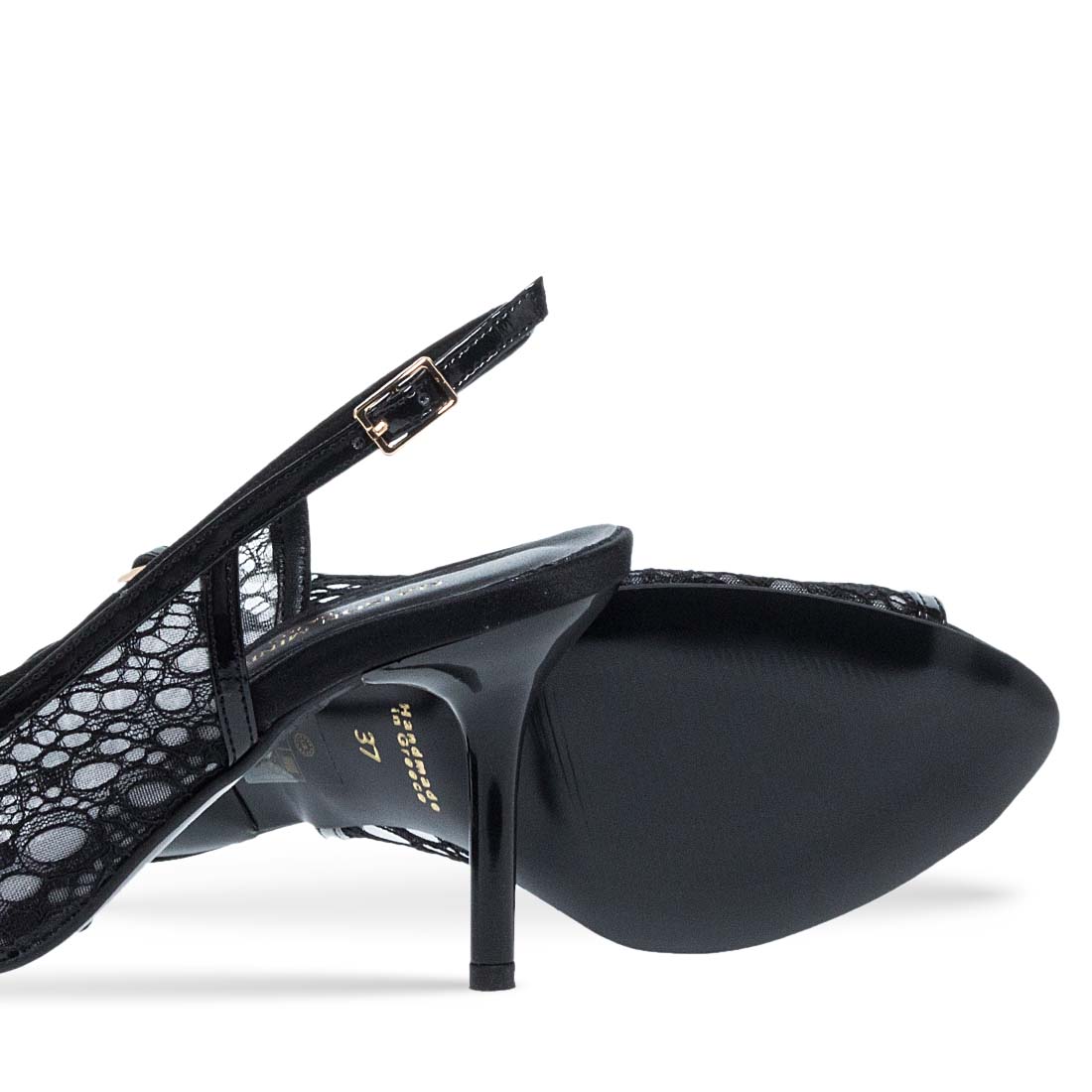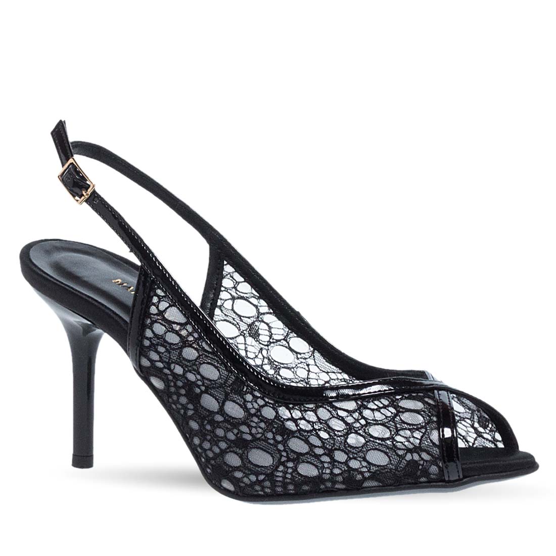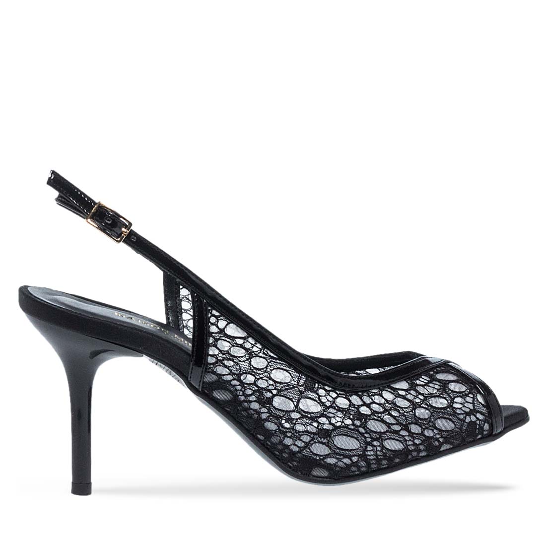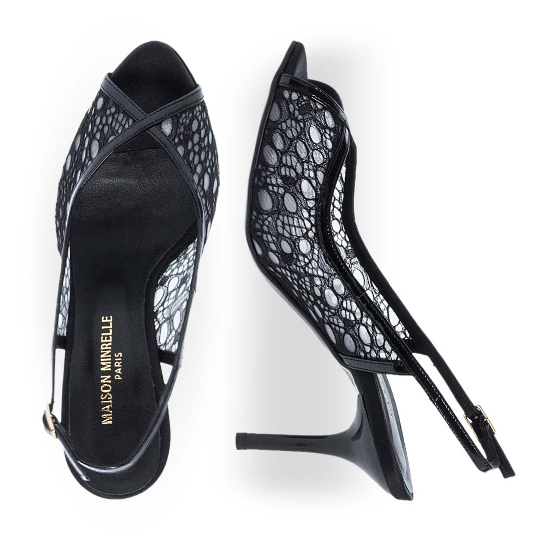 Women''s heeled sandals Maison Minrelle. Black lace sandal with mesh details, perfect for elegant evening looks.