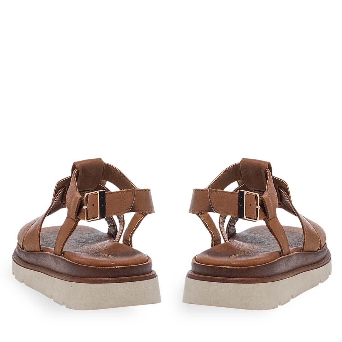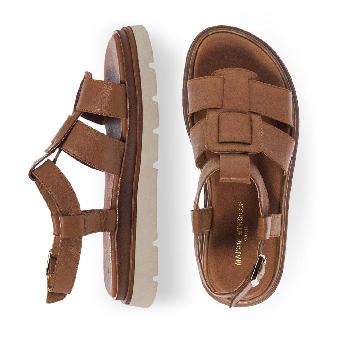 Comfortable leather sandals by Maison Minrelle with chunky, slip-free sole and visible seams. Elasticated straps. Rubber outsole. Update your look with these modern sandals.