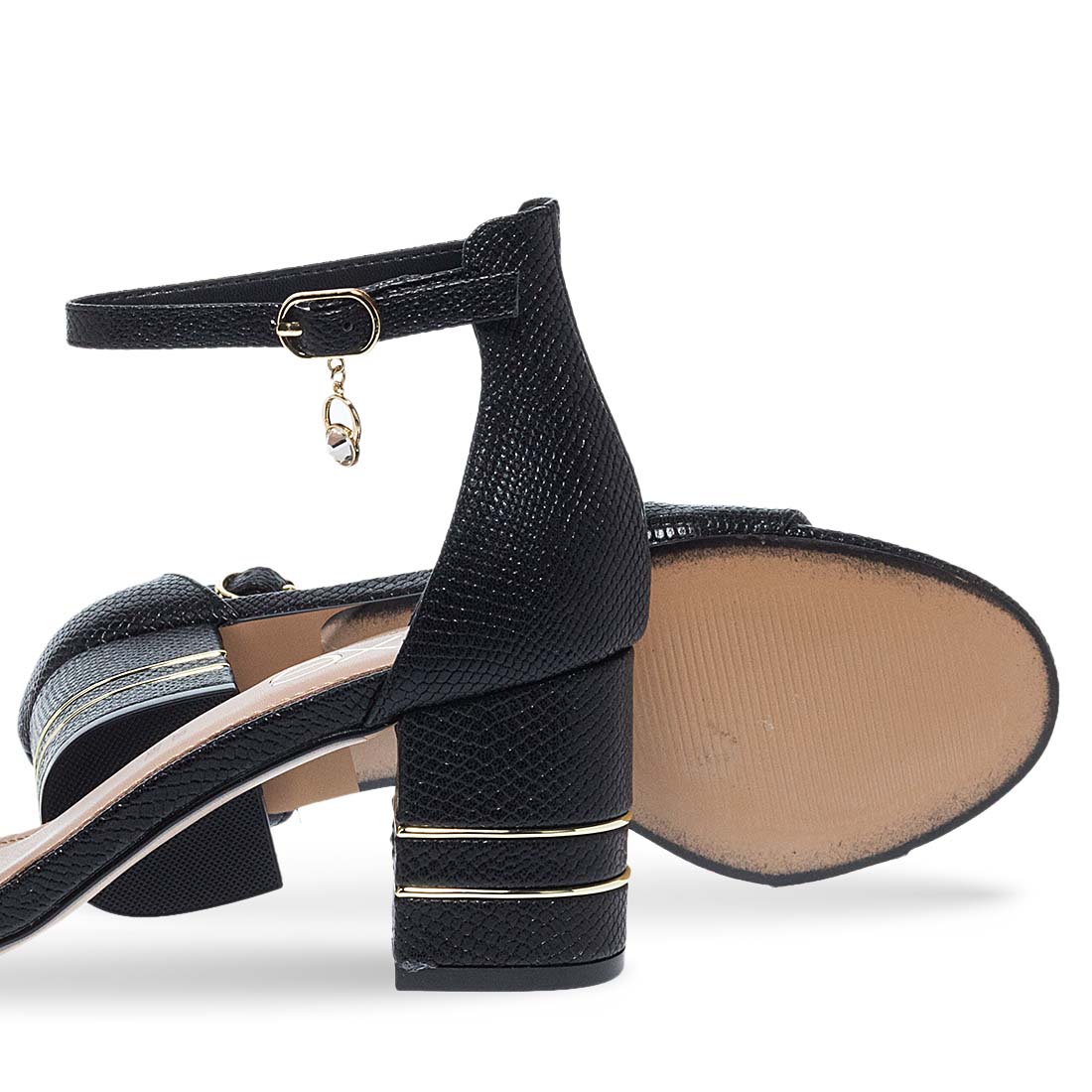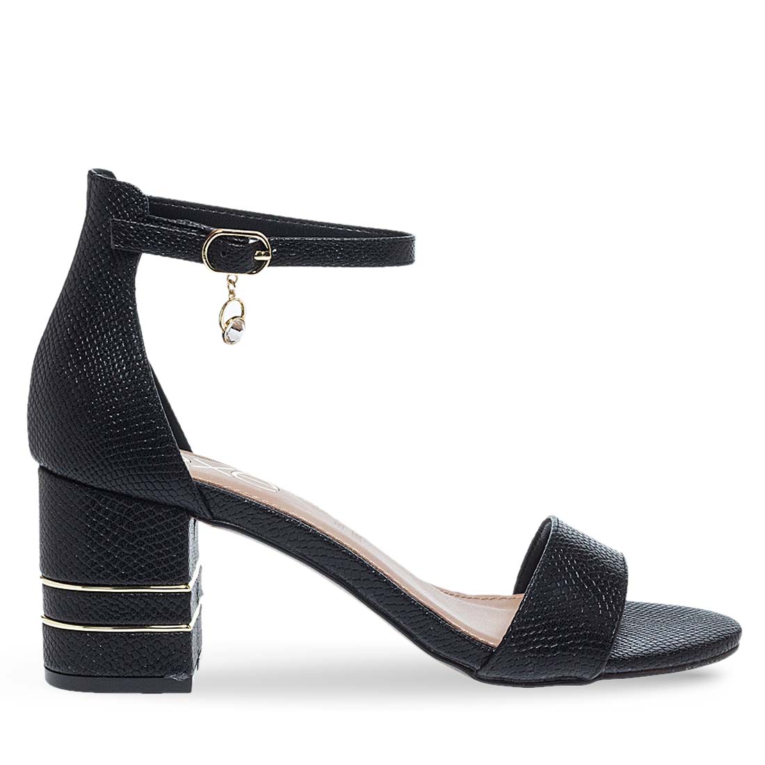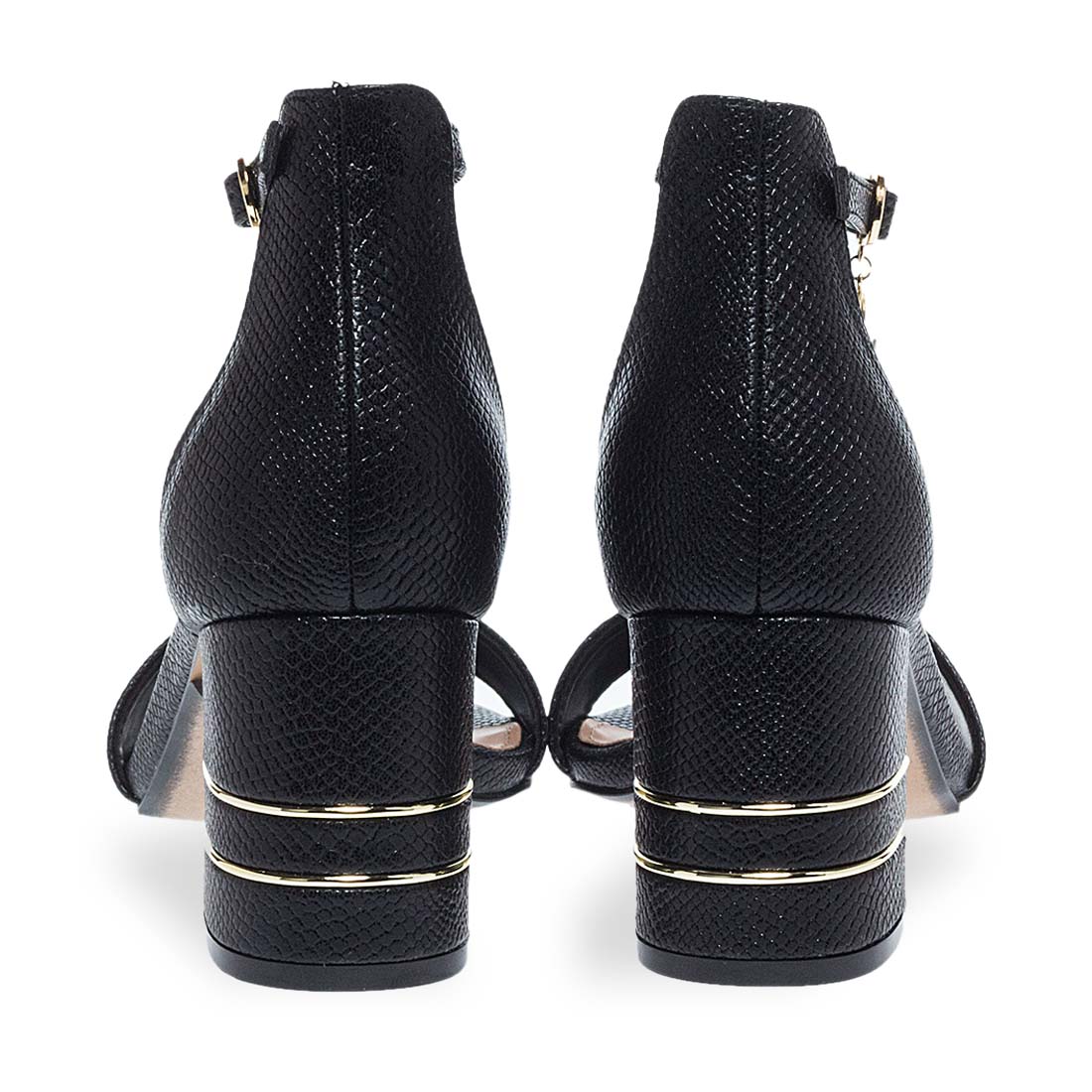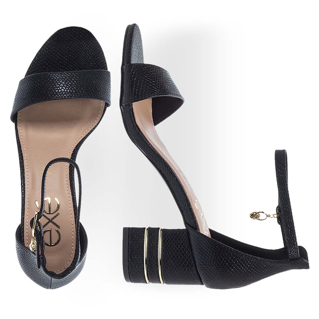 Black modern sandals by Exe. Made of faux leather. Available in black color with snake print and metallic detail on the heel. Buckle strap fastening at the ankle. Soft footbed and durable sole with block heel. These women''s heeled sandals by new Exe collection are the ideal choice for confident steps