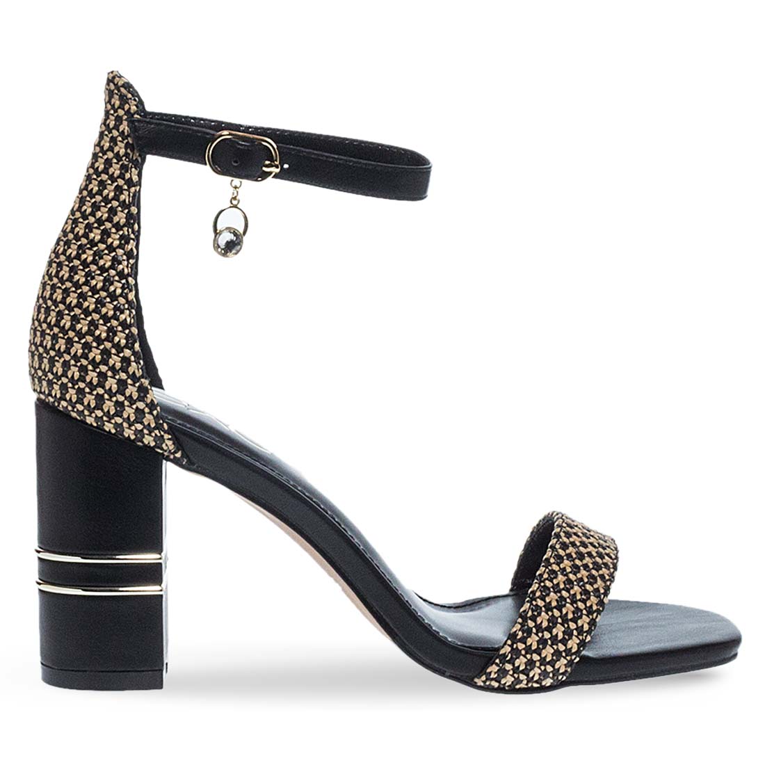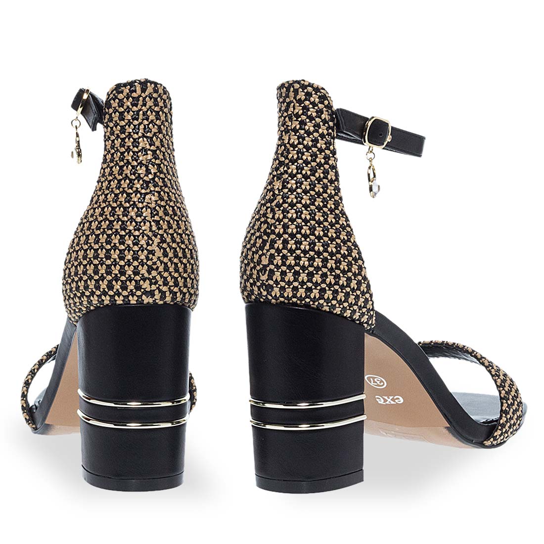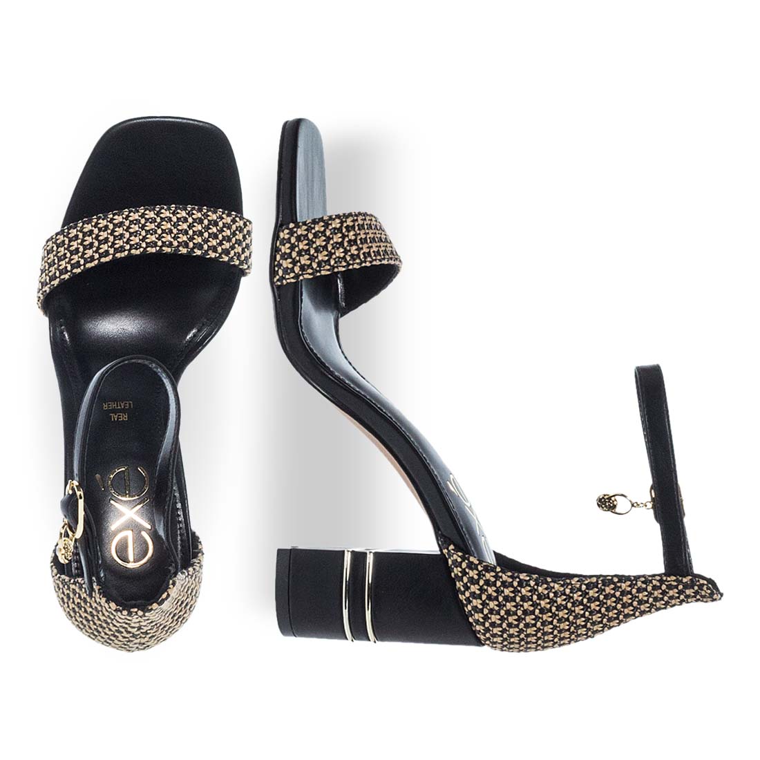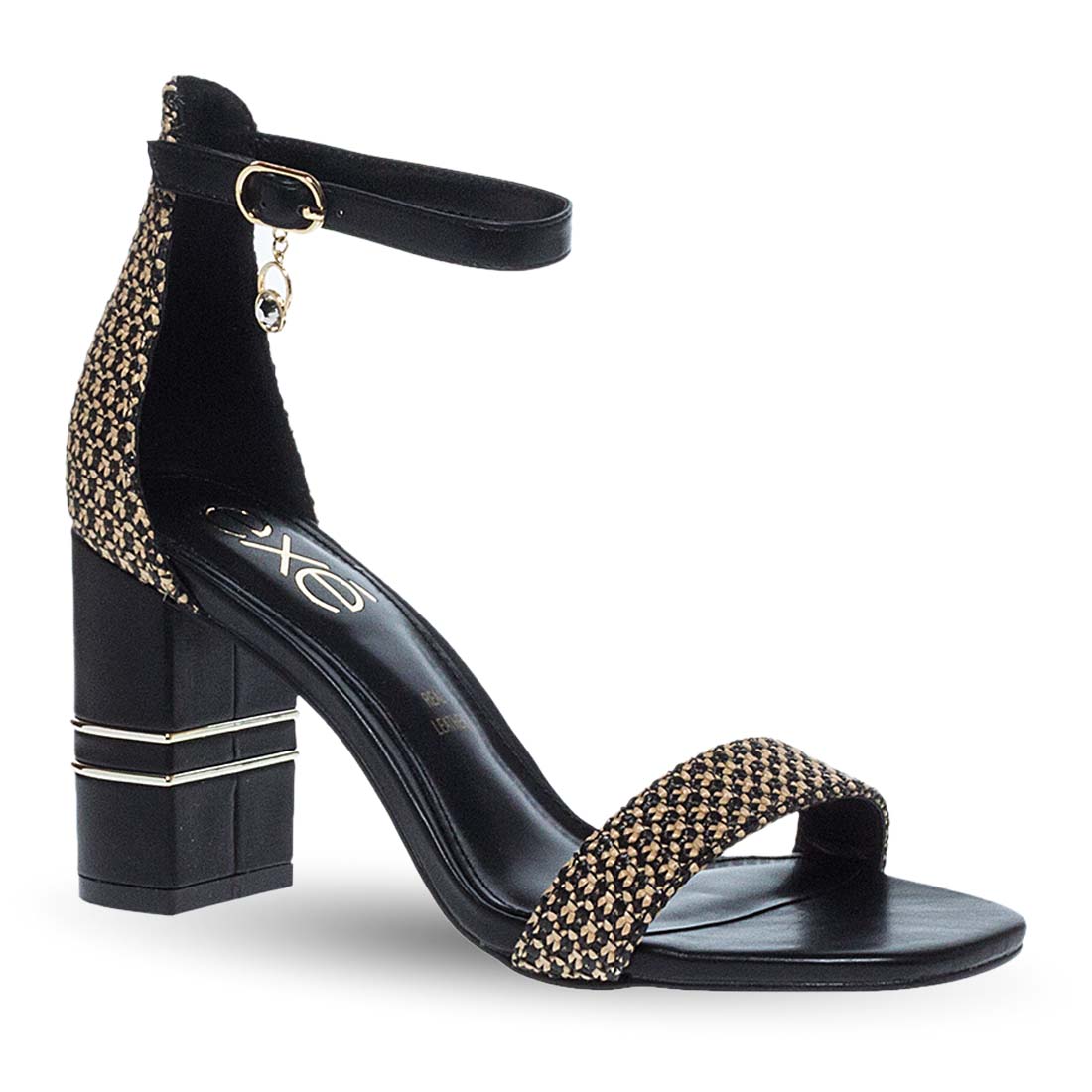 High heeled sandals Exe for women .Black block heeled sandals with gold tone details and diamond detail. Glamorous shoes to wear at your summer events! Ankle strap fastening. Update your look with these modern sandals by Exe.