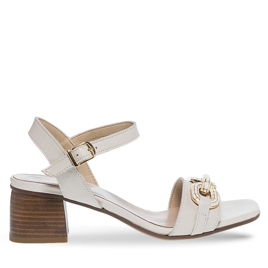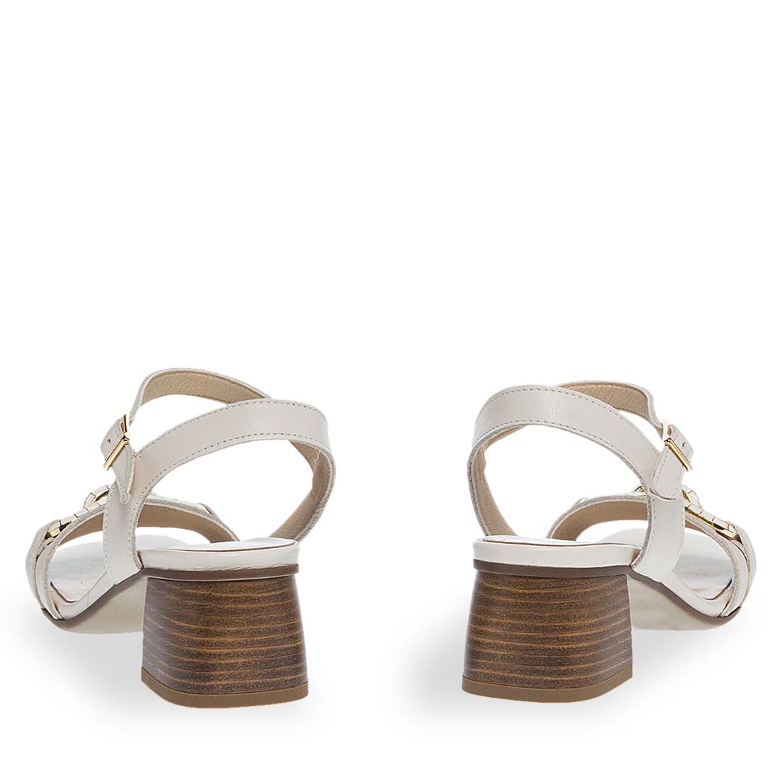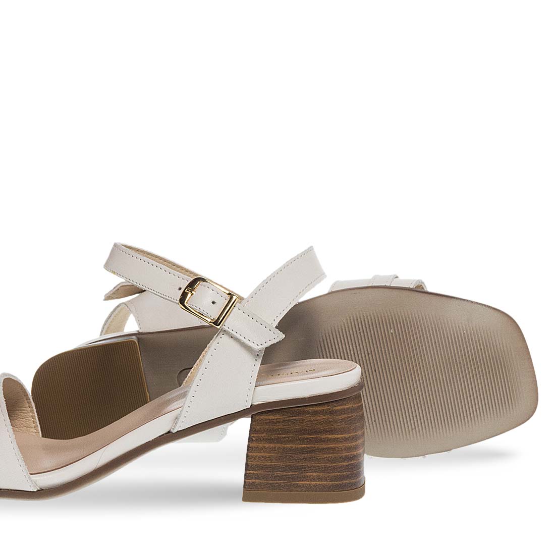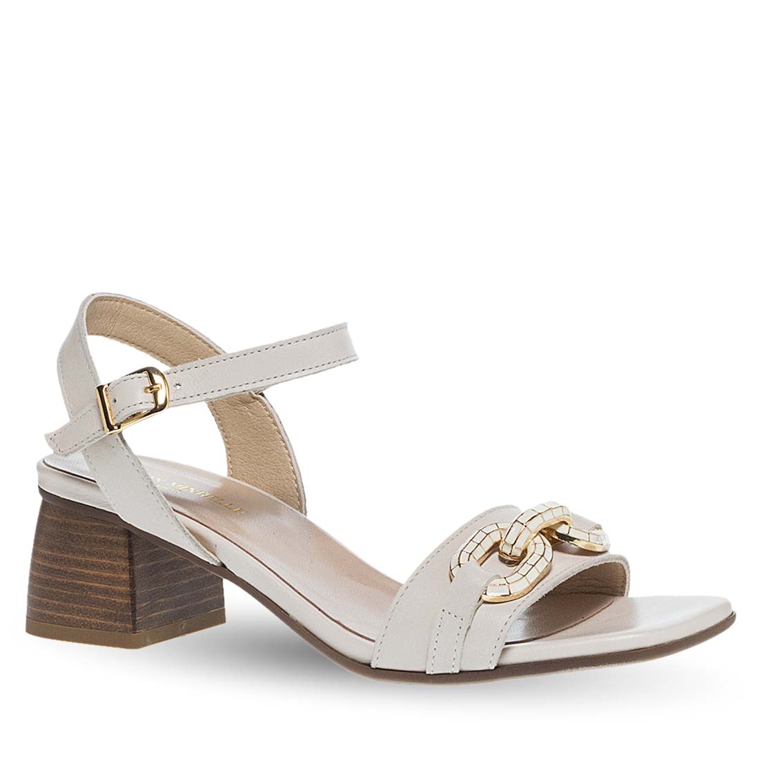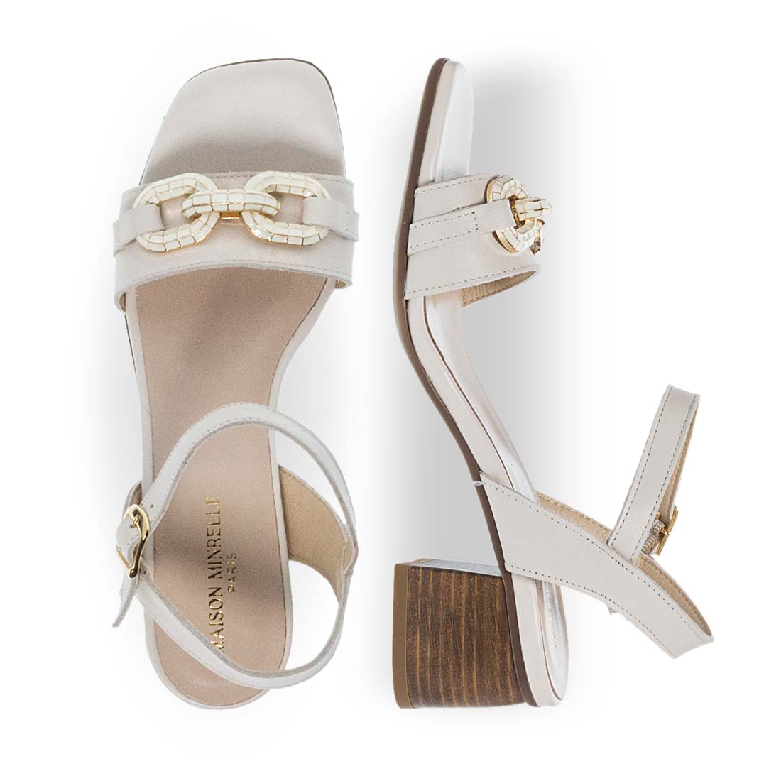 Fashionable sandals Maison Minrelle with bukle strap fastening. They have a block heel for steady steps, a strap that hugs the ankle and a strap on the upper with metal detail. Comfortable insole. Modern design.