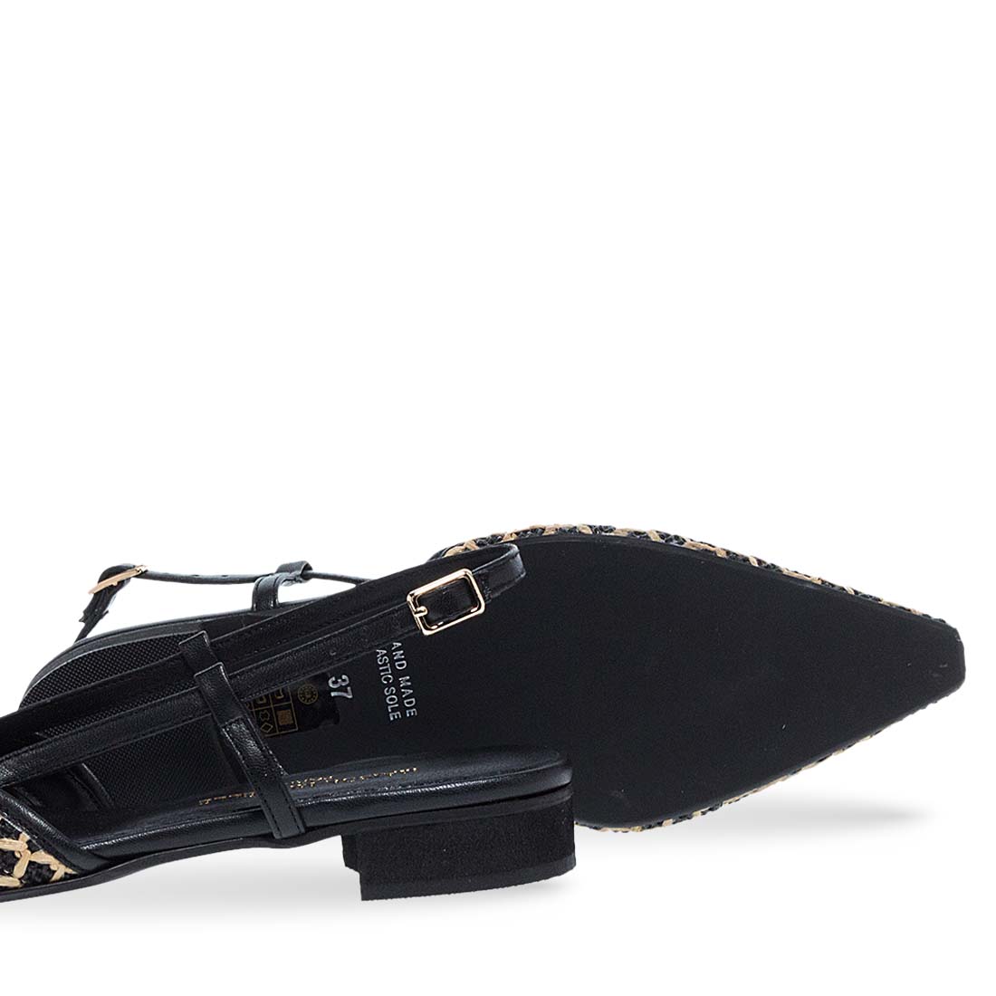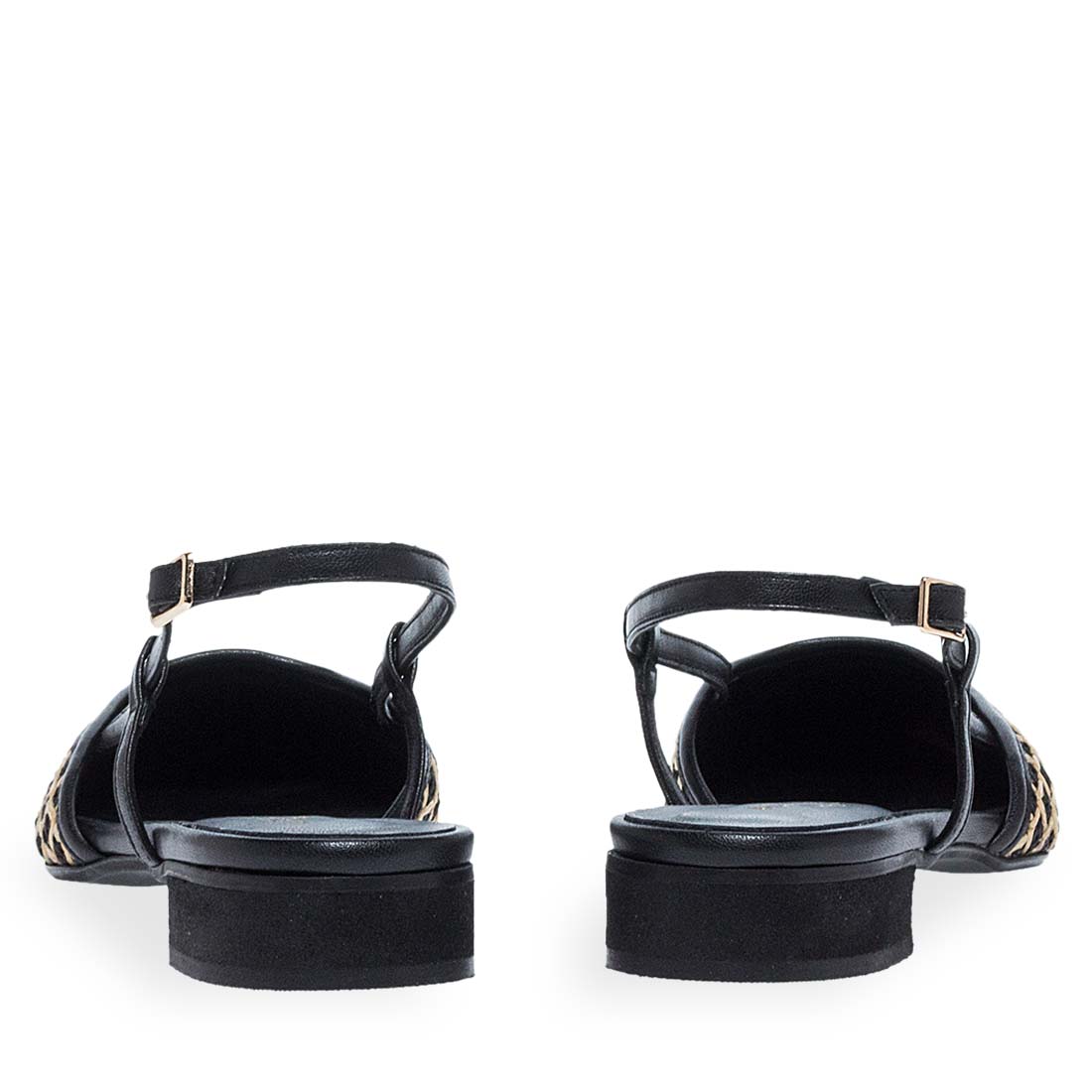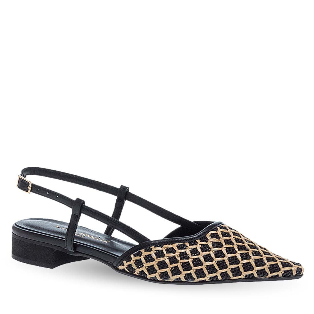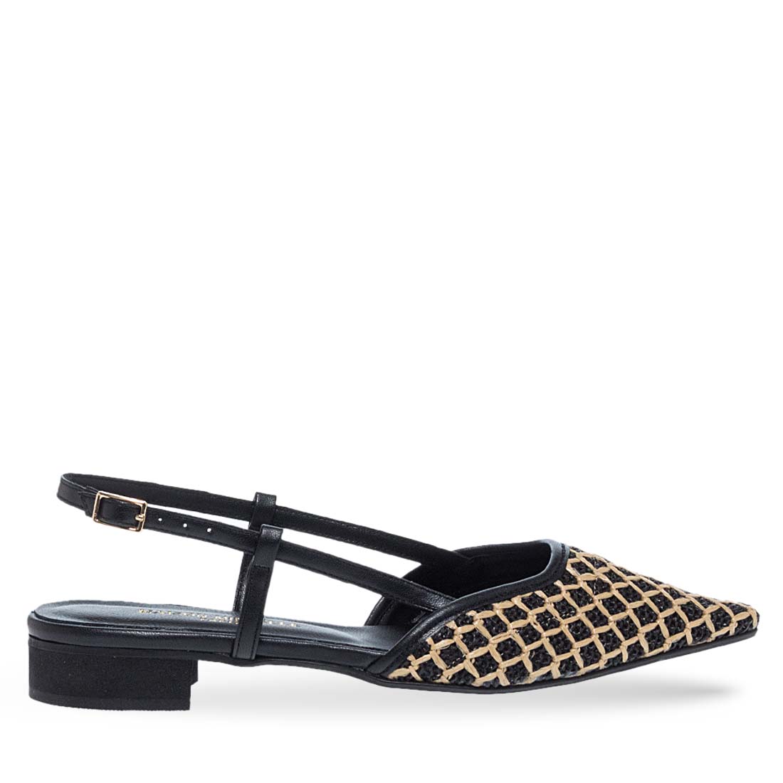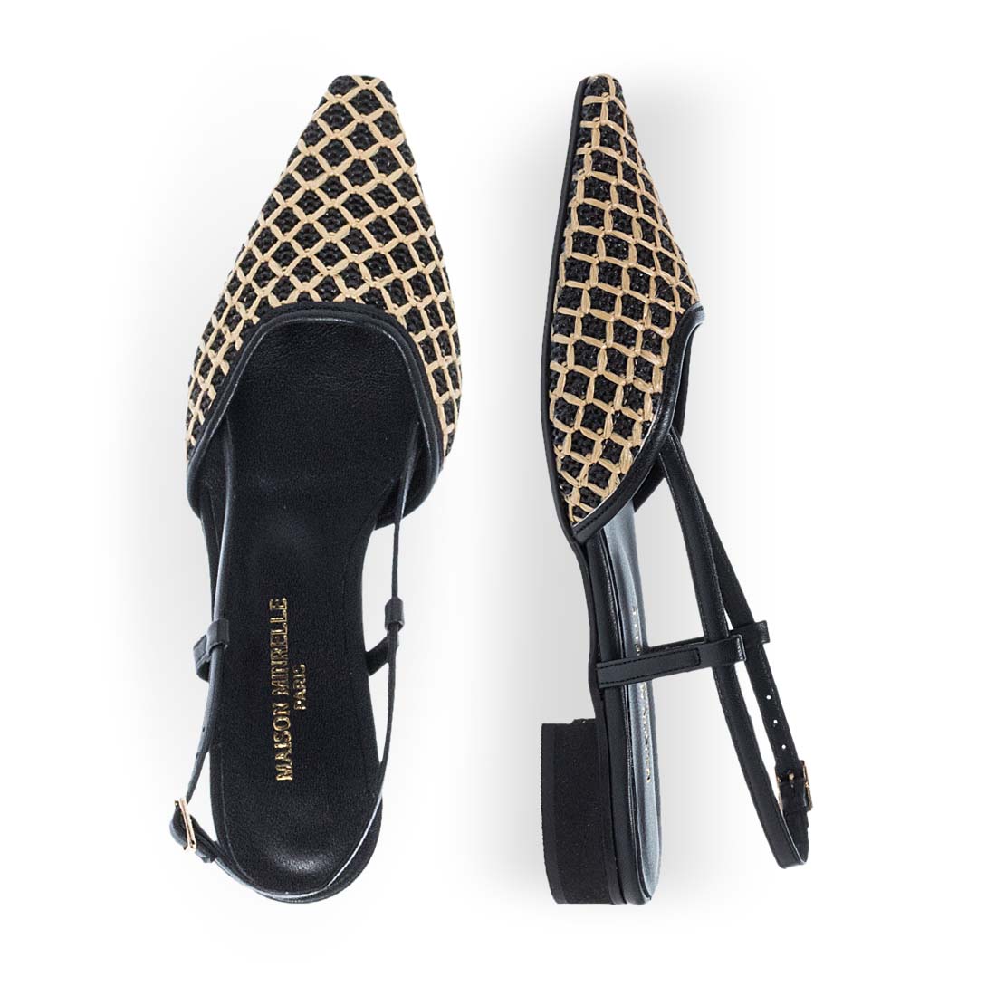 Women''s sandals Maison Minrelle. Elegant flat with pointed toe and straw weave in black and beige, ideal for daily wear.