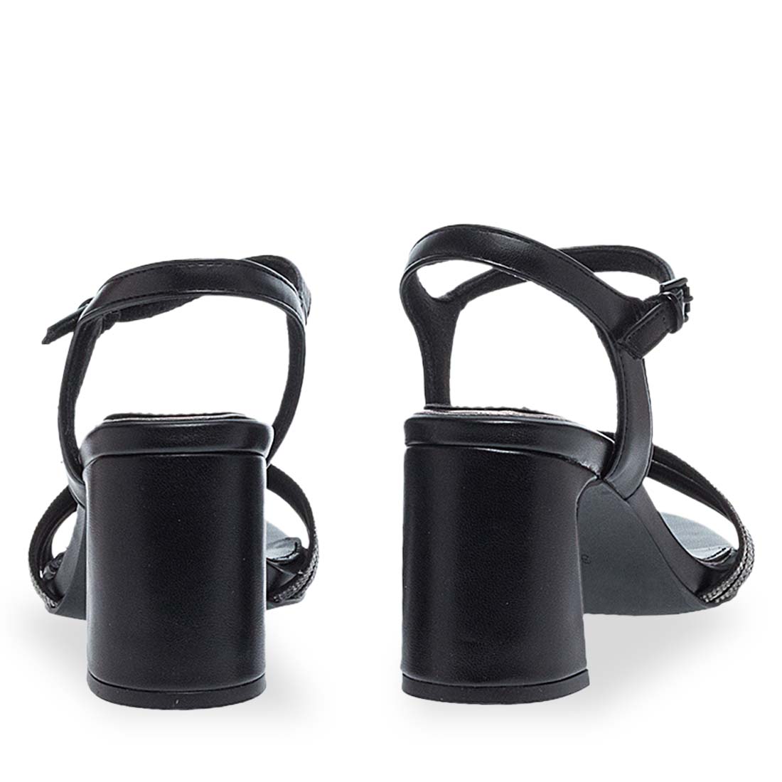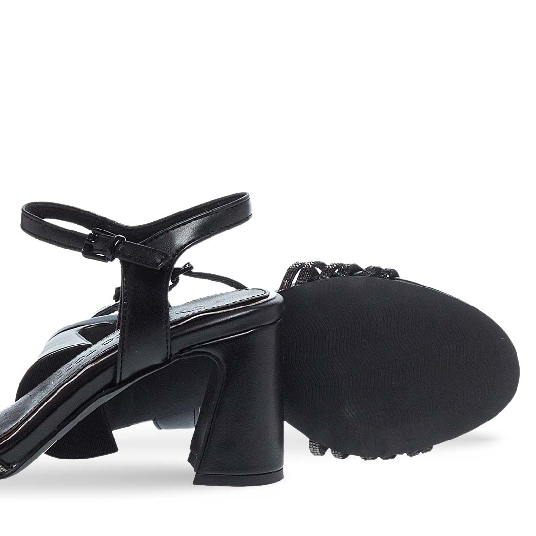 Black elegant sandals by Marco Tozzi. Ankle strap fastening. Vegan material. Suitable to wear day to night. Modern and fashionable design.