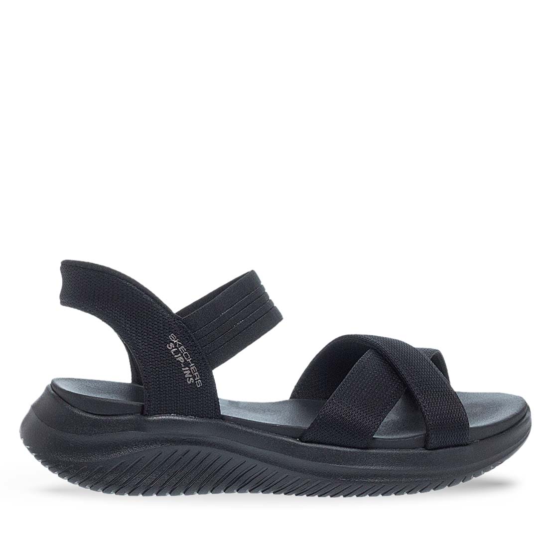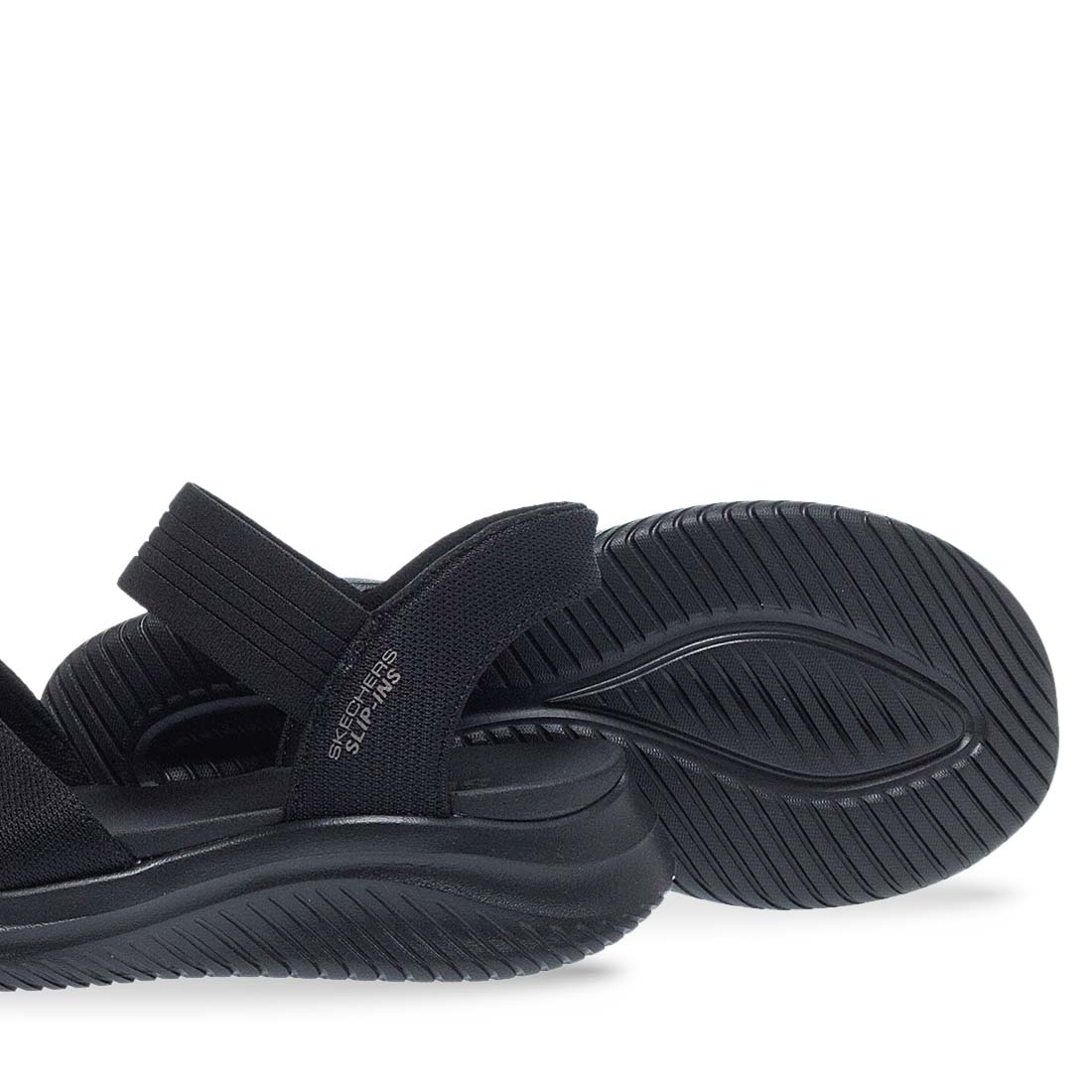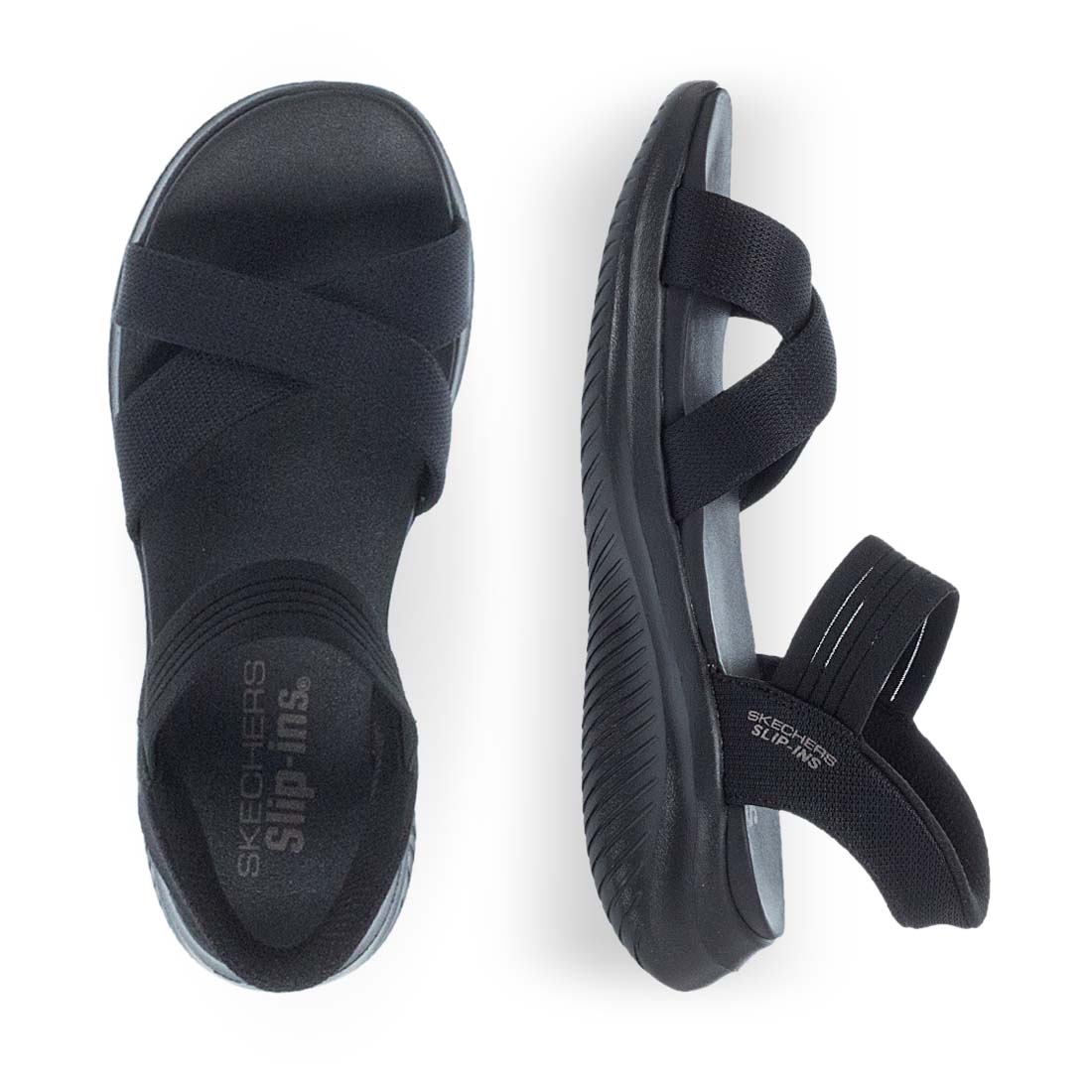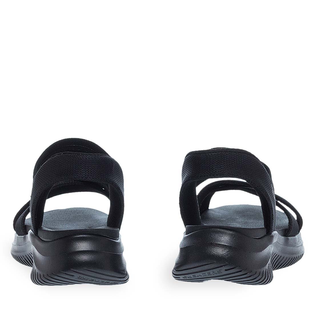Black sandals by brand Skechers. Comfortable and washable design. Super soft insole. Made of fabric. Suitable to wear day to night.
