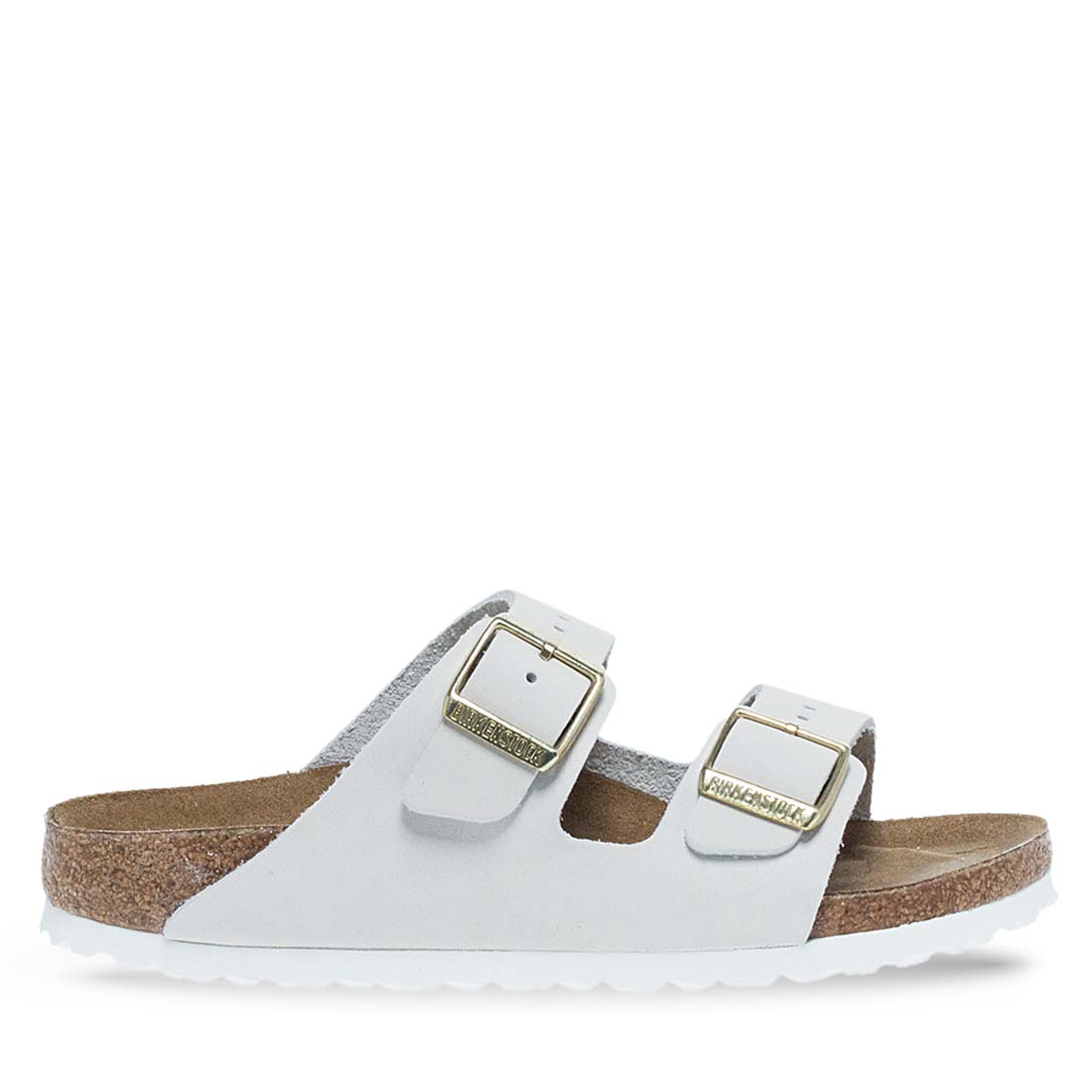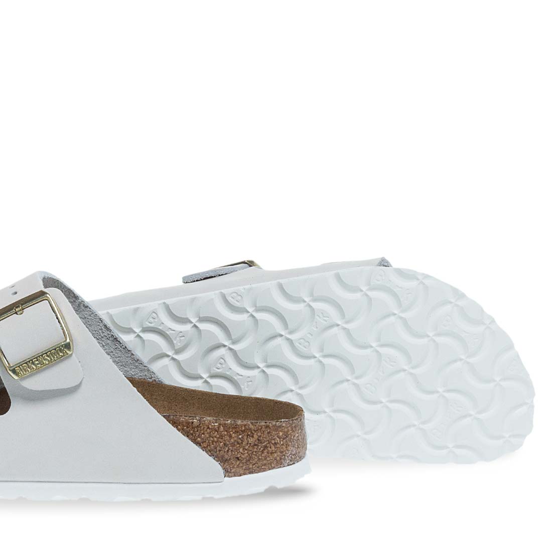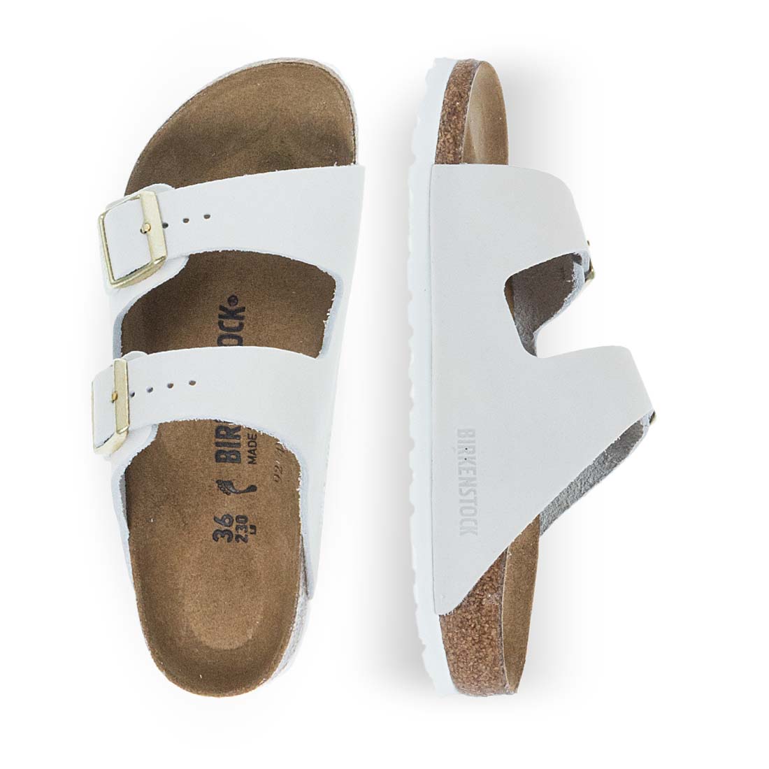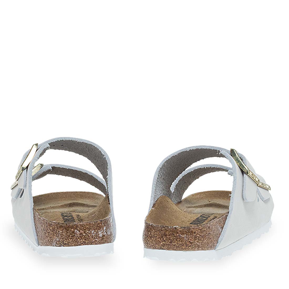 Women''s leather sandals by Birkenstock. Women''s Birkenstock sandal in white with gold buckles and a leather finish. Elegant and comfortable.