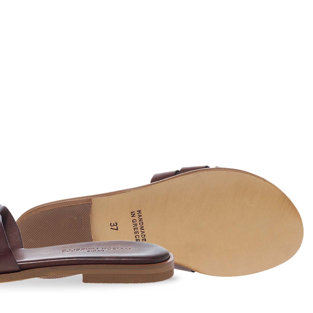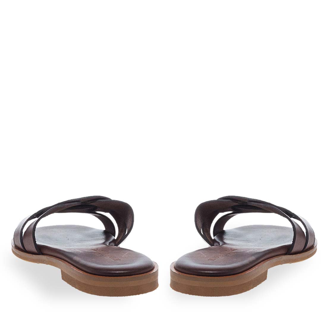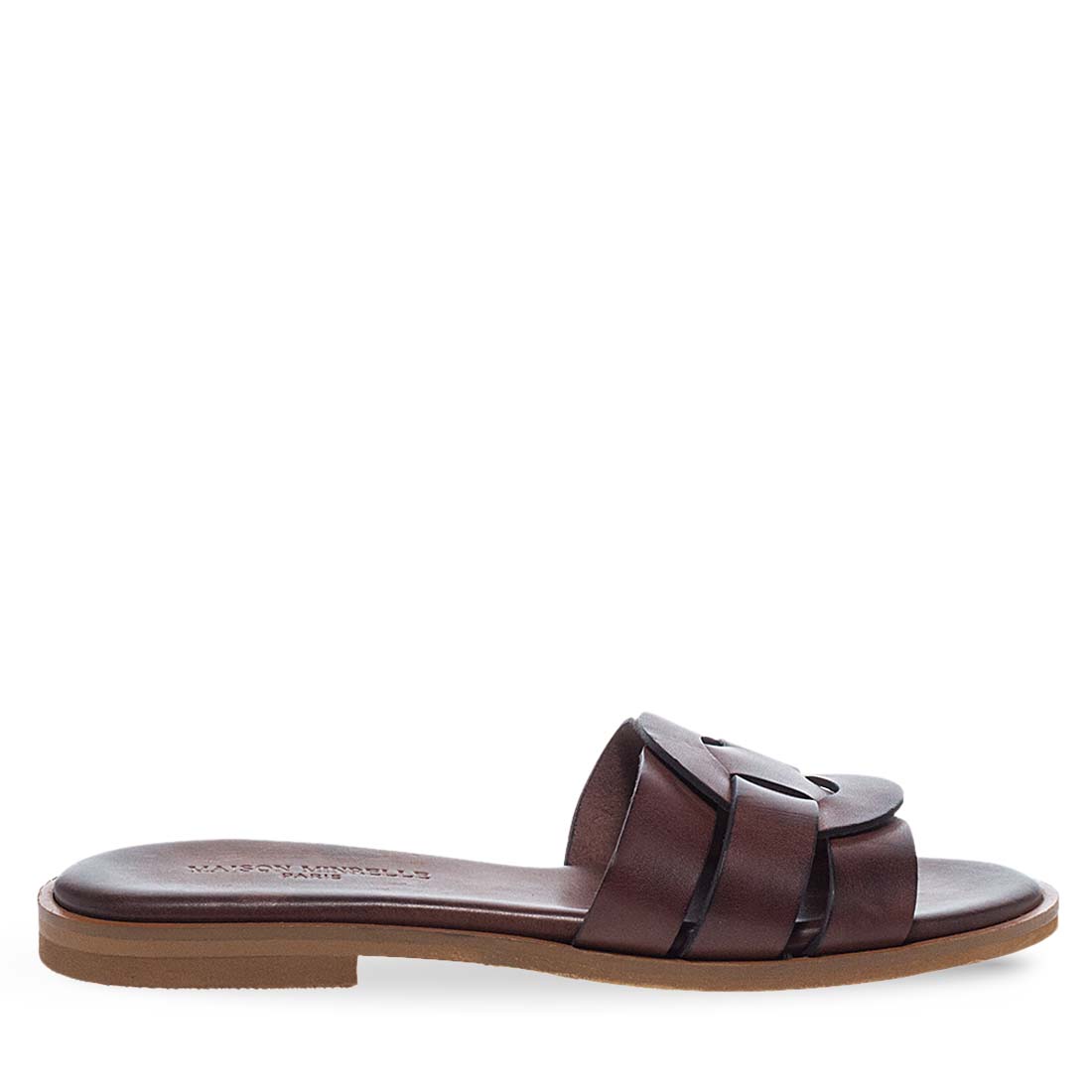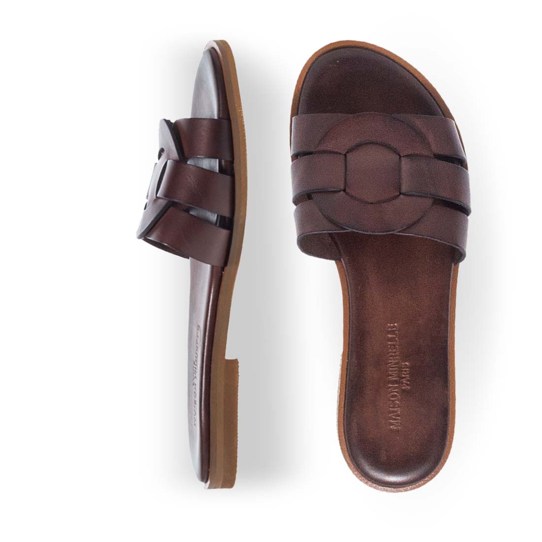 Women''s Leather Sandals Maison Minrelle. Dark brown and camel leather flat slides with a chic cutout design – summer essential.