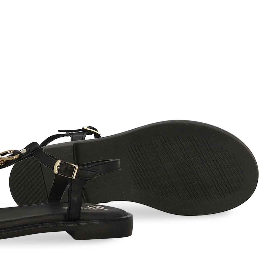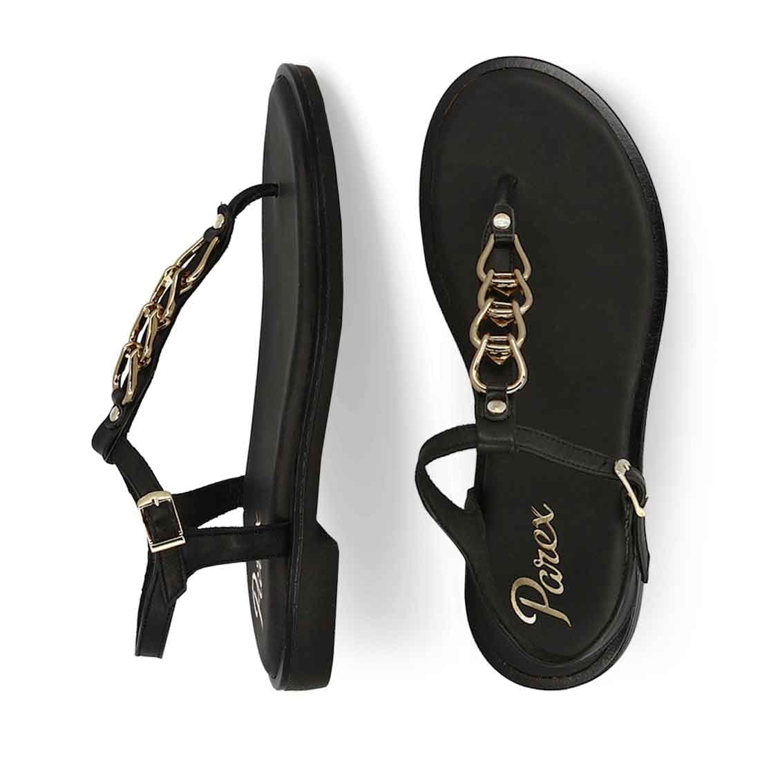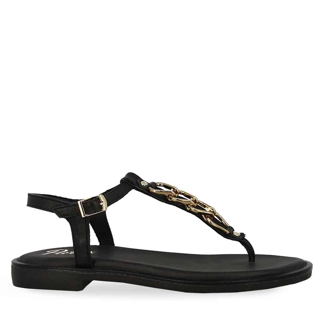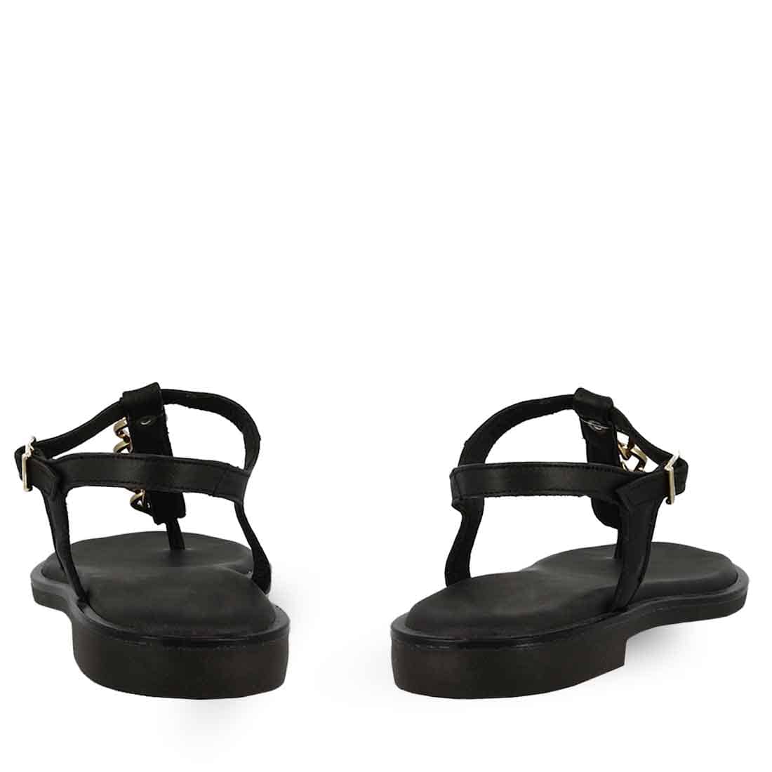 Parex flat leather sandals with buckle strap fastening and T-bar chain strap. An elegant design to add in your collection.