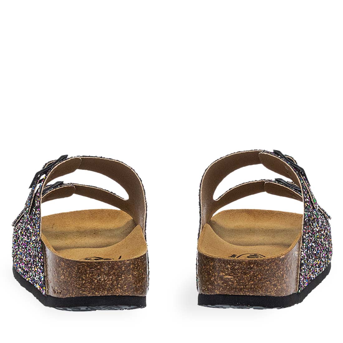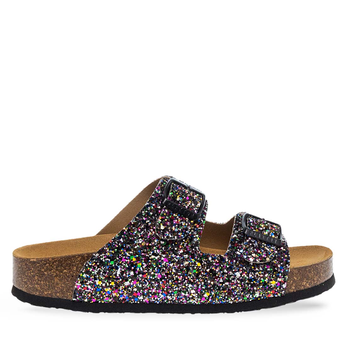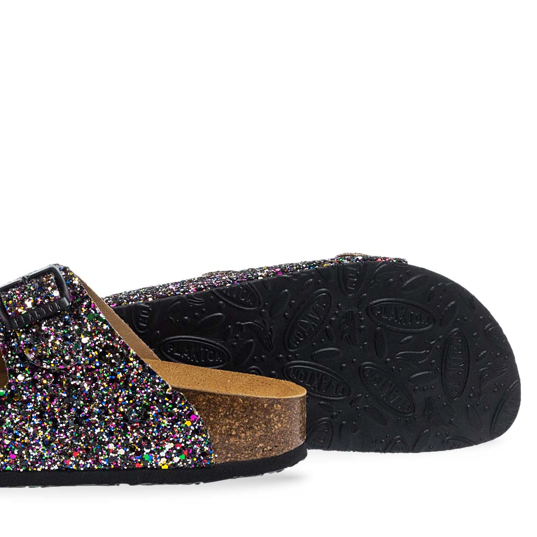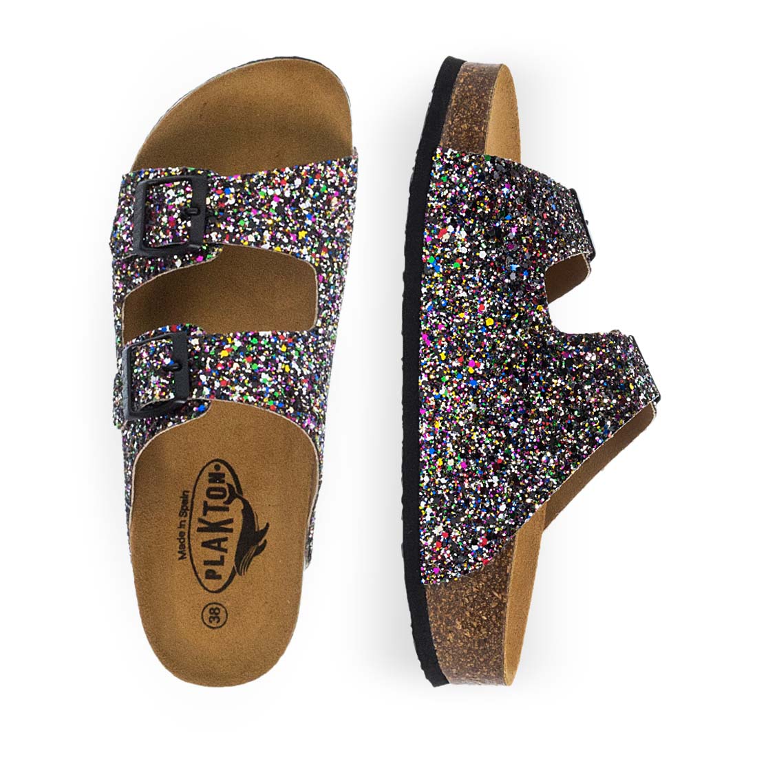 Women''s leather sandals by Plakton. Women’s anatomical sandal by Plakton with double strap decorated with multicolor glitter and adjustable buckles. Perfect for sparkling looks.