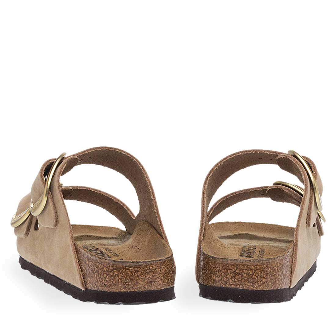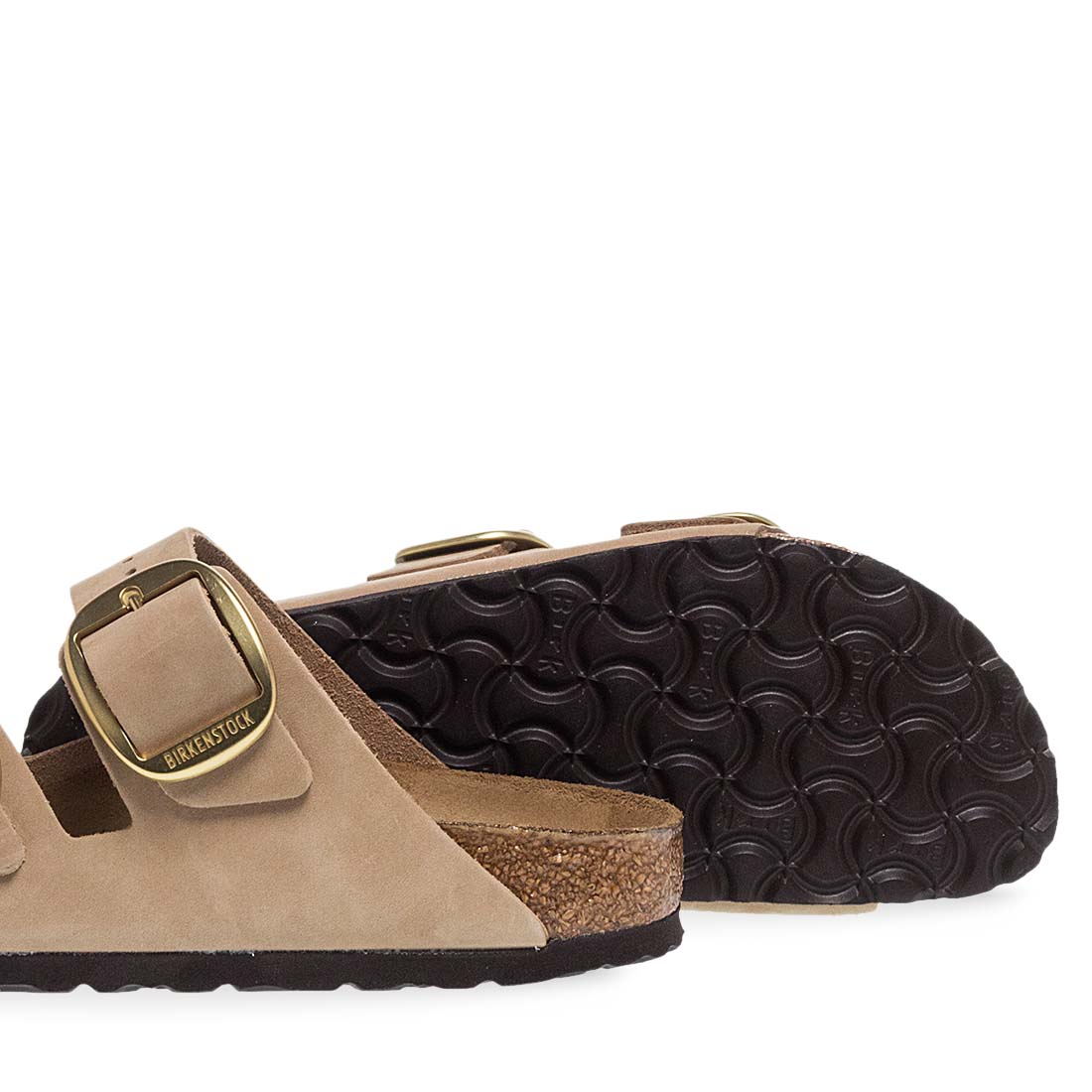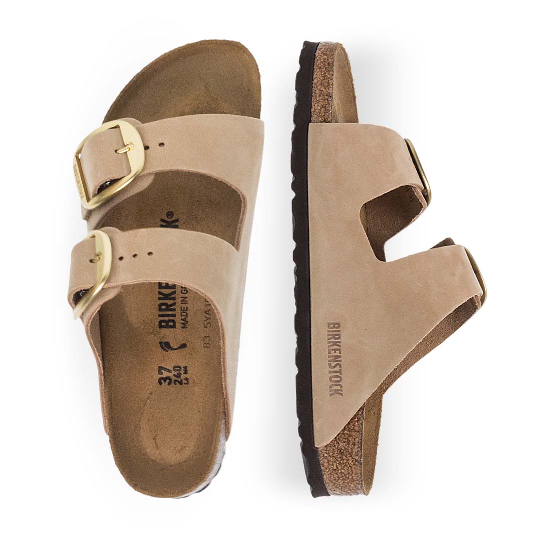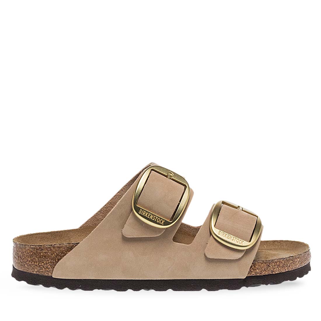Women''s sandals by Birkenstock. Birkenstock sandal with gold buckle and beige suede straps, offering comfort. Narrow fit.