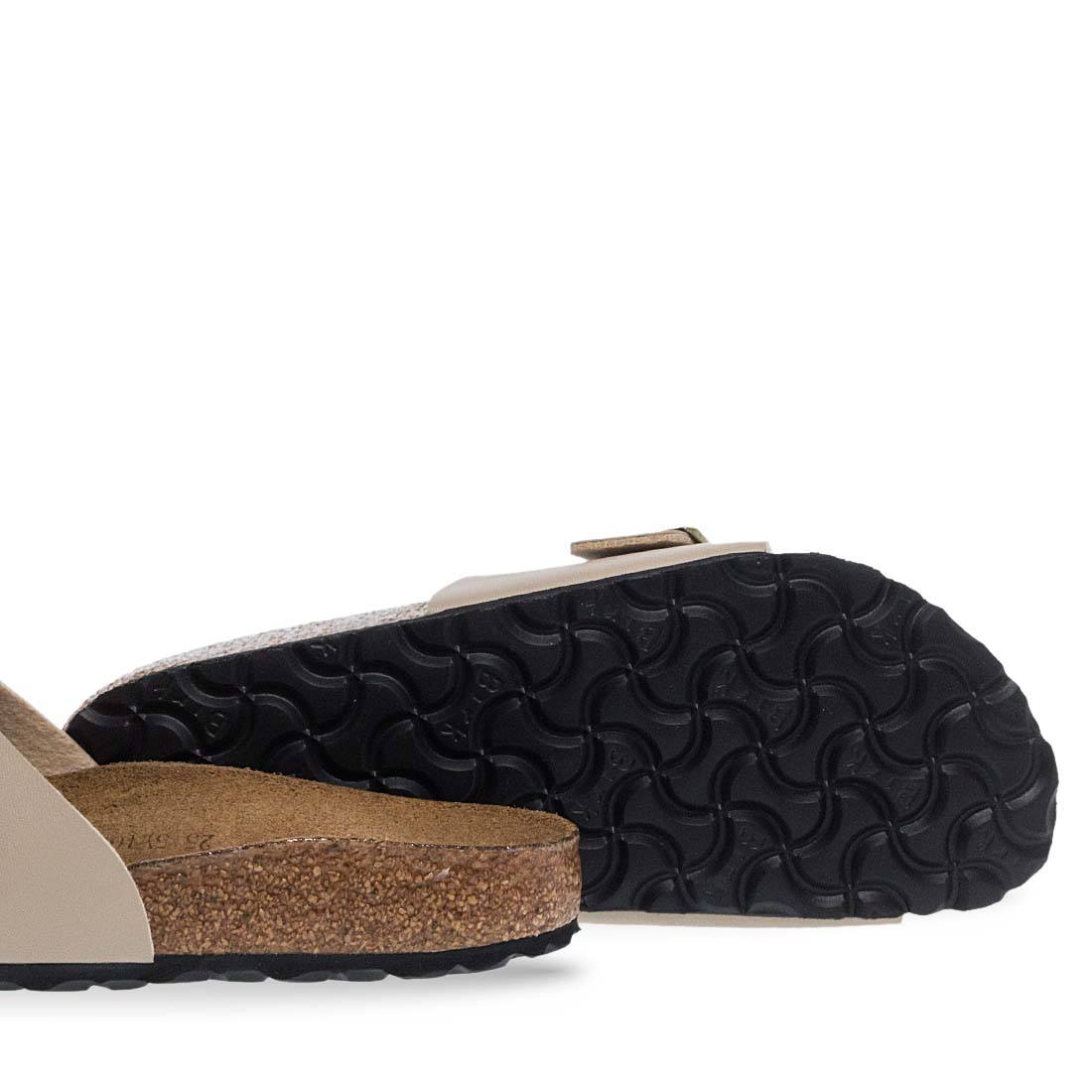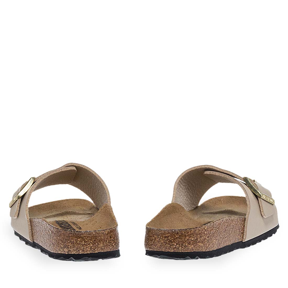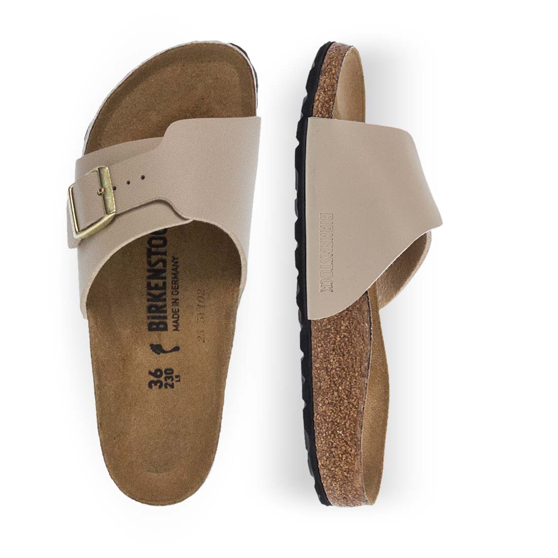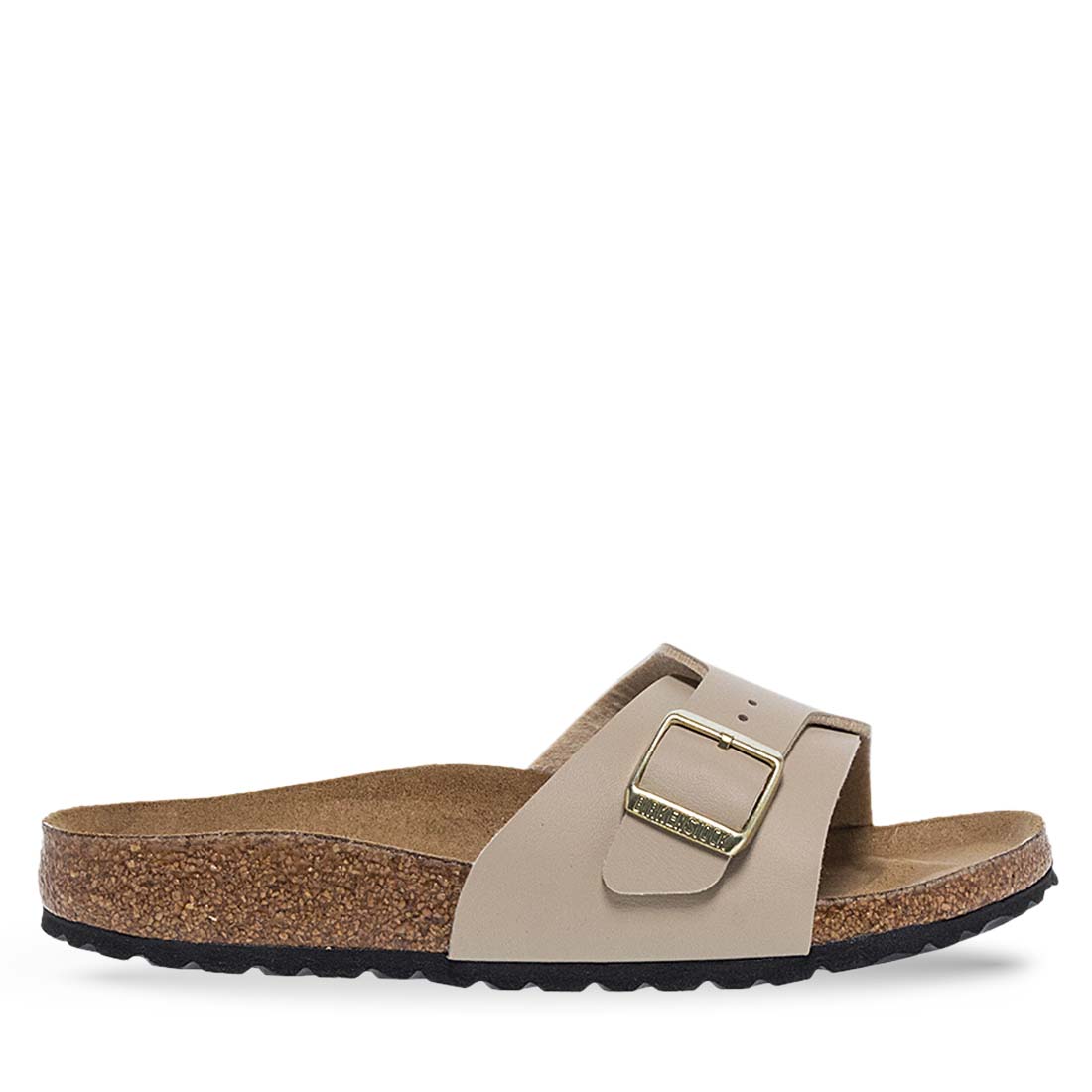 Women''s sandals by Birkenstock. Minimalist Birkenstock Madrid slides with a single wide strap and metal buckle. Natural cork footbed ensures comfort and daily support.