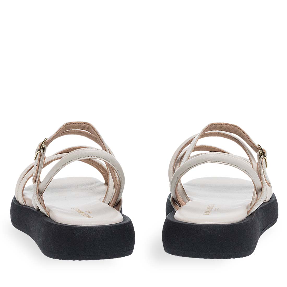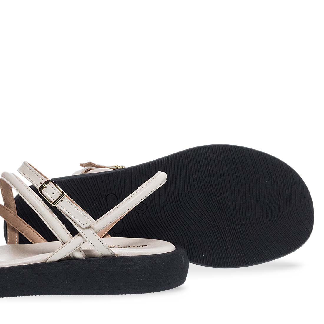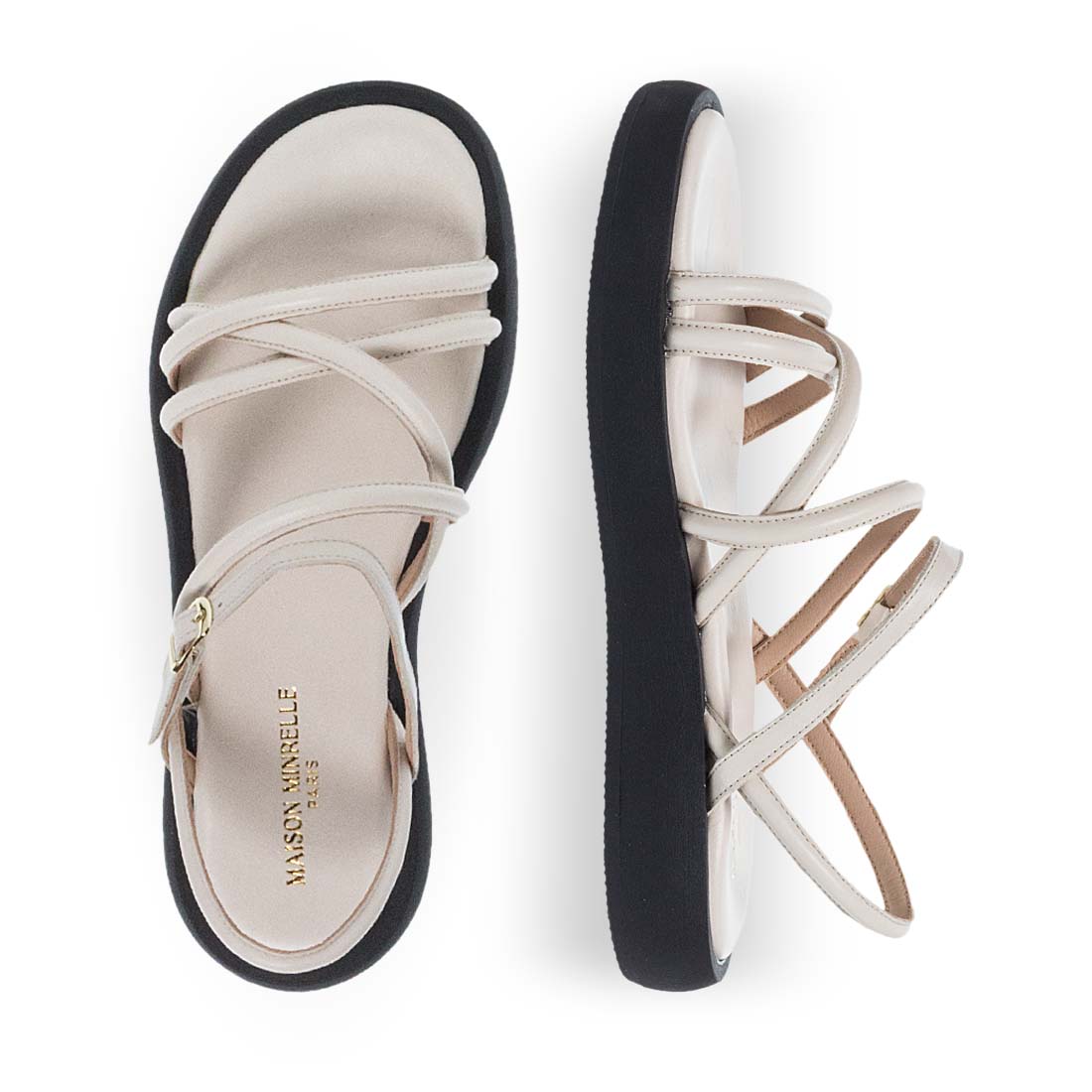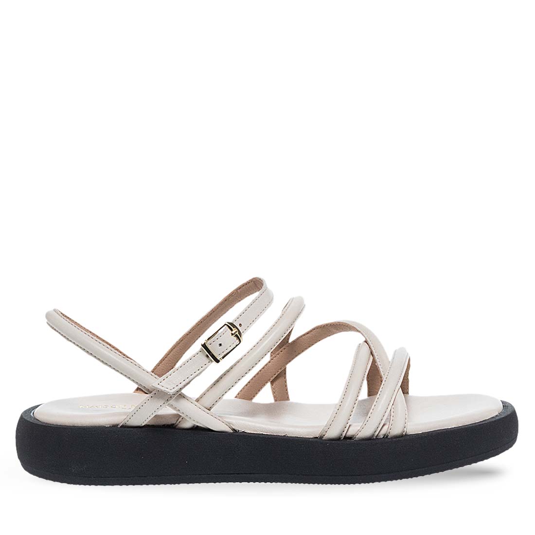 Modern sandals by brand Maison Minrelle. Made of real leather. Extremely soft insole and flat non-slip sole. Strass detail.Comfortable design.