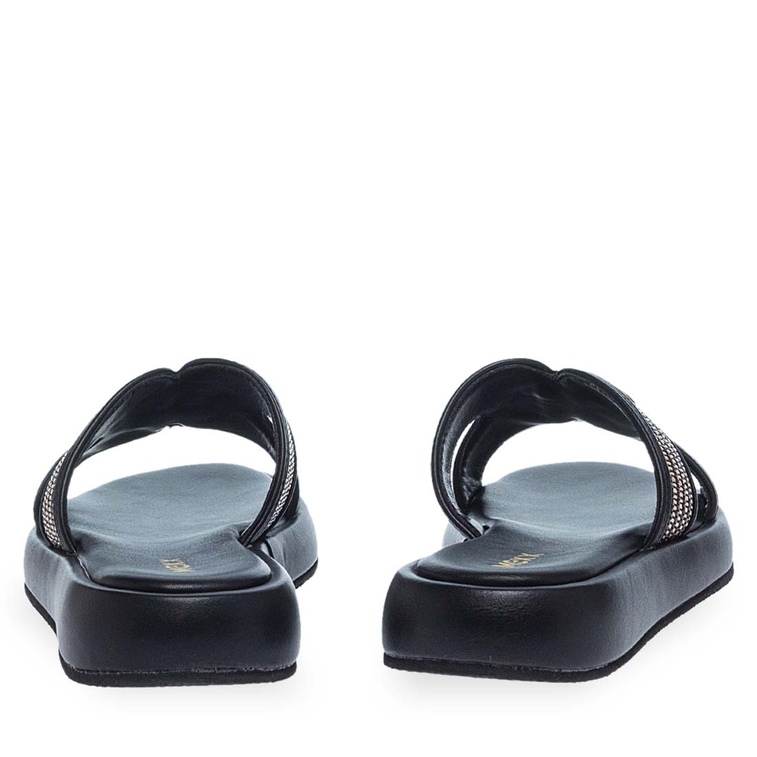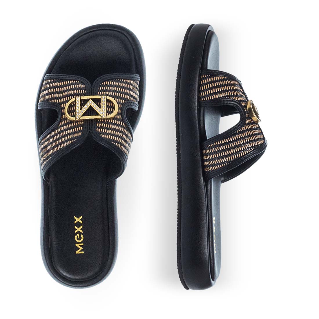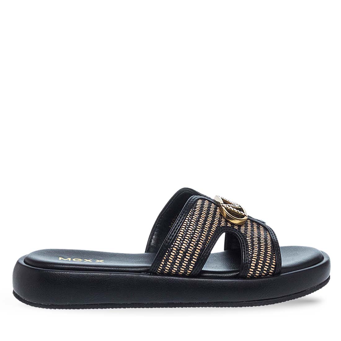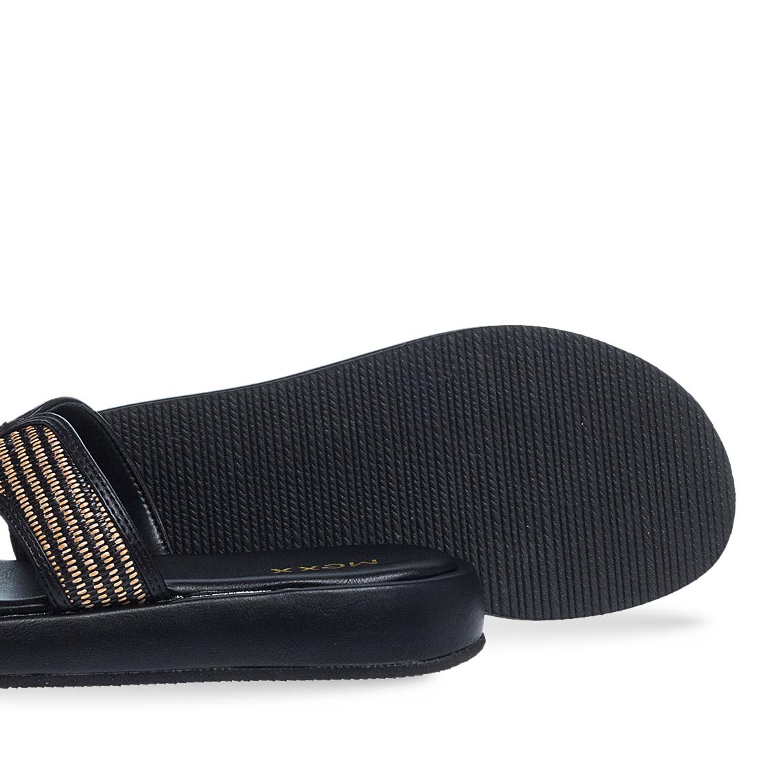 Step up your looks with these summer sandals Mexx with metallic detail on the upper. Soft , flat insole. Modern design. Available in black color.