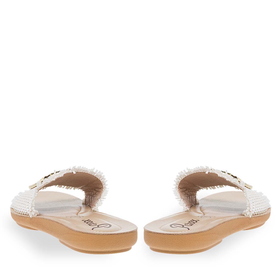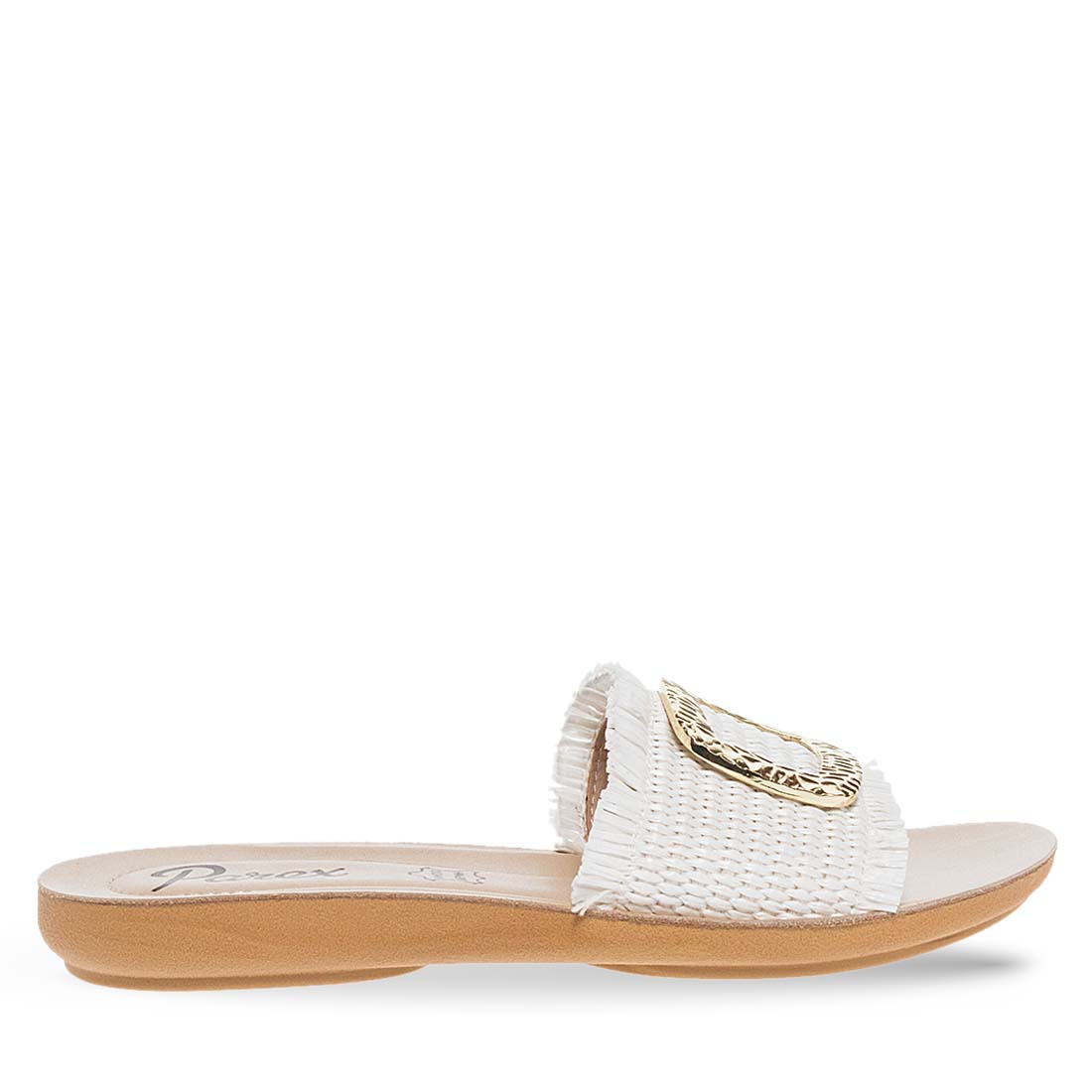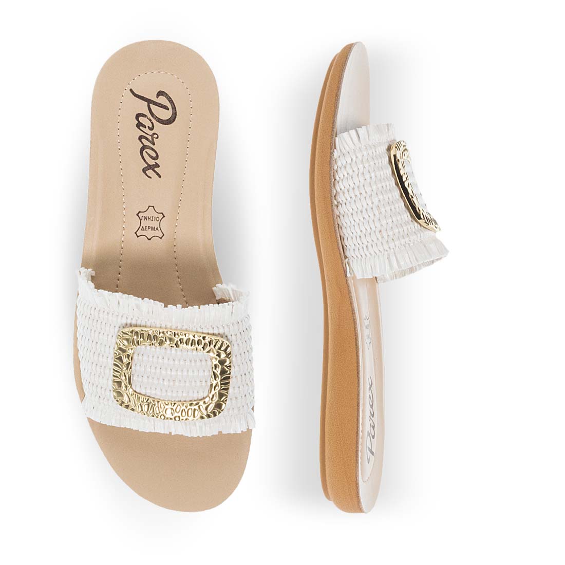 Stand out in your summer style with these sandals for women by Parex. Available in black, white and beige color. They have a wide strap with gold detail on the upper. Comfortable leather insole and durable non-slip sole. Made of premium quality eco leather.