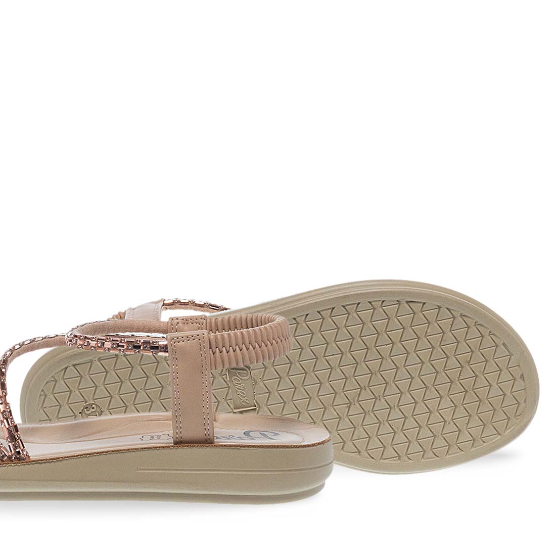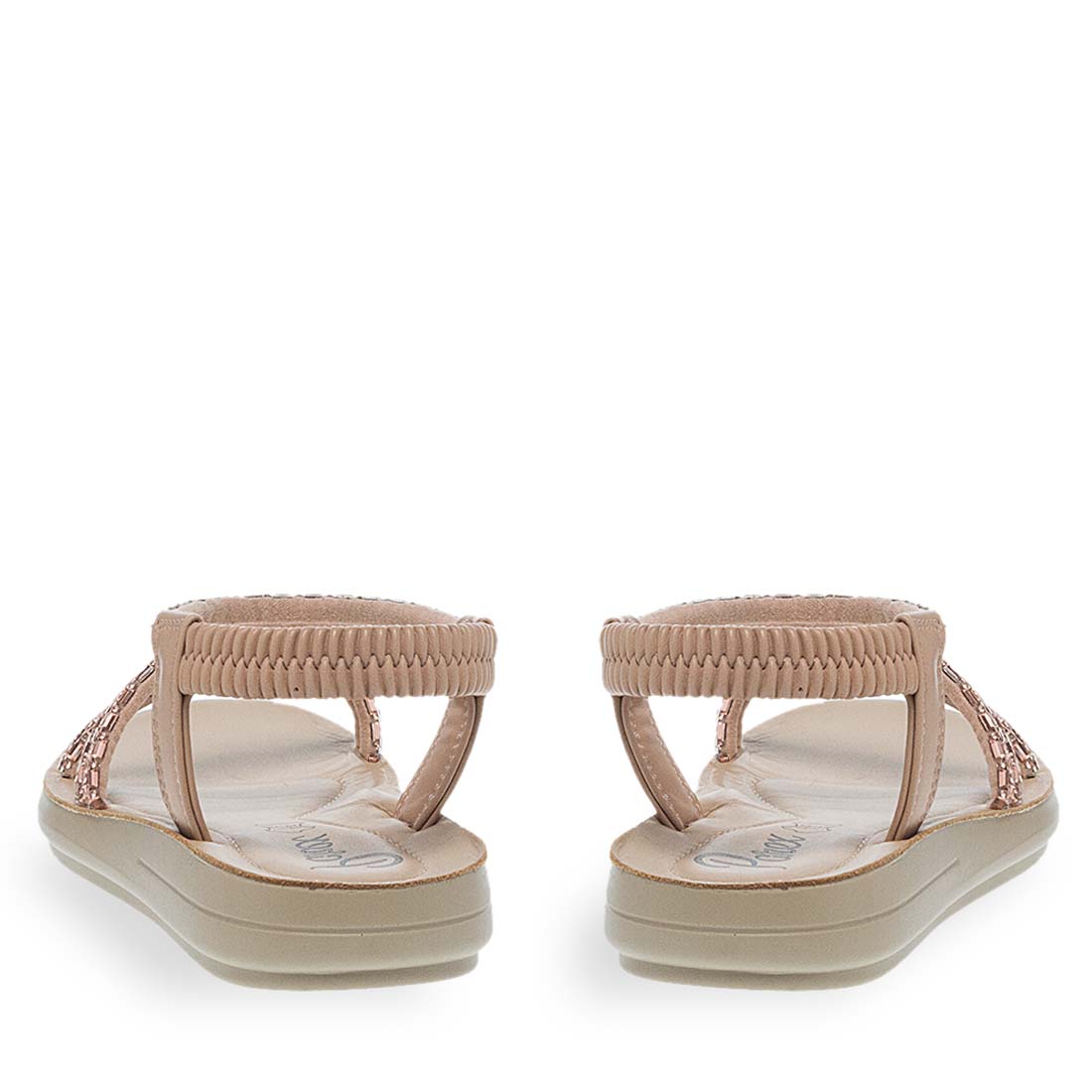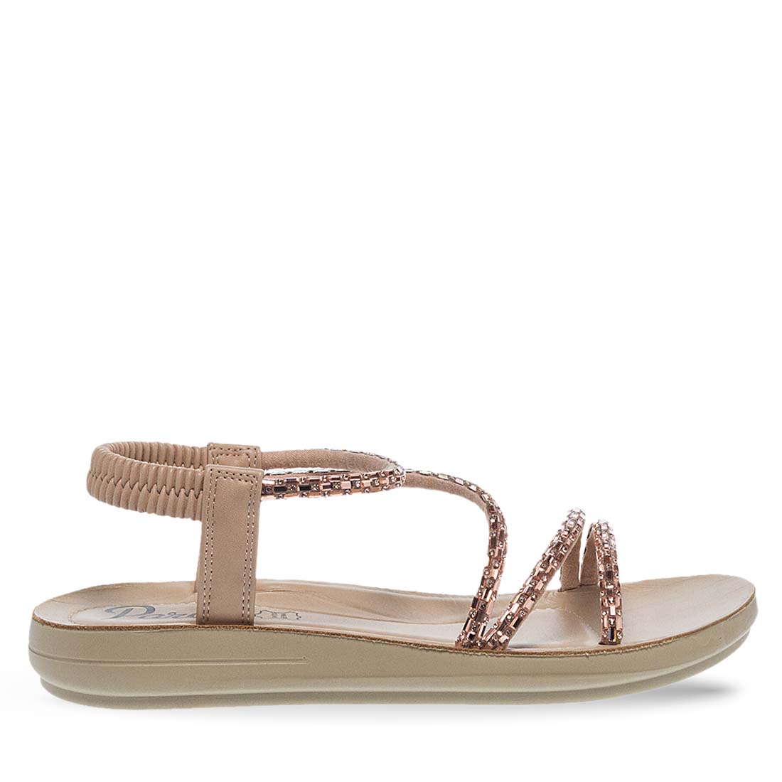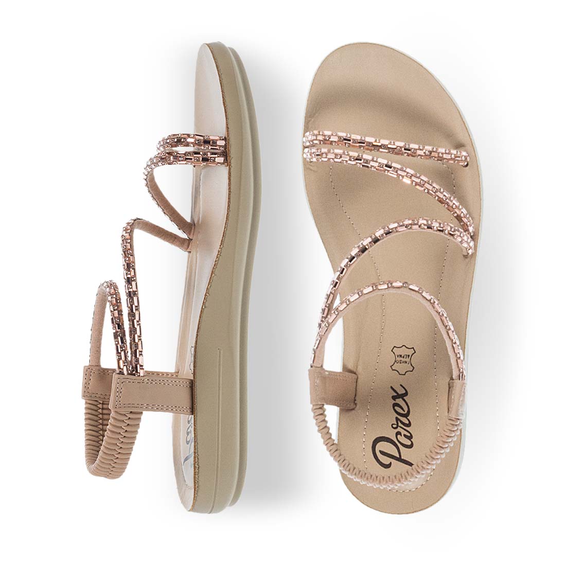 Fashionable sandals for women. Strass detail on the upper. Elasticated strap at the back. Comfortable leather footbed and durable flat sole for steady and modern steps. Refresh your style with these stylish sandals.