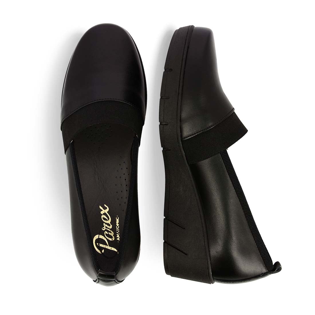 These women''s leather slip on by Parex are designed from premium leather that hugs the foot perfectly. Elastic in front for easy fit. With a sturdy sole and a soft insole that keeps the foot comfortable.