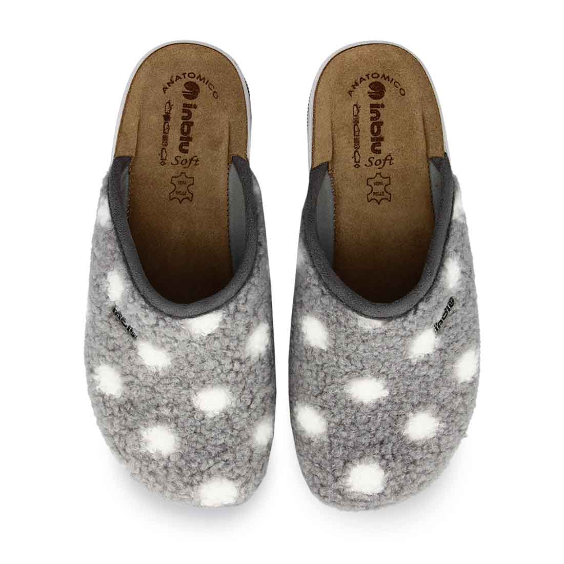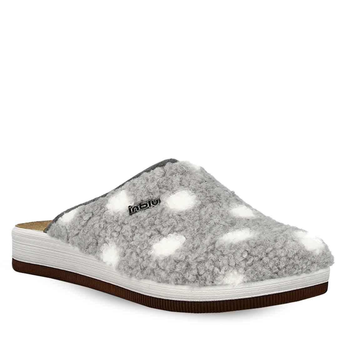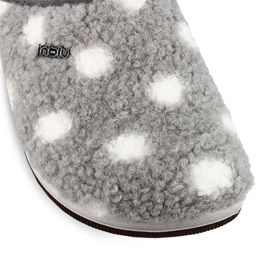 Another comfortable choice for your everyday style are these women''s slippers by Inblu. They have a soft footbed and a stable sole. Available in gray color with polka dot details.