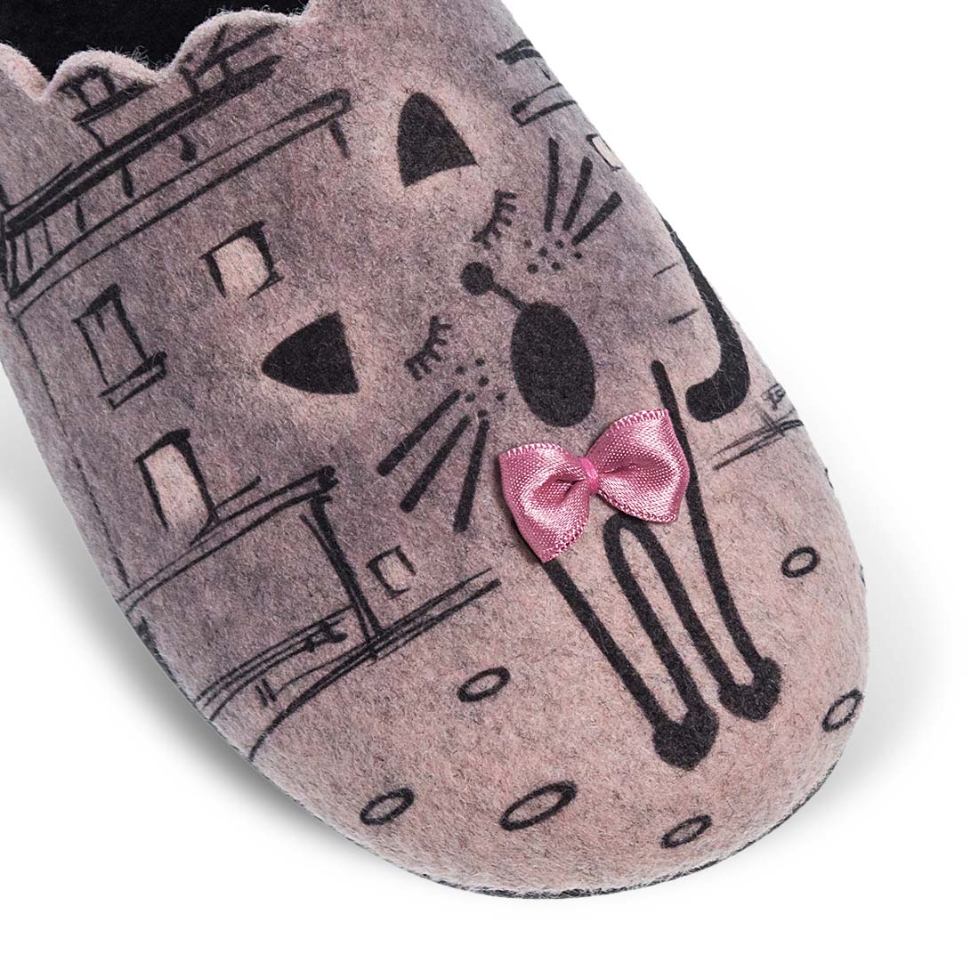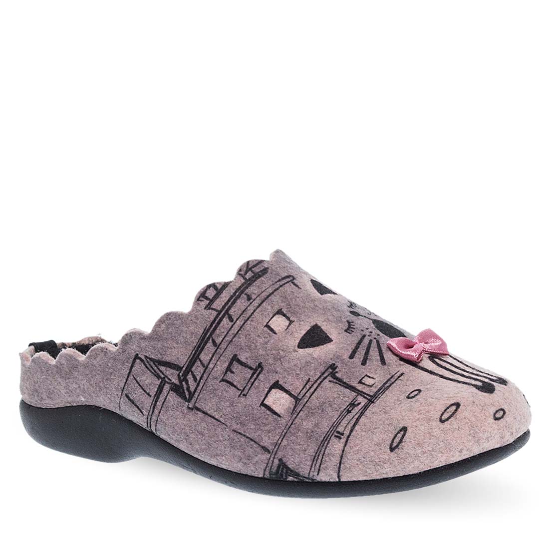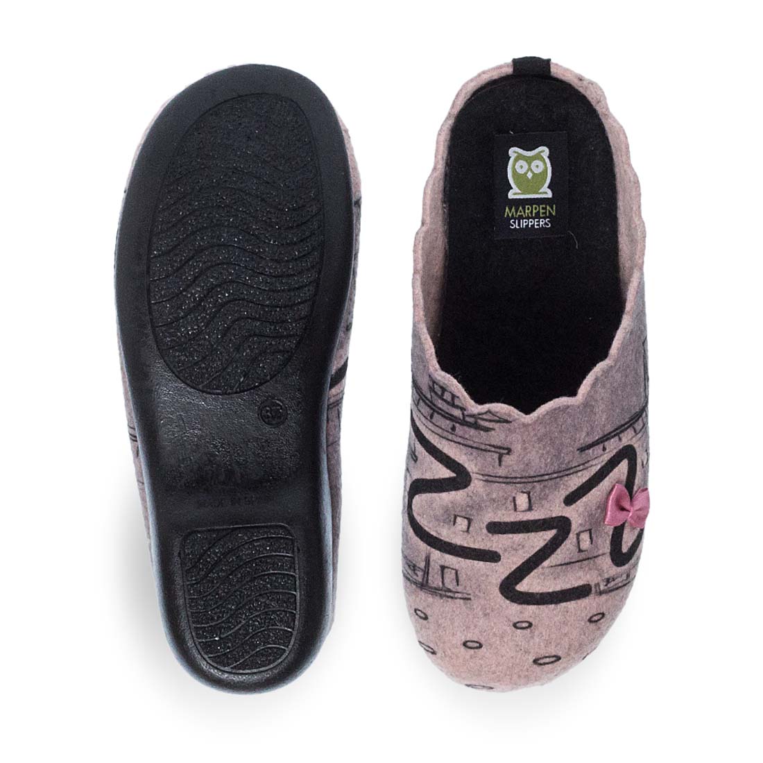 Modern house slippers by Marpen. Made of fabric. Available in pink color with bow detail. Comfortable warm footbed and a non-slip stable sole. Easy to wear.