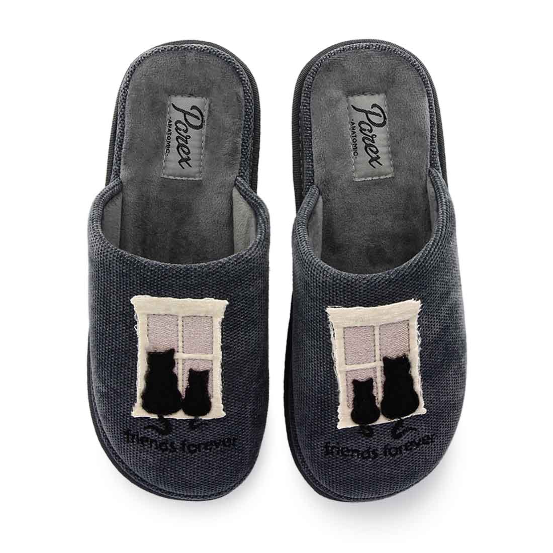 House slippers with cats in the window design. Fabric lining and non-slip sole. Design available in 2 colors. Washable at 30°C, keep them fresher for longer.