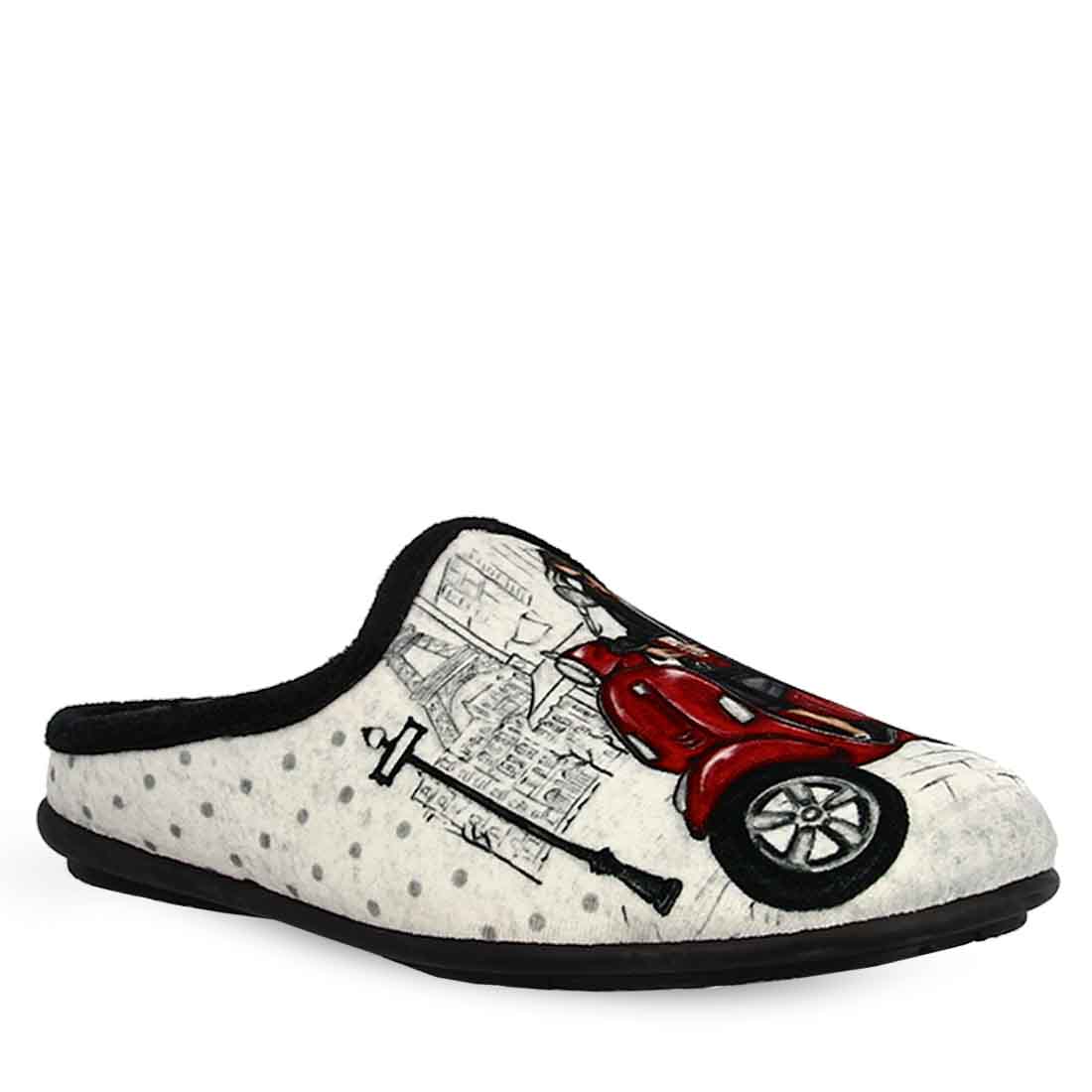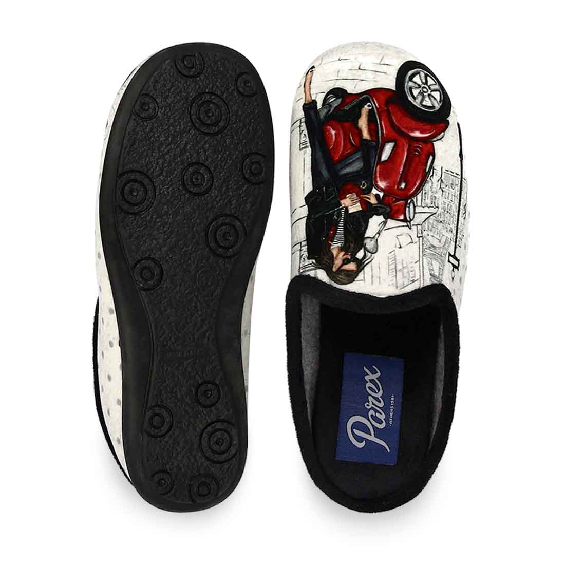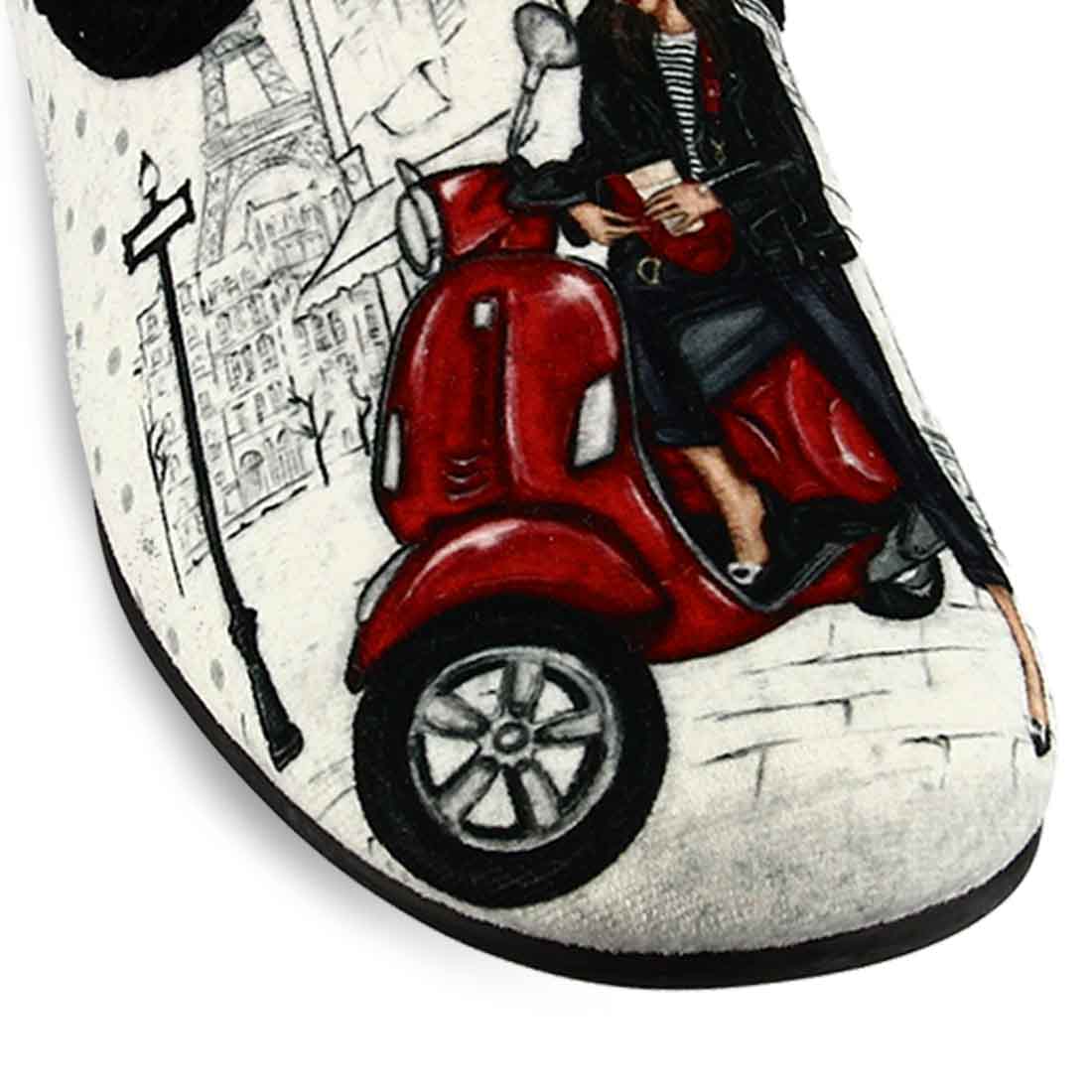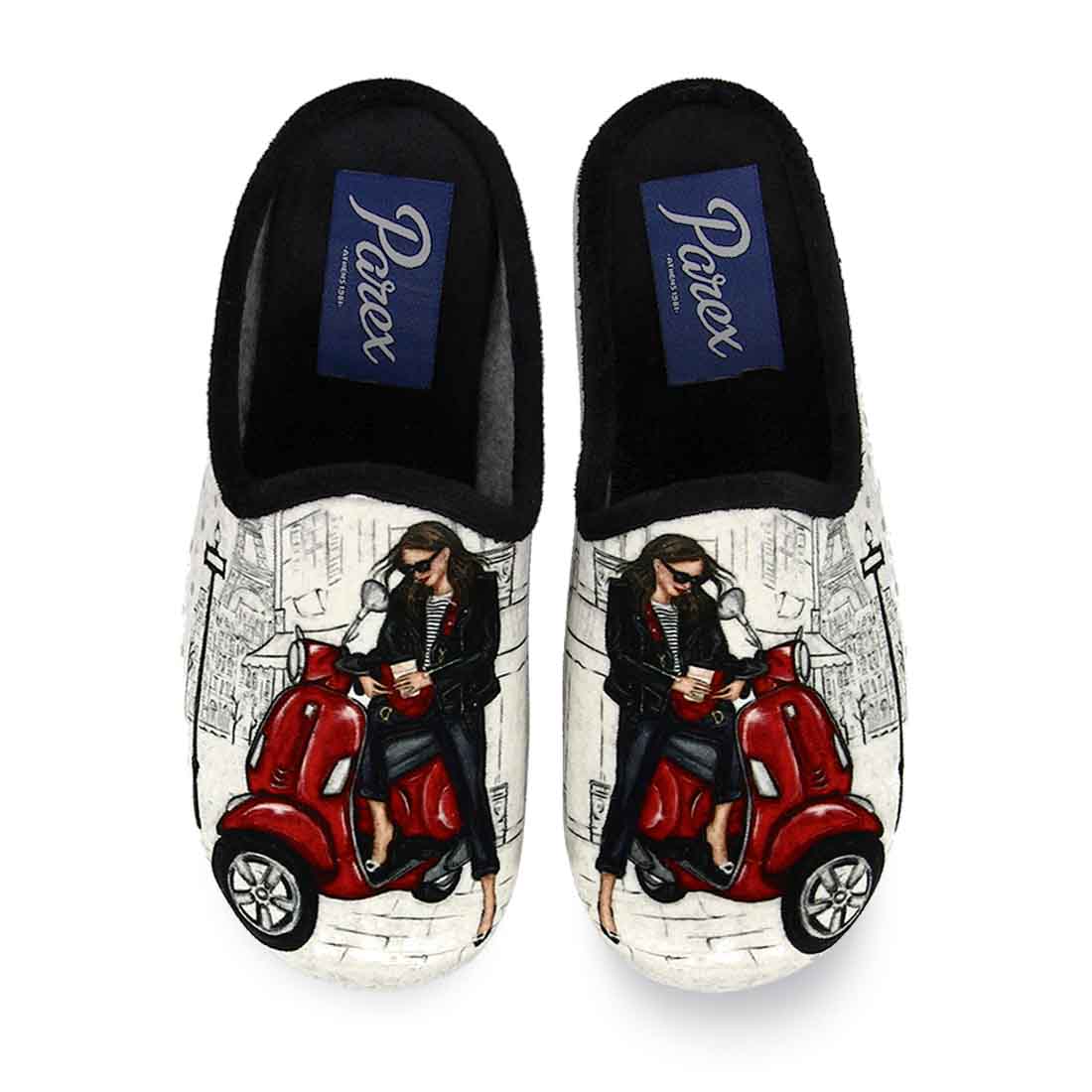 Fashionable house slippers with print woman with Vespa in Paris in black and pink color. Soft velvet bottom and non-slip sole.