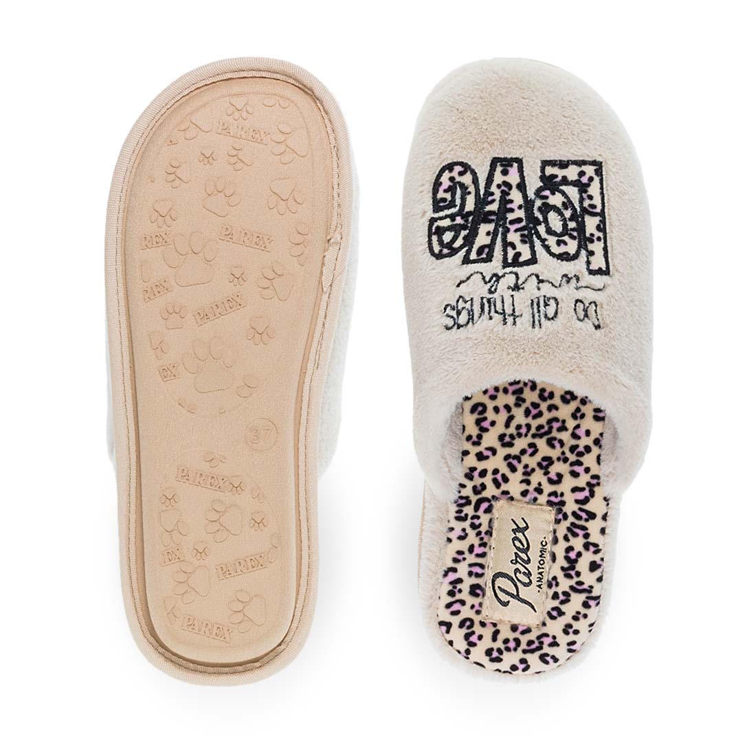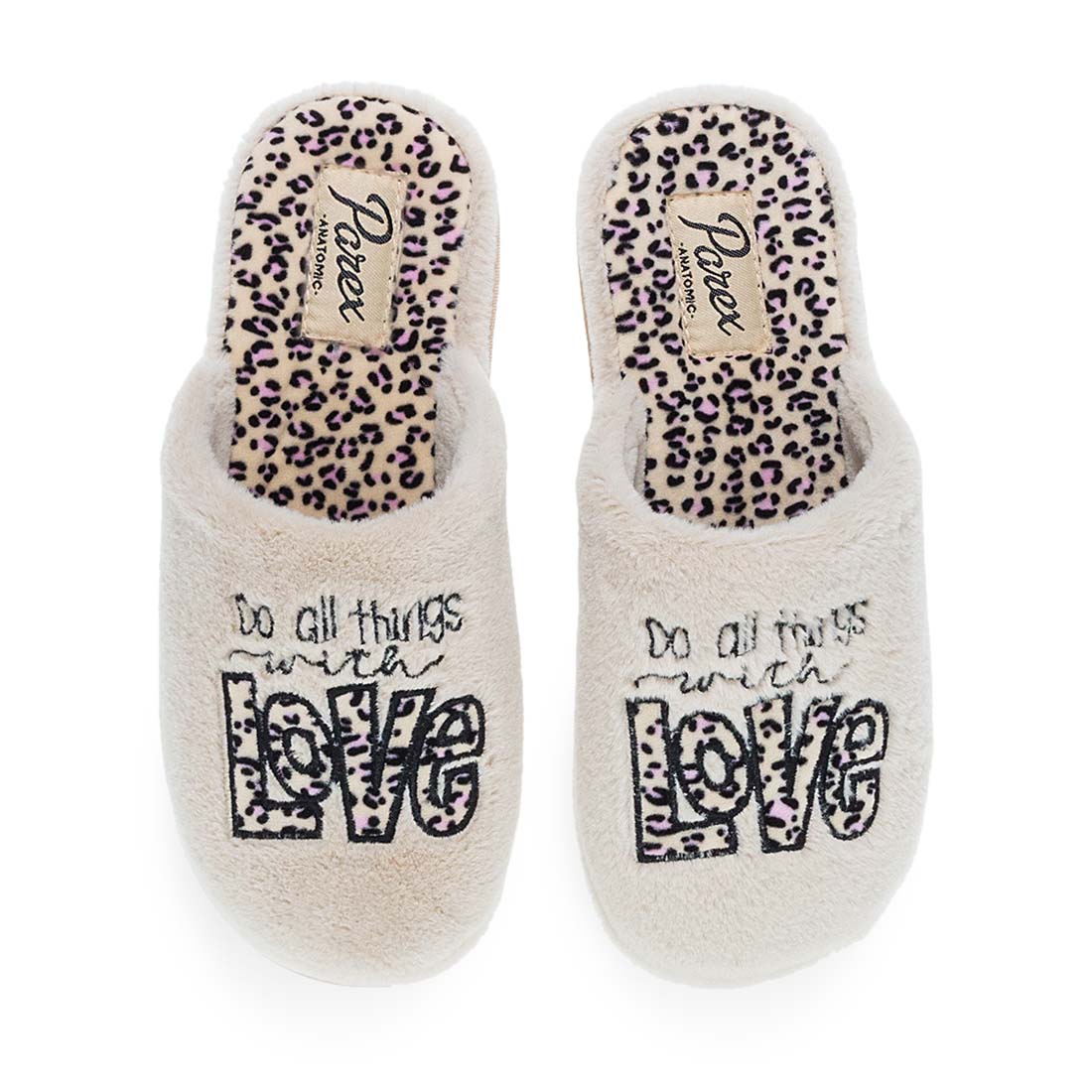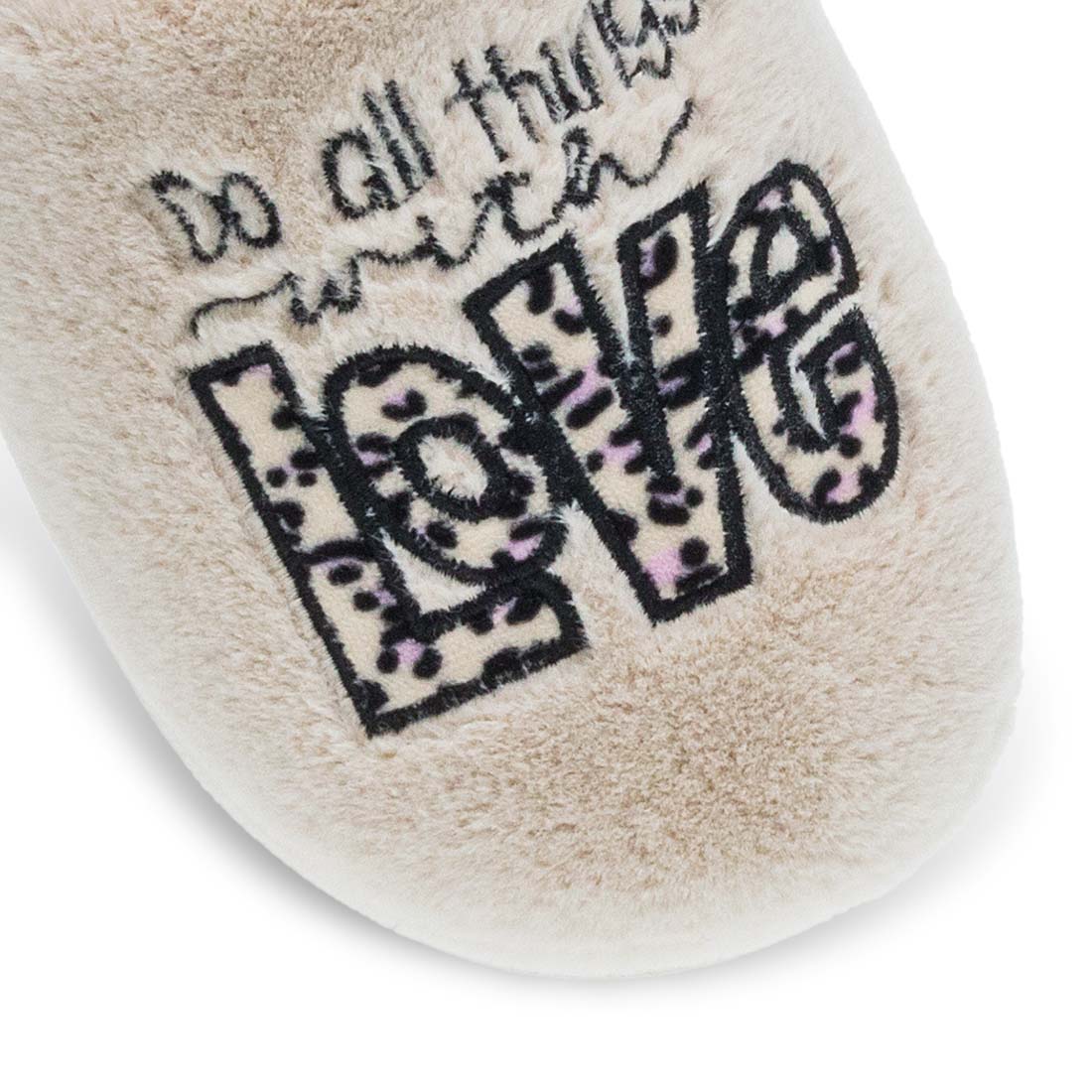 Women''s house slippers by Parex. Women''s Parex slippers with embroidered message ''Do all things with Love'', leopard interior and soft touch for style and comfort.