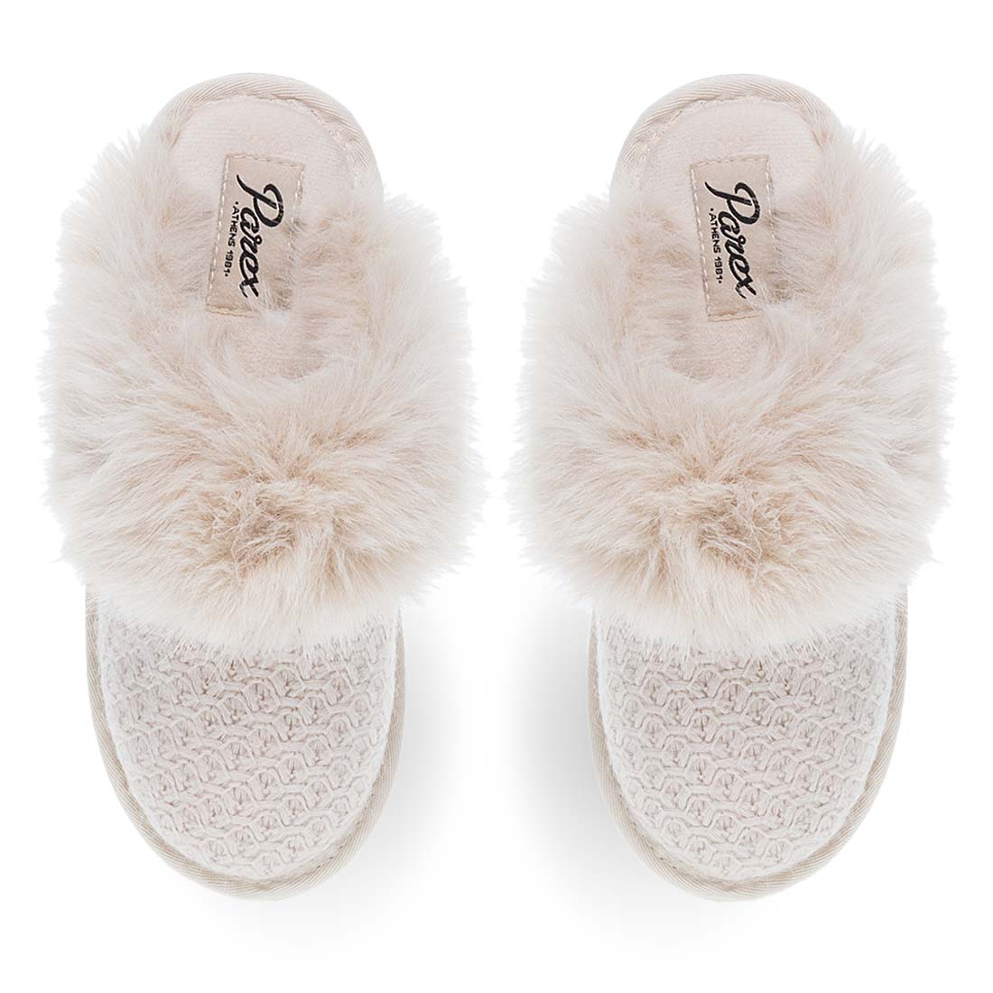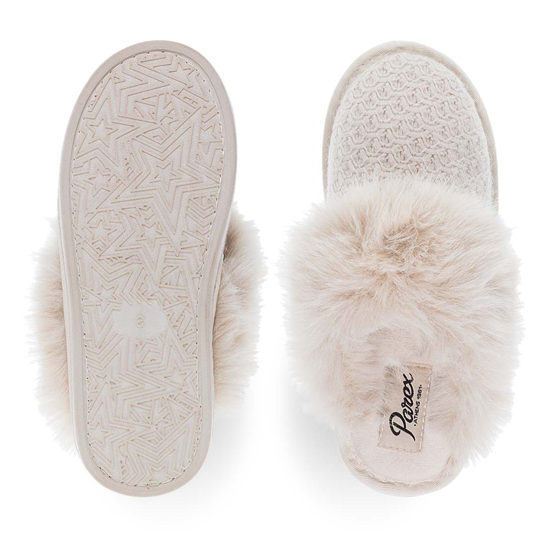 Women''s house slippers by Parex. Women’s Parex home slippers in beige and pink, with luxurious faux-fur detailing on top. Soft, warm and stylish, these slippers combine cozy comfort with elegant design. Perfect for chilly days at home.