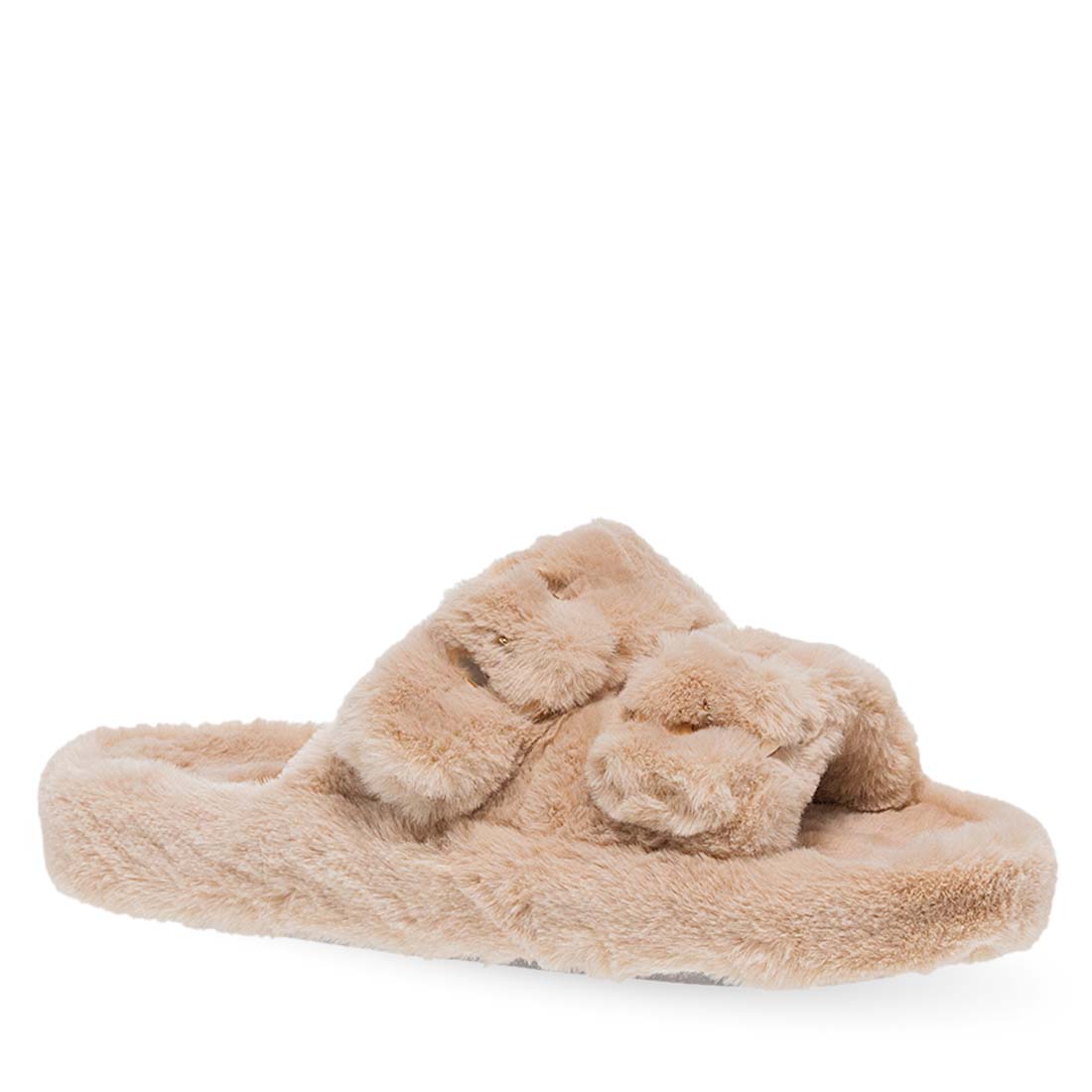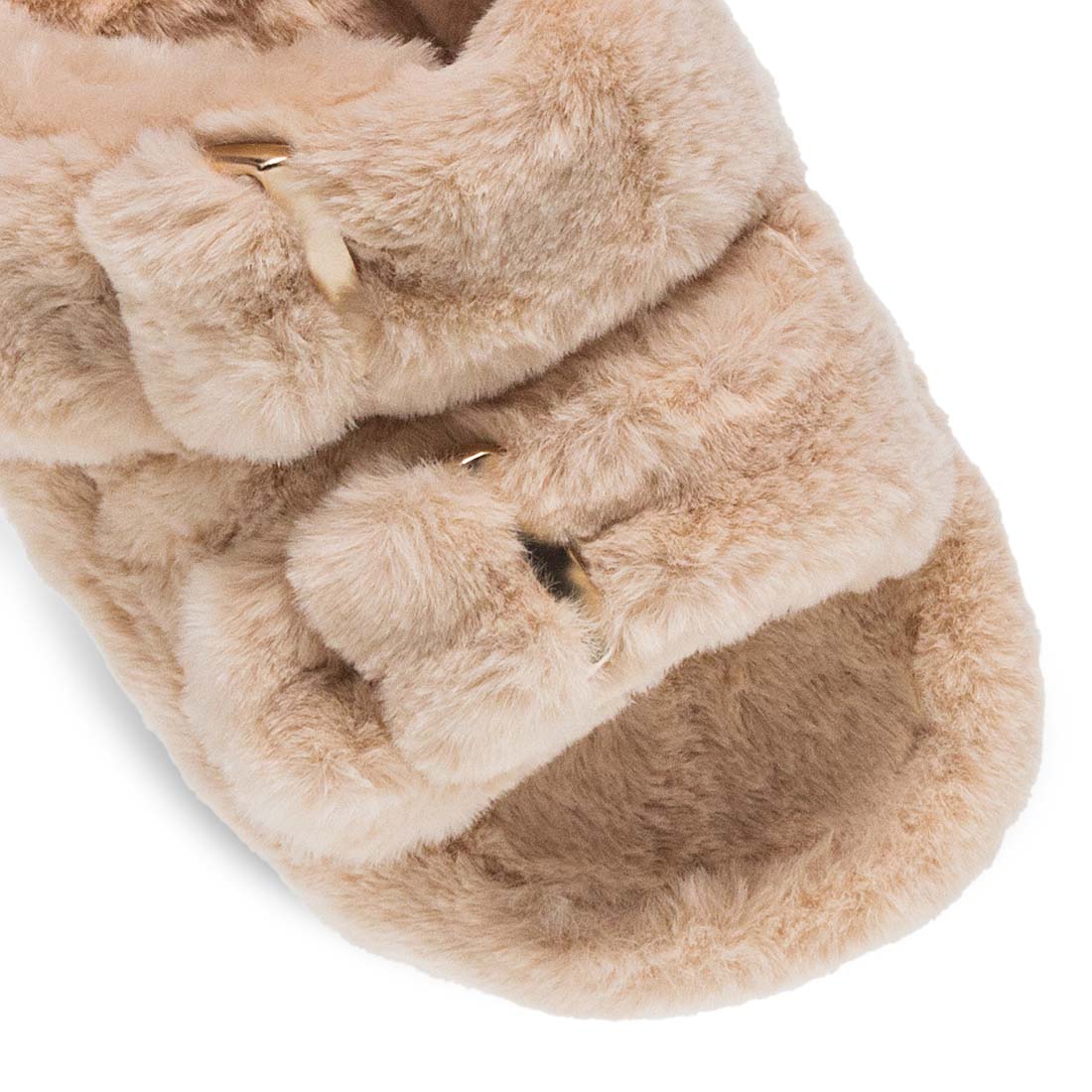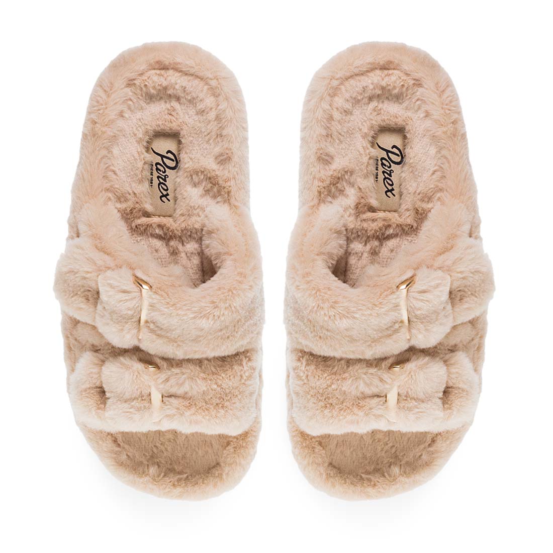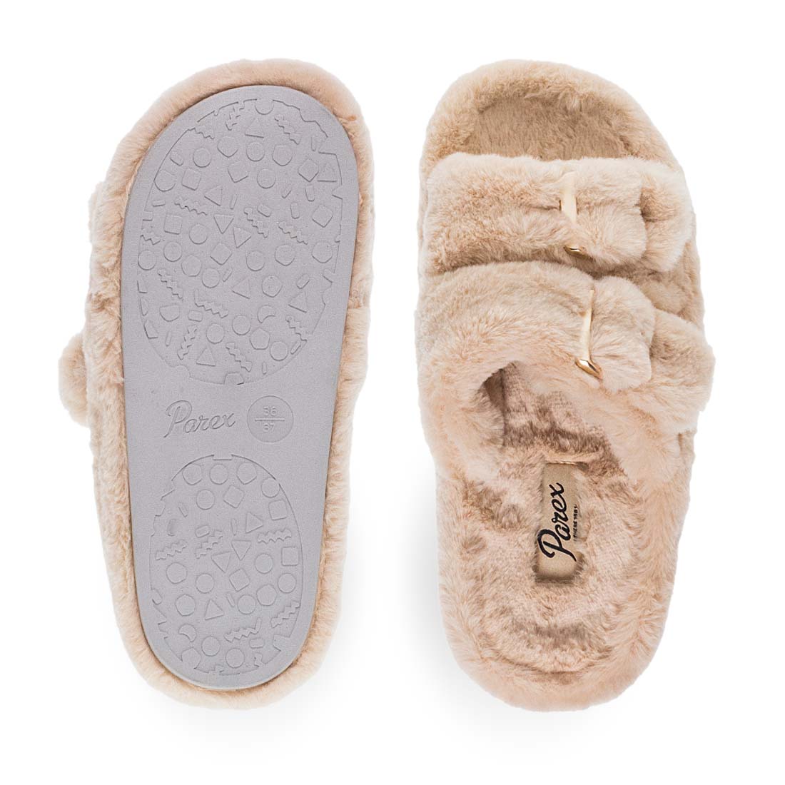 Women''s house slippers by Parex. Women’s open Parex slippers with double faux-fur straps and gold buckles. Comfortable and fashion-forward.