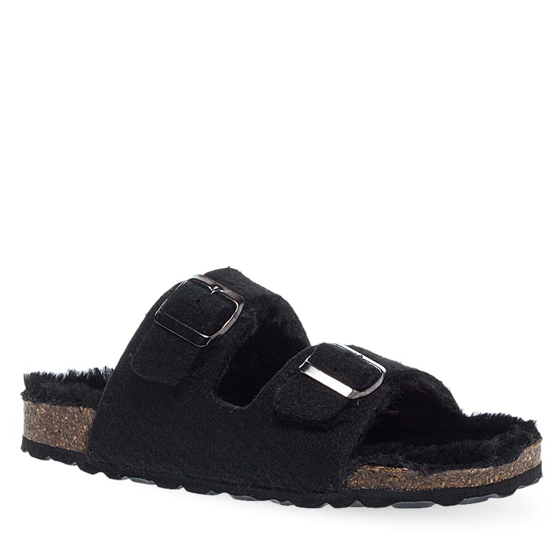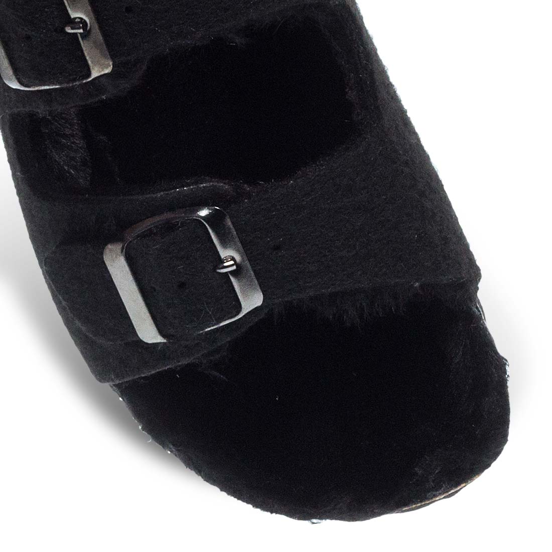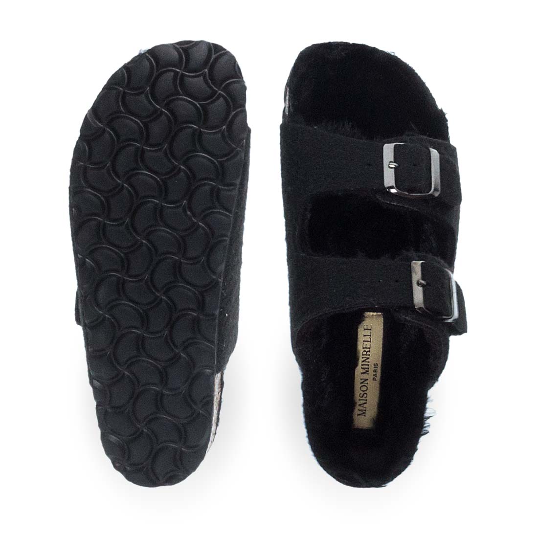 Warm and comfortable slippers by Maison Minrelle. Two straps on the upper. Synthetic fur. Soft insole. Feature comfortable and non-slip outsole. Easy to fit.