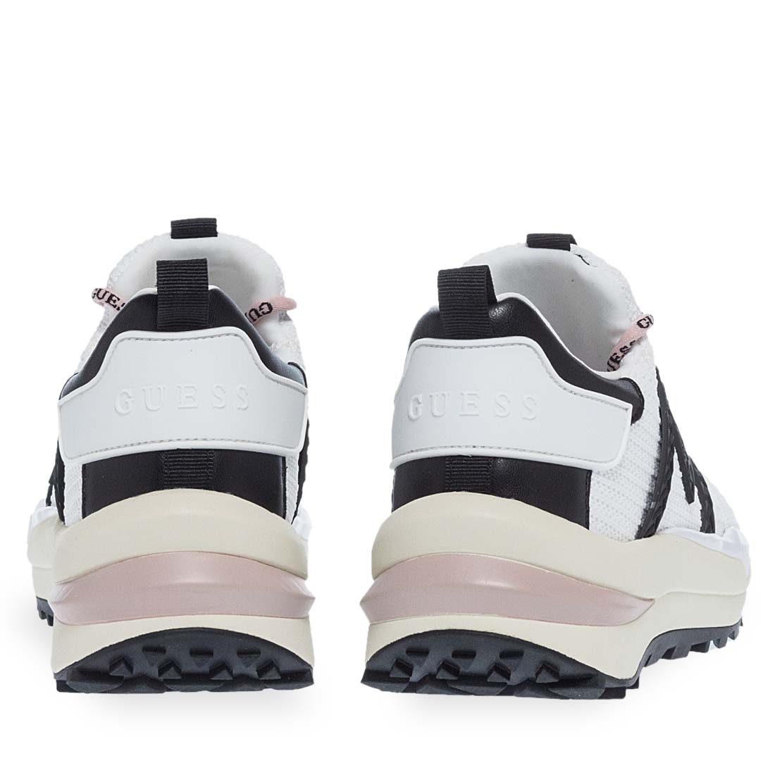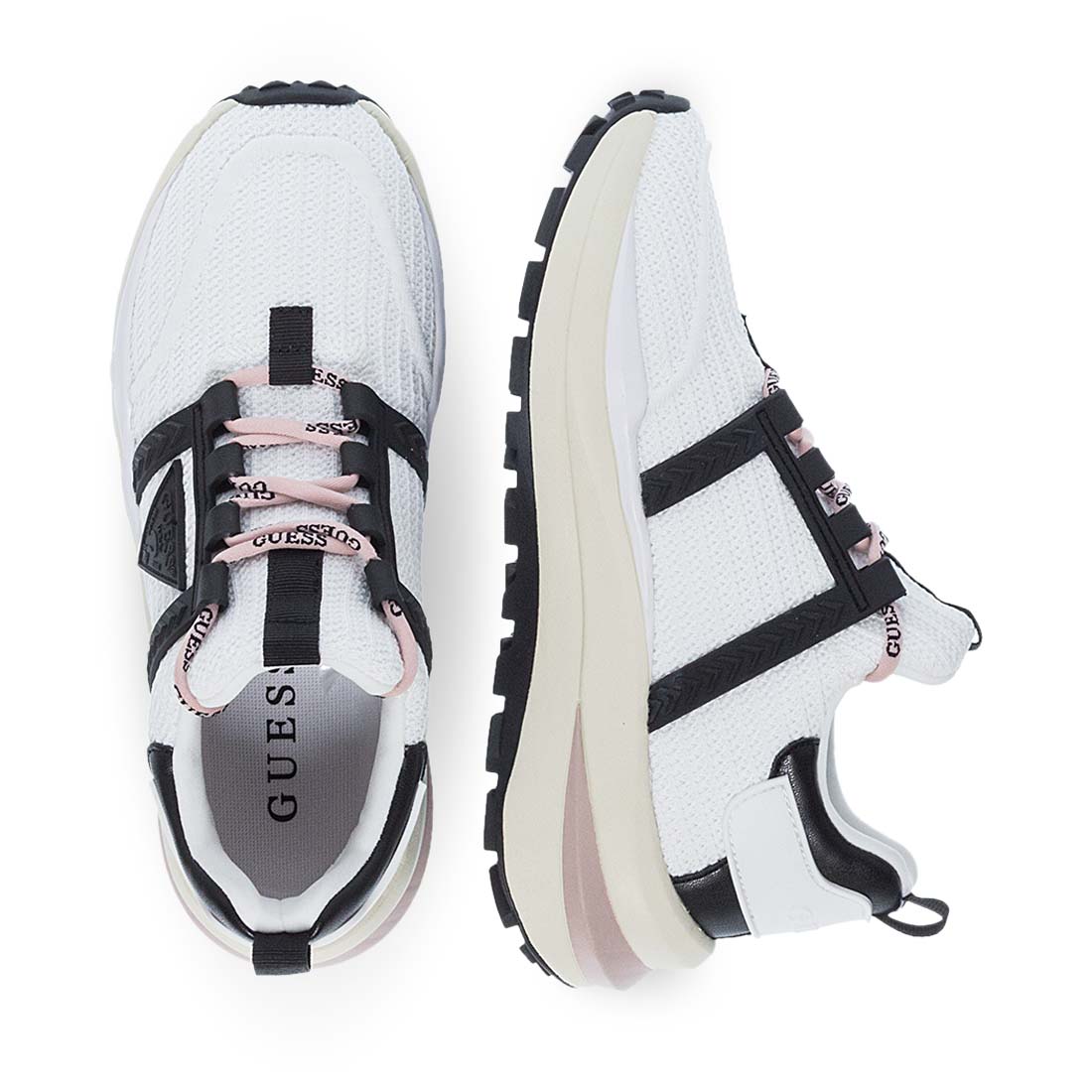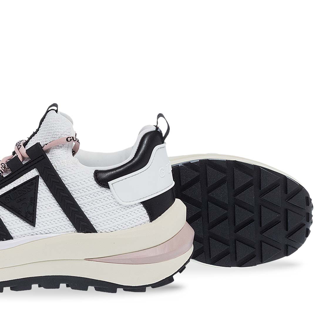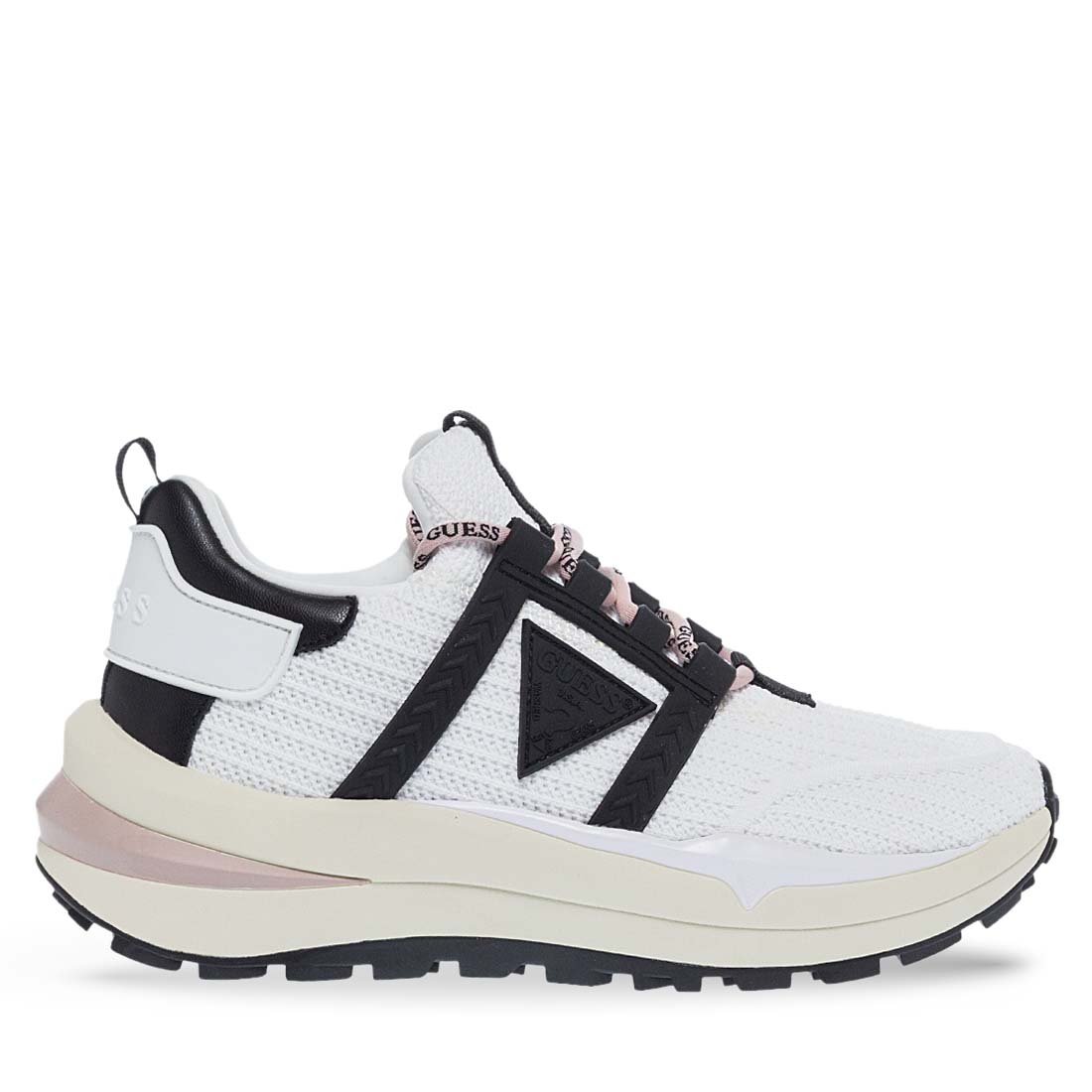 Women''s sneakers by Guess. Follow the trends with this modern pair of sneakers for women by new Guess collection. Available in white color with black details and a black triangle on the side with the logo. Lace-up detail. Made of soft fabric. Comfortable insole and tractor sole. Women''s sneakers by Guess that will look great with your fresh wardrobe.