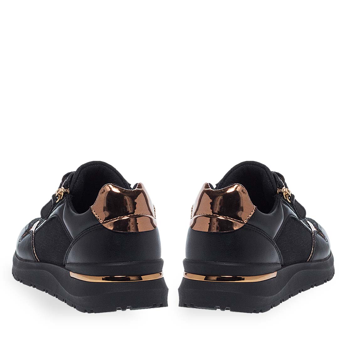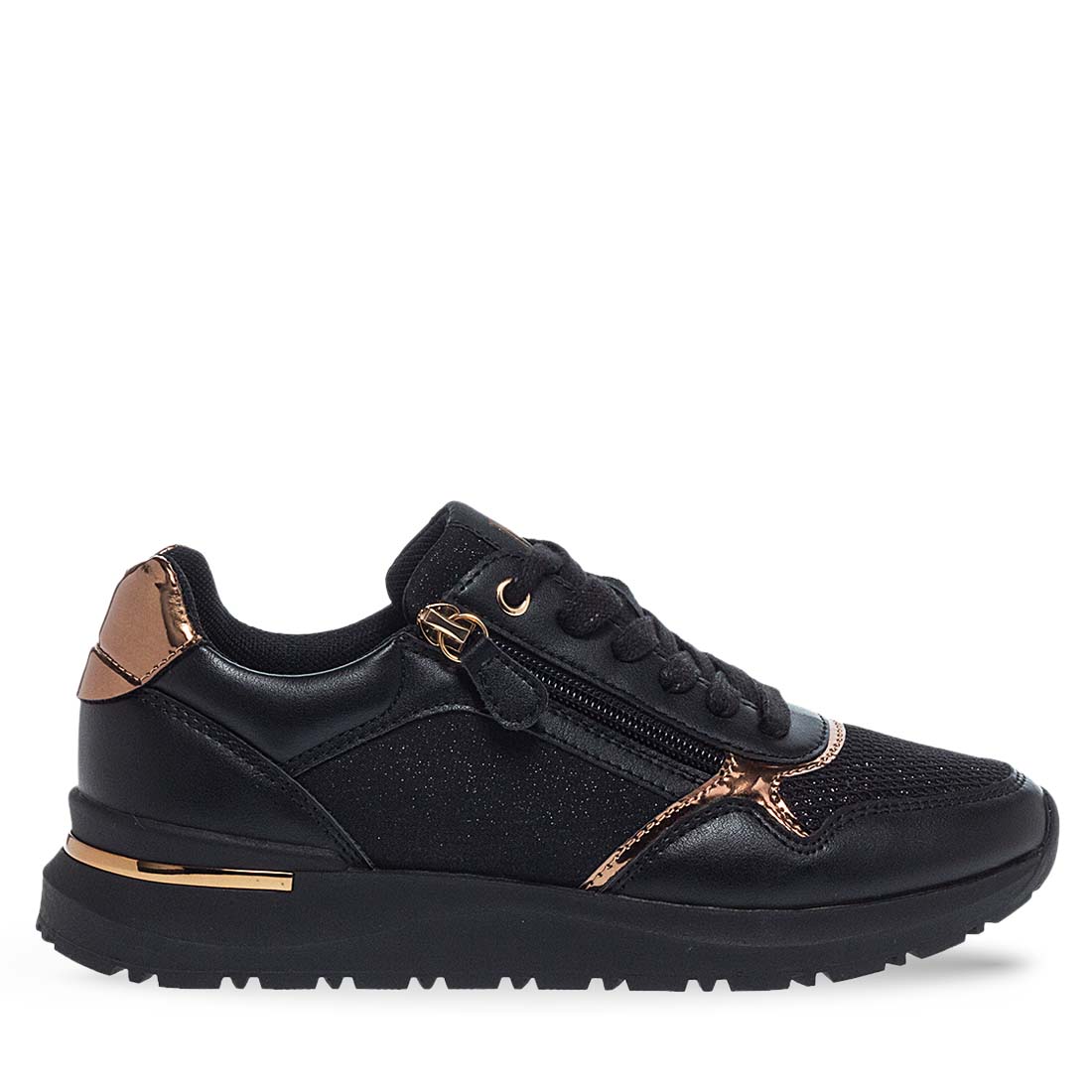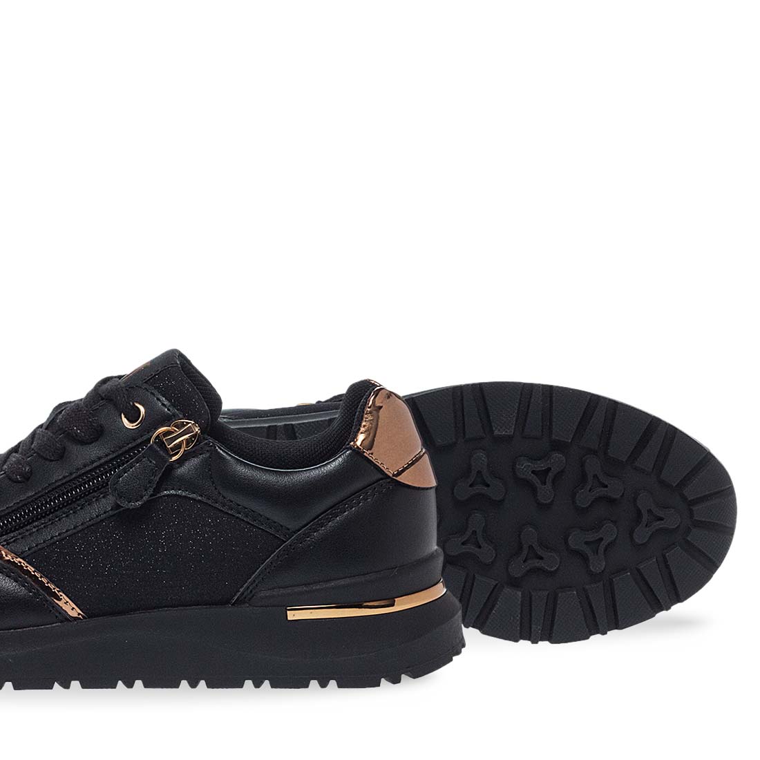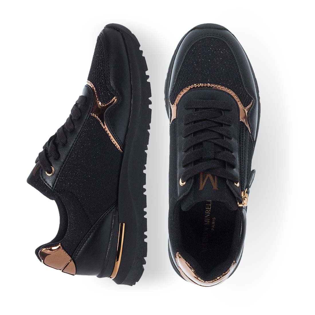 Discover the perfect balance between elegance and durability with these black women''s sneakers by Maison Minrelle. Designed for the modern woman. These sneakers add a touch of discreet luxury to your everyday appearance. Lurex and shinny gold details on top. Lace up design with zip decorative detail.