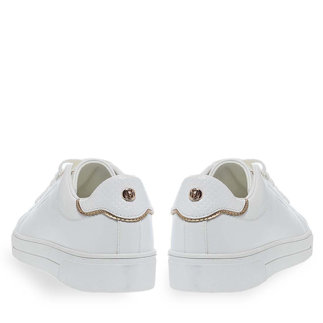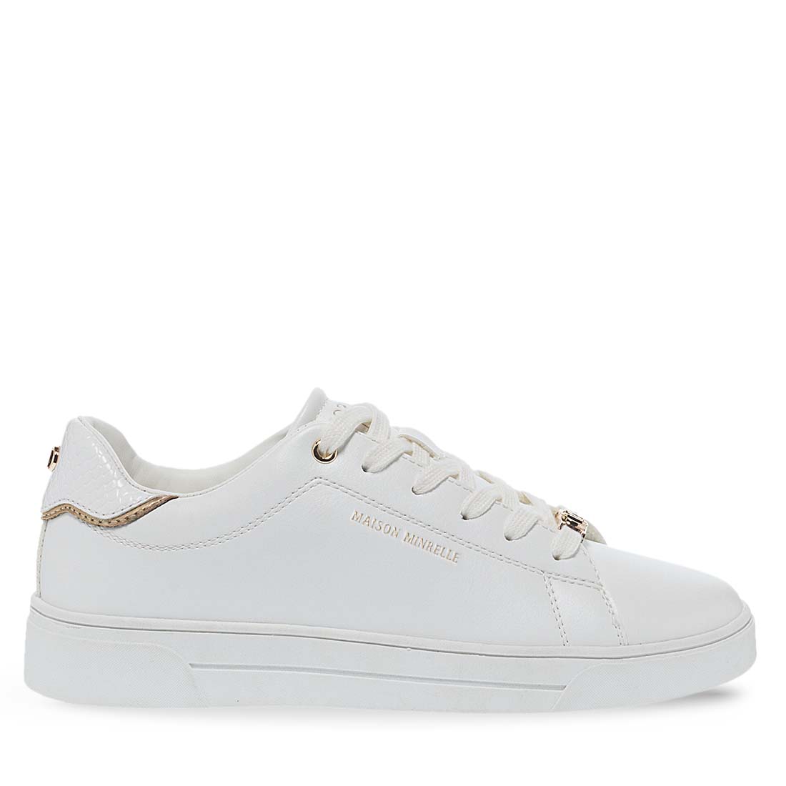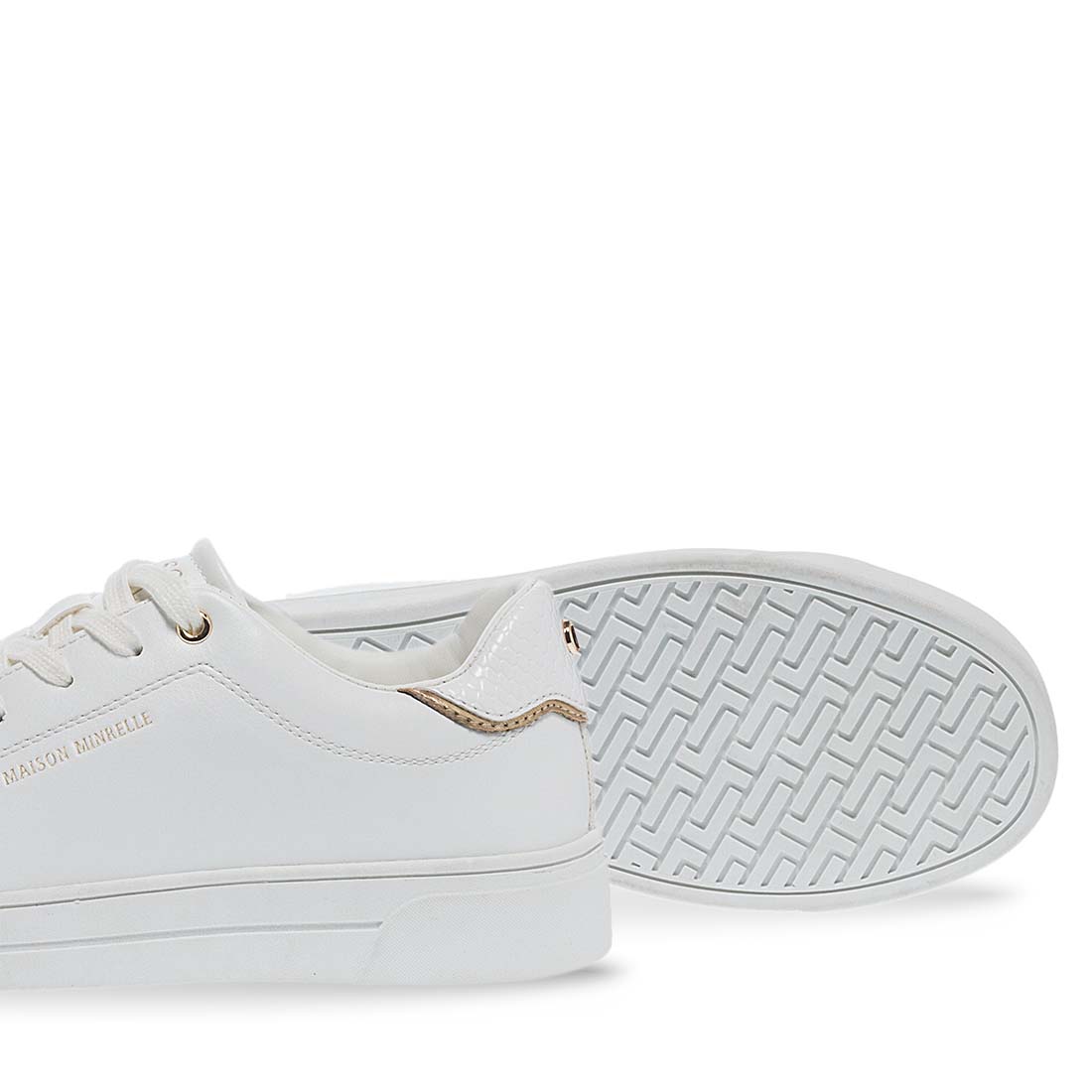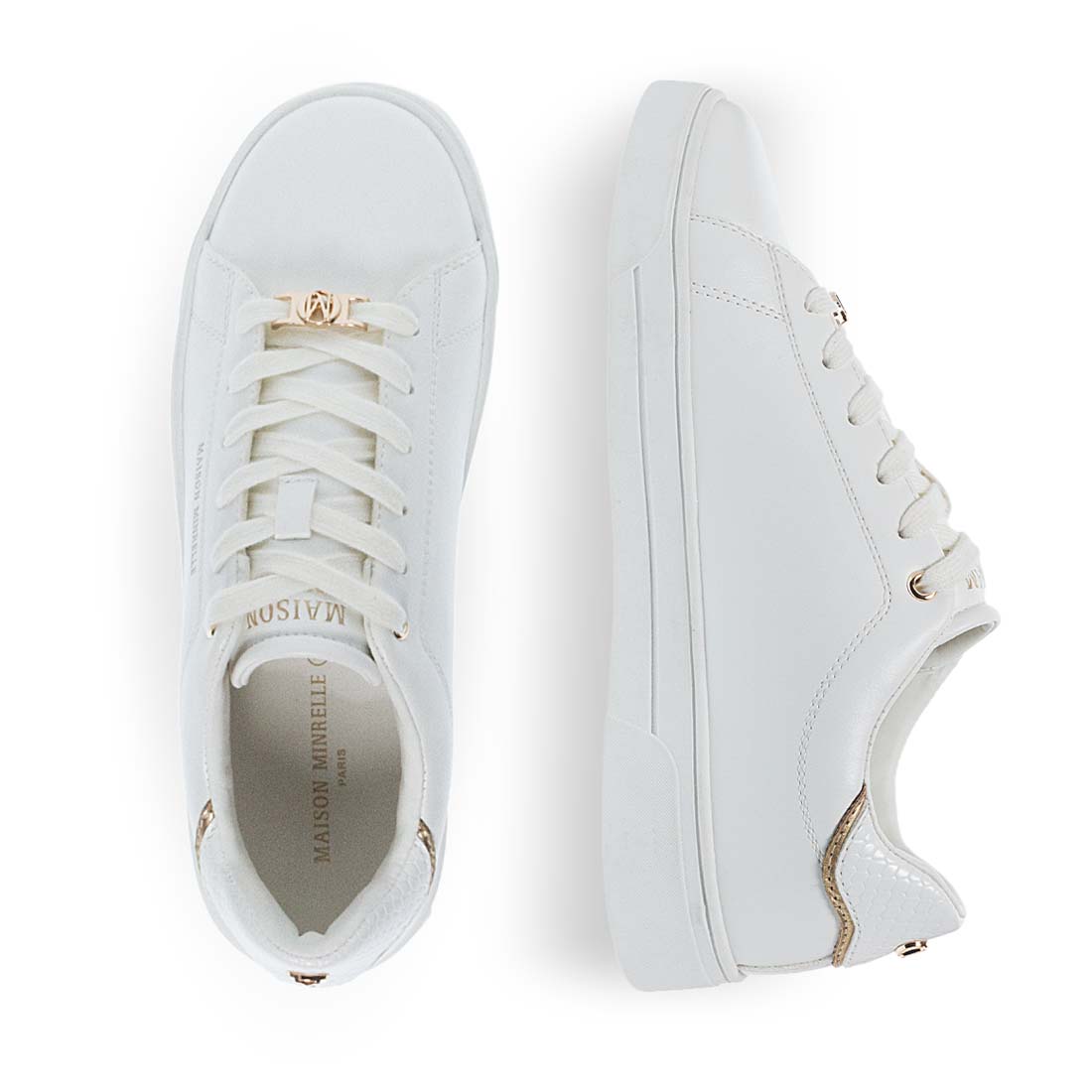 White comfortable sneakers by Maison Minrelle. They have bold exterior stitching and a logo on the side. Very comfortable footbed and stable white non-slip sole. Lace-up detail for easy fit. Modern design.