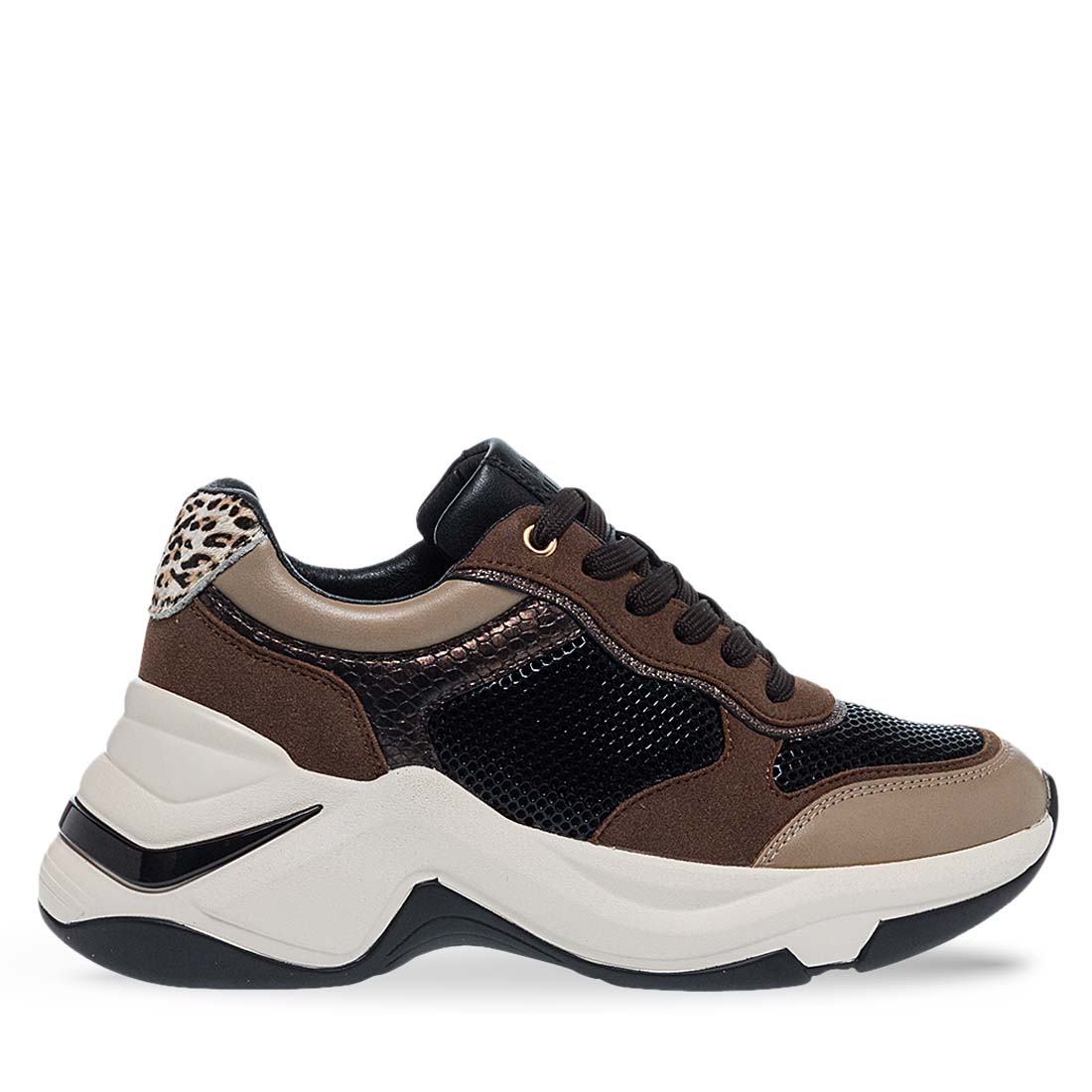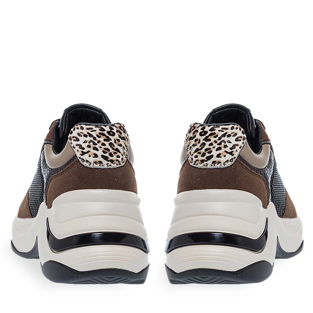 Women''s sneakers by Maison Minrelle. Women’s chunky sneakers in brown & black with animal-print heel.