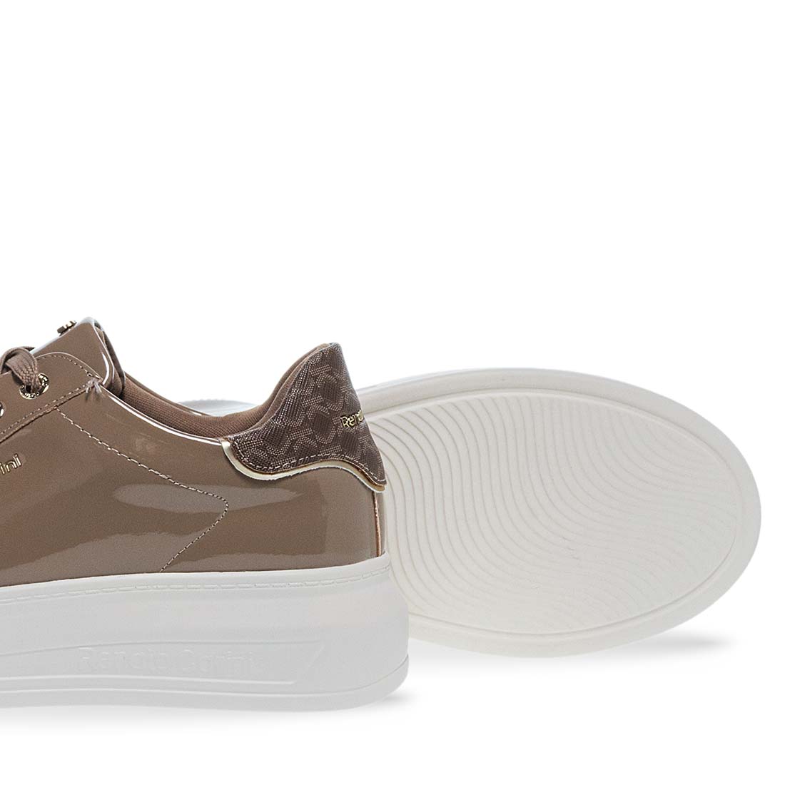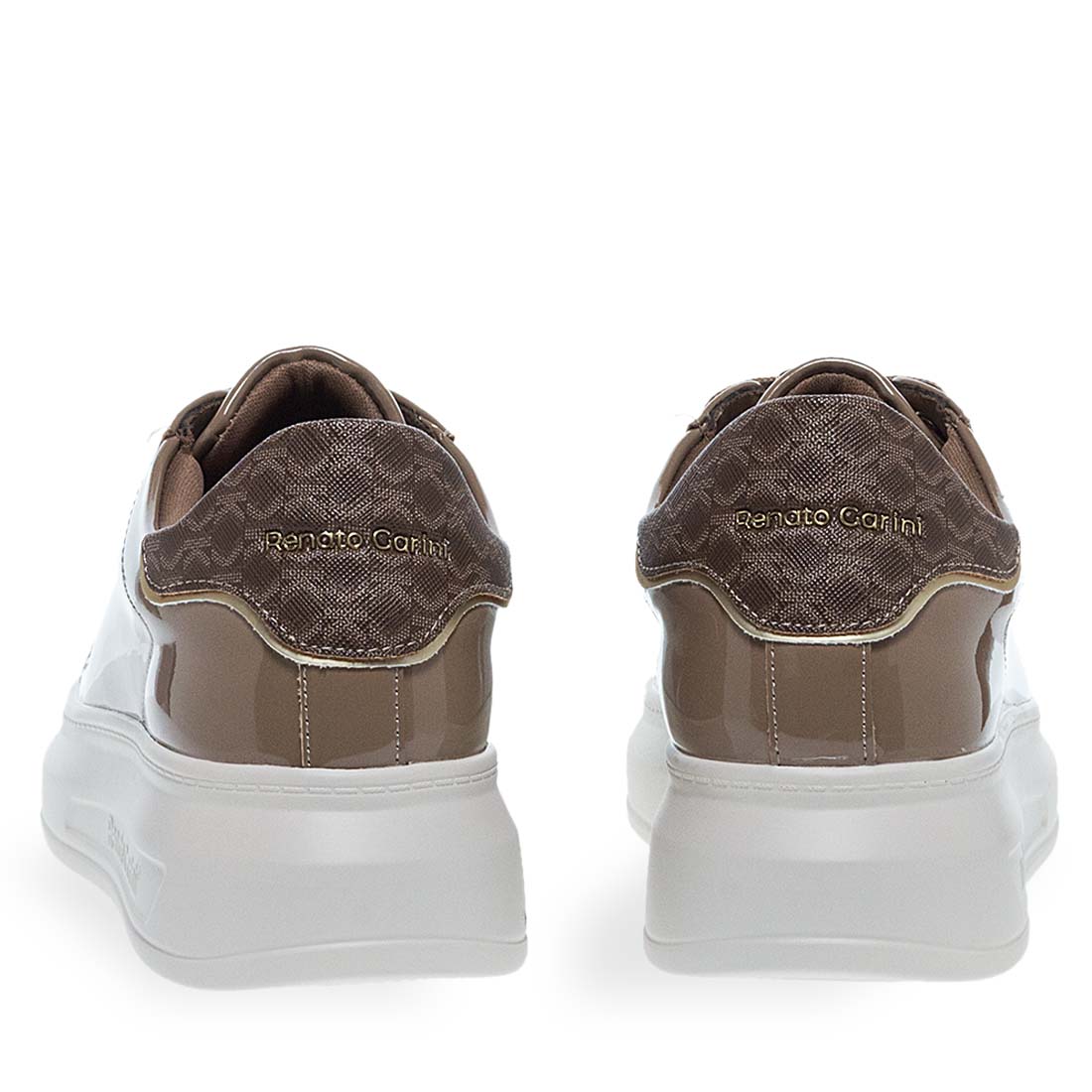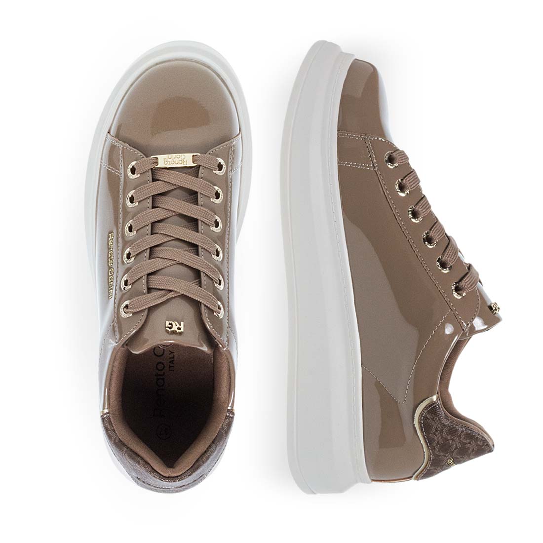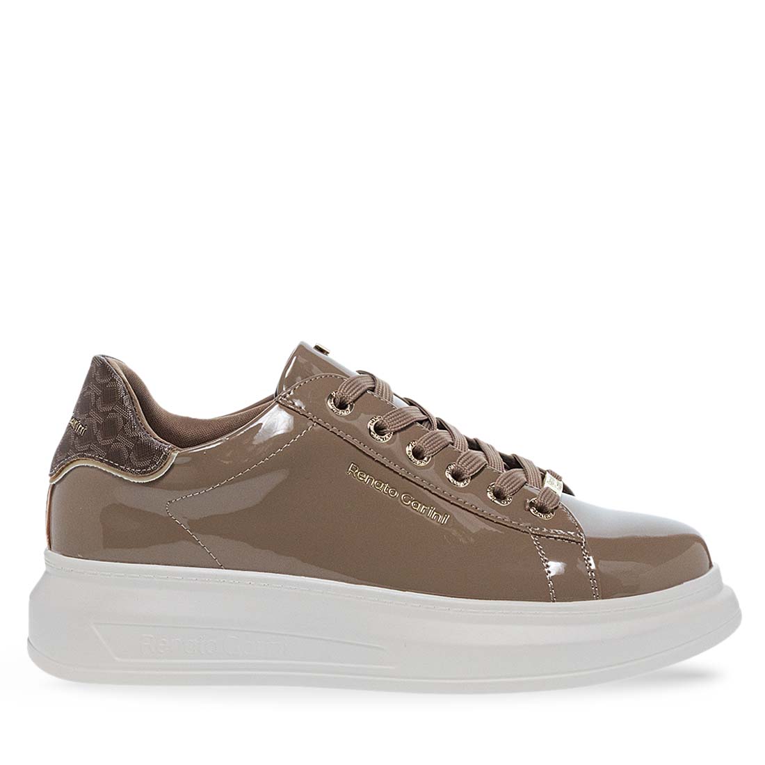 Women''s sneakers by Renato Garini. Brown patent sneakers with white chunky sole and golden details for modern style.