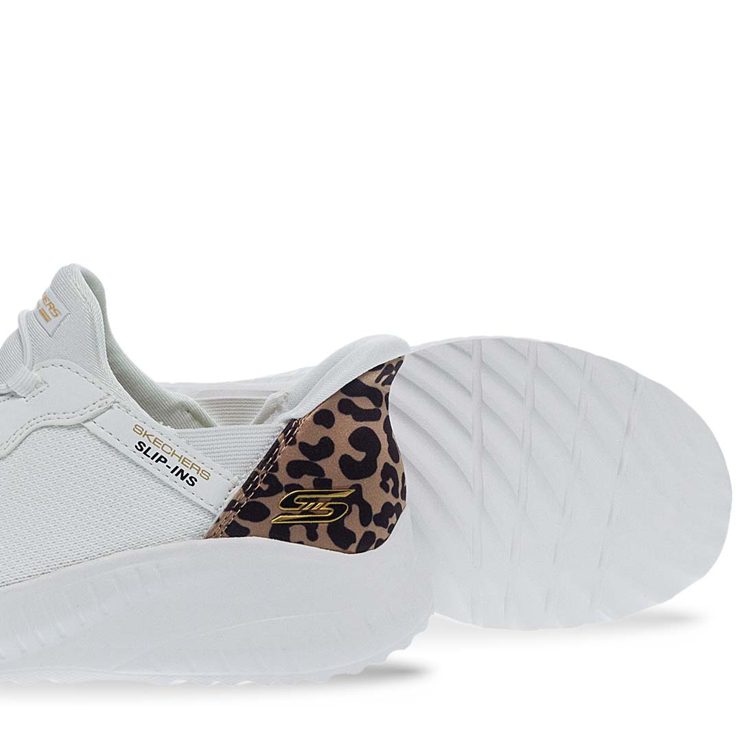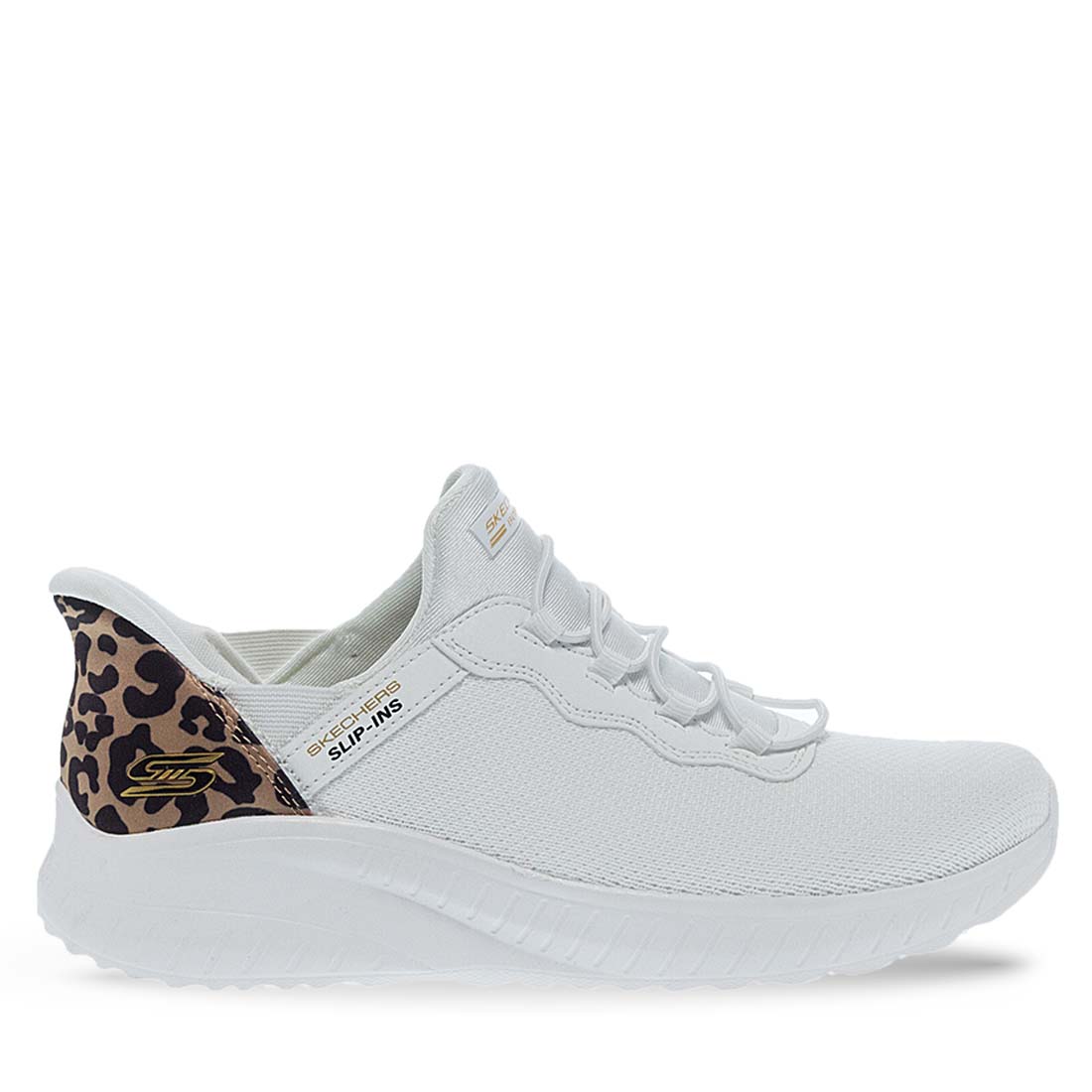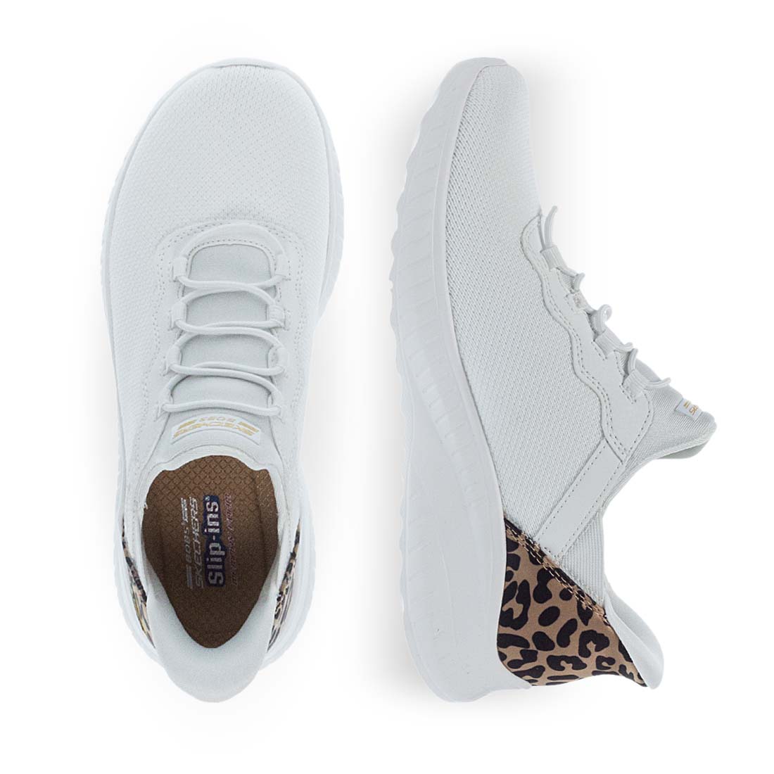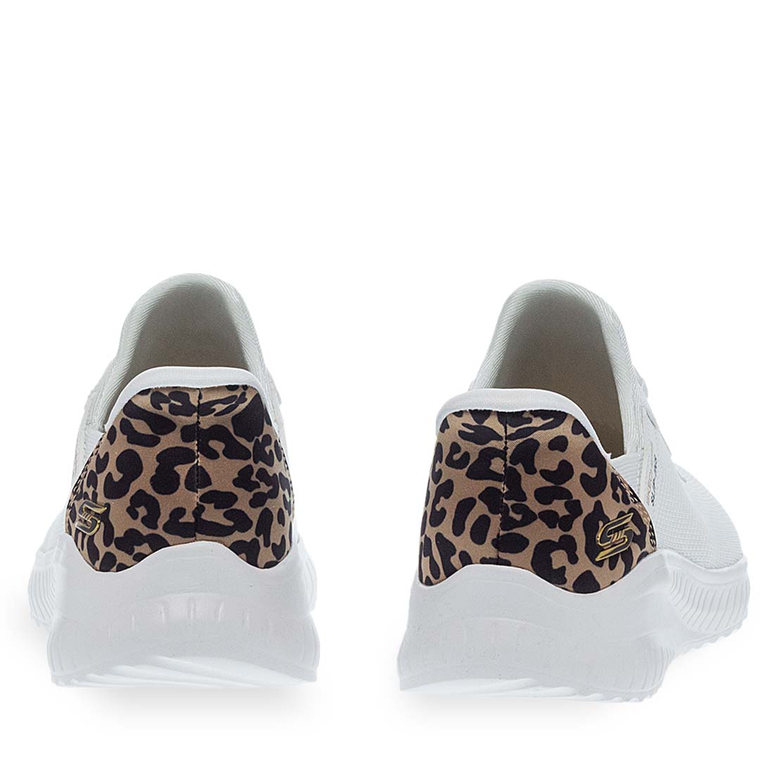 Modern and lightweight trainers by Skechers. Animal print design at the back. Memory foam insole. Elasticated straps. Suitable to use day to night.
