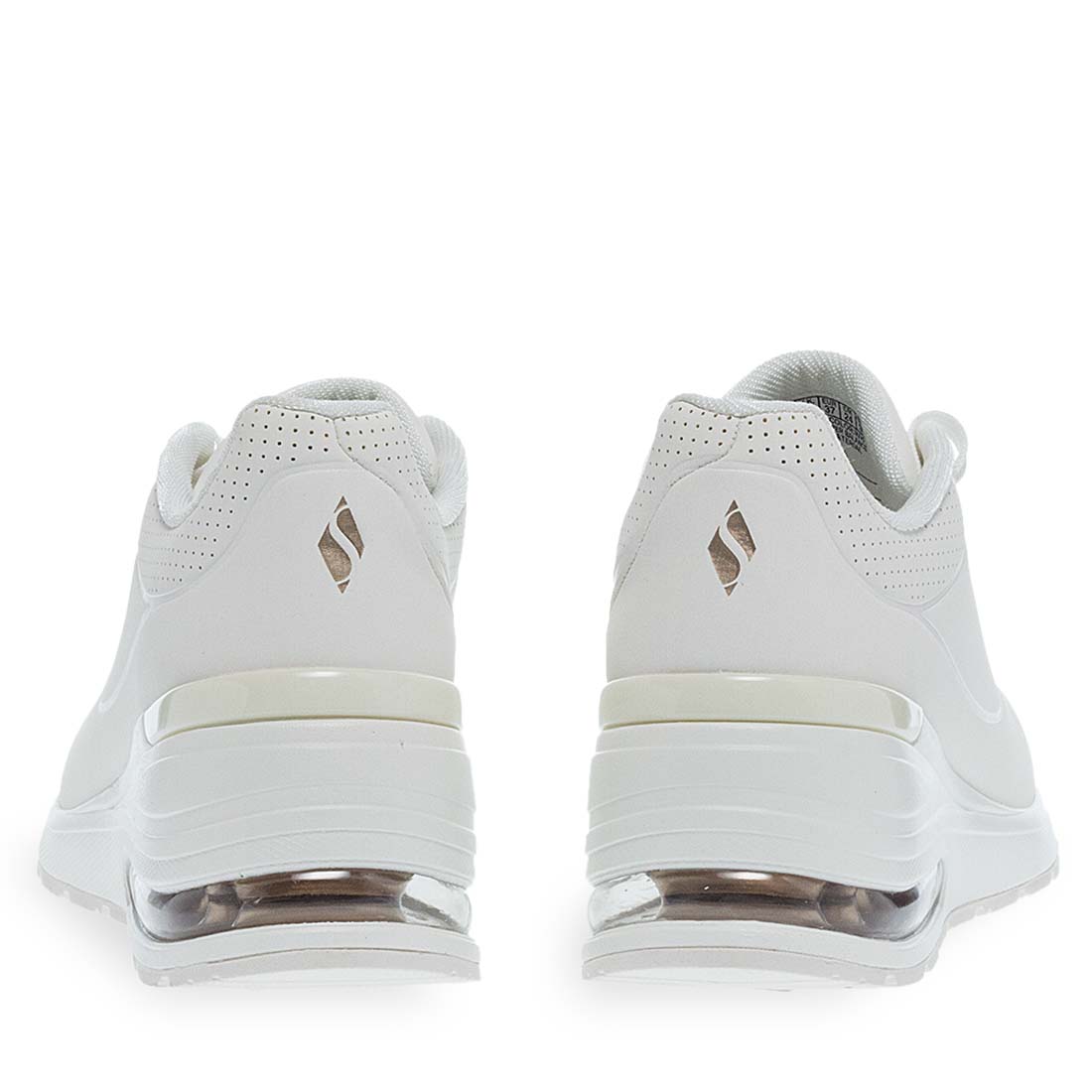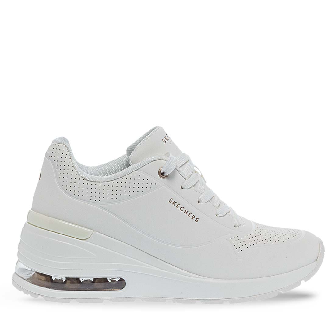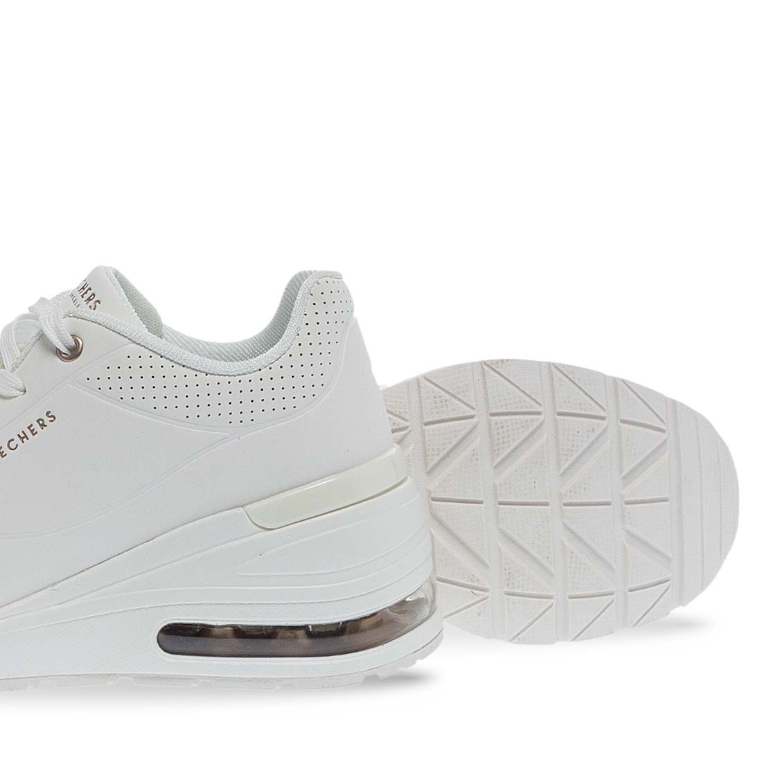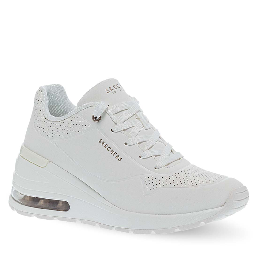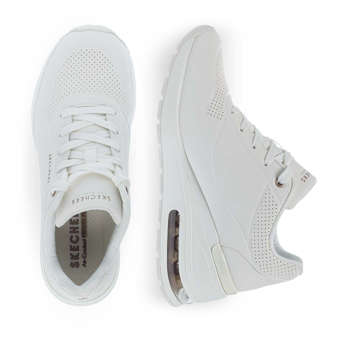 White comfortable sneakers for women by Skechers. Made of synthetic leather and fabric. Logo on the side and Air cooled sole. Lace up design. Memory foam insole. Wear yours all day without pain.